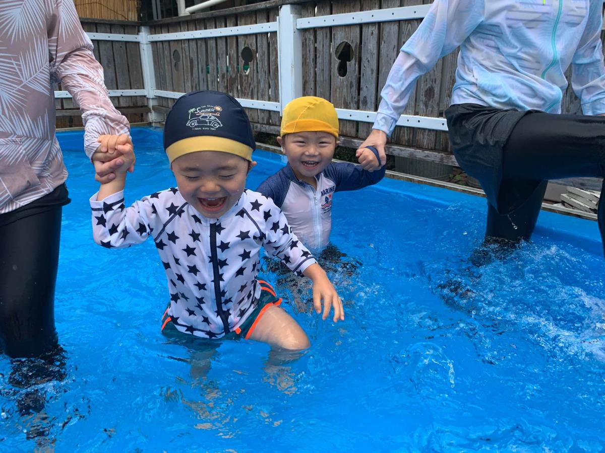 自分の出席帳にシールを貼ります。 貼り終えたら、あそび・学びの時間です。 おりがみ制作や絵の具あそび・お絵描きやブロック遊び、園庭遊びやお散歩に出かけたり・・・ 夏になるとデッキがプールに早変わり!園庭にも丸いプールが出ます。 いっぱいあそんで、いっぱい学びましょう☆ |