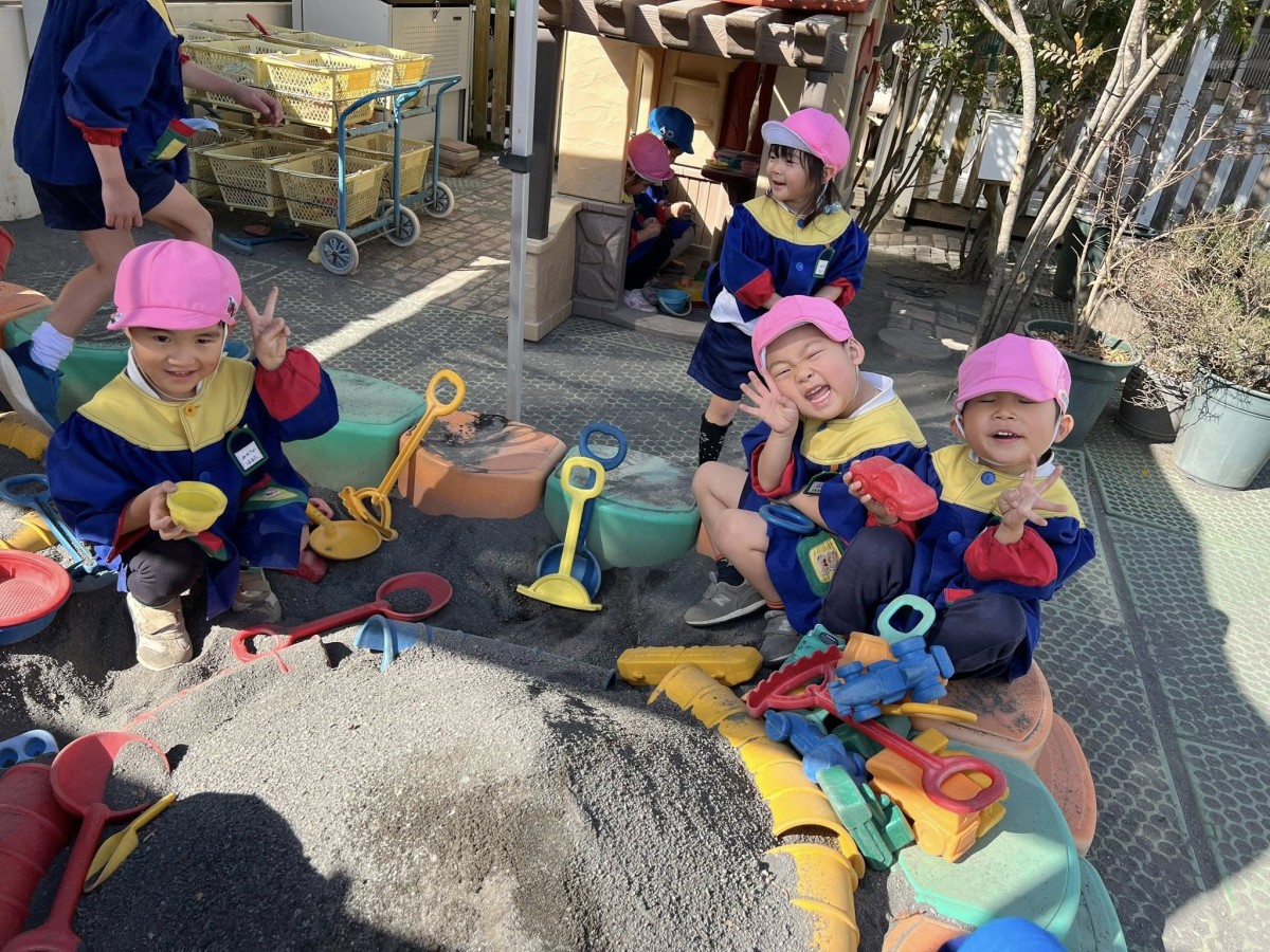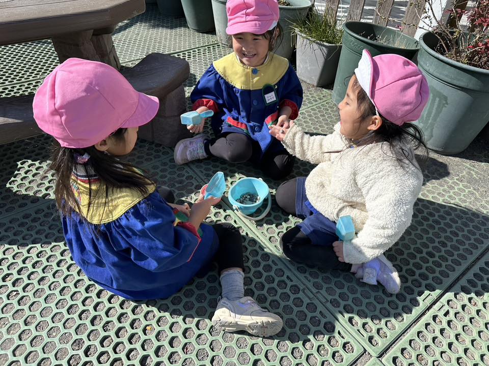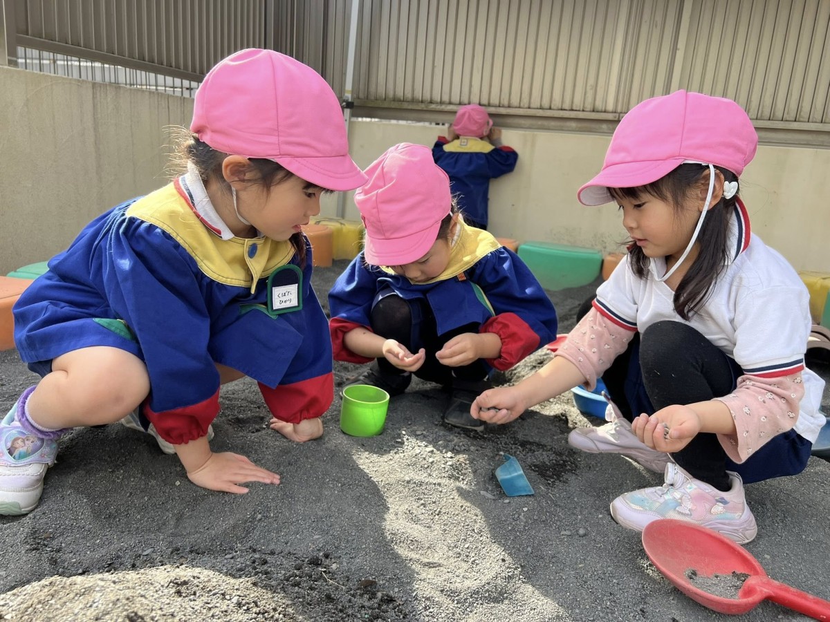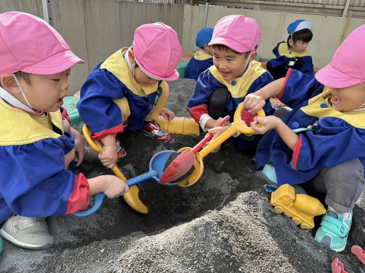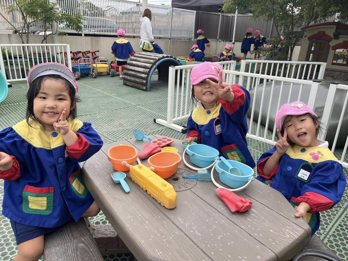 今日はオペレッタの練習をしてから、パッチンブロックで遊びました。保育士がバッグを作ってあげると、嬉しそうにお人形を入れてお散歩したり、同じものを作ろうと真剣なお友だちもいました。午後は園庭で遊びました。大きなお山を作ろうと、友だちと協力して作っていました。