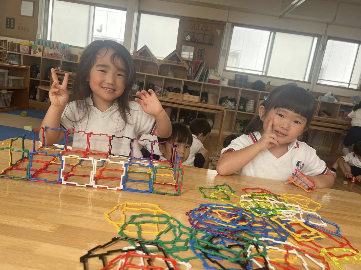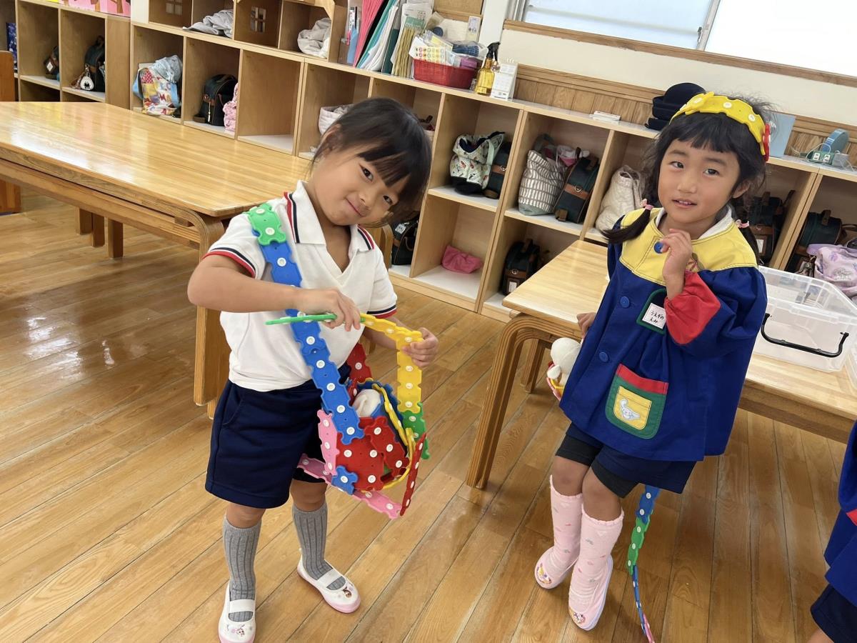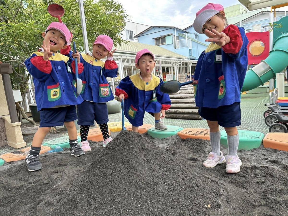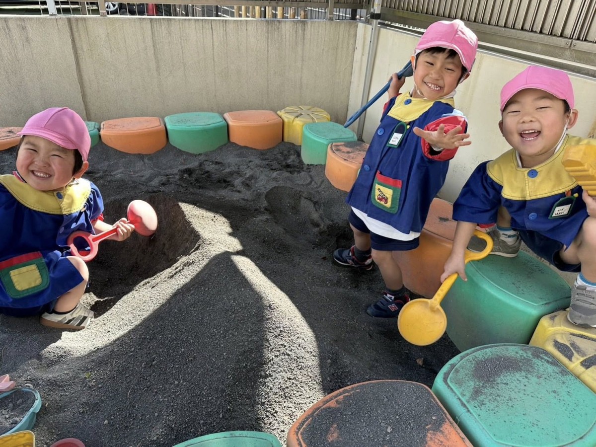 今日はオペレッタの練習をしてから、パッチンブロックで遊びました。保育士がバッグを作ってあげると、嬉しそうにお人形を入れてお散歩したり、同じものを作ろうと真剣なお友だちもいました。午後は園庭で遊びました。大きなお山を作ろうと、友だちと協力して作っていました。