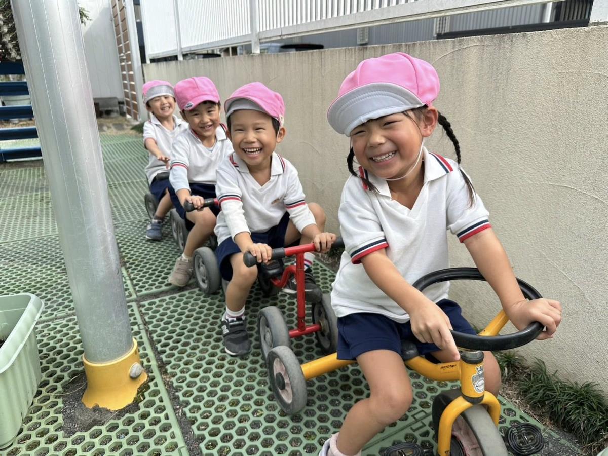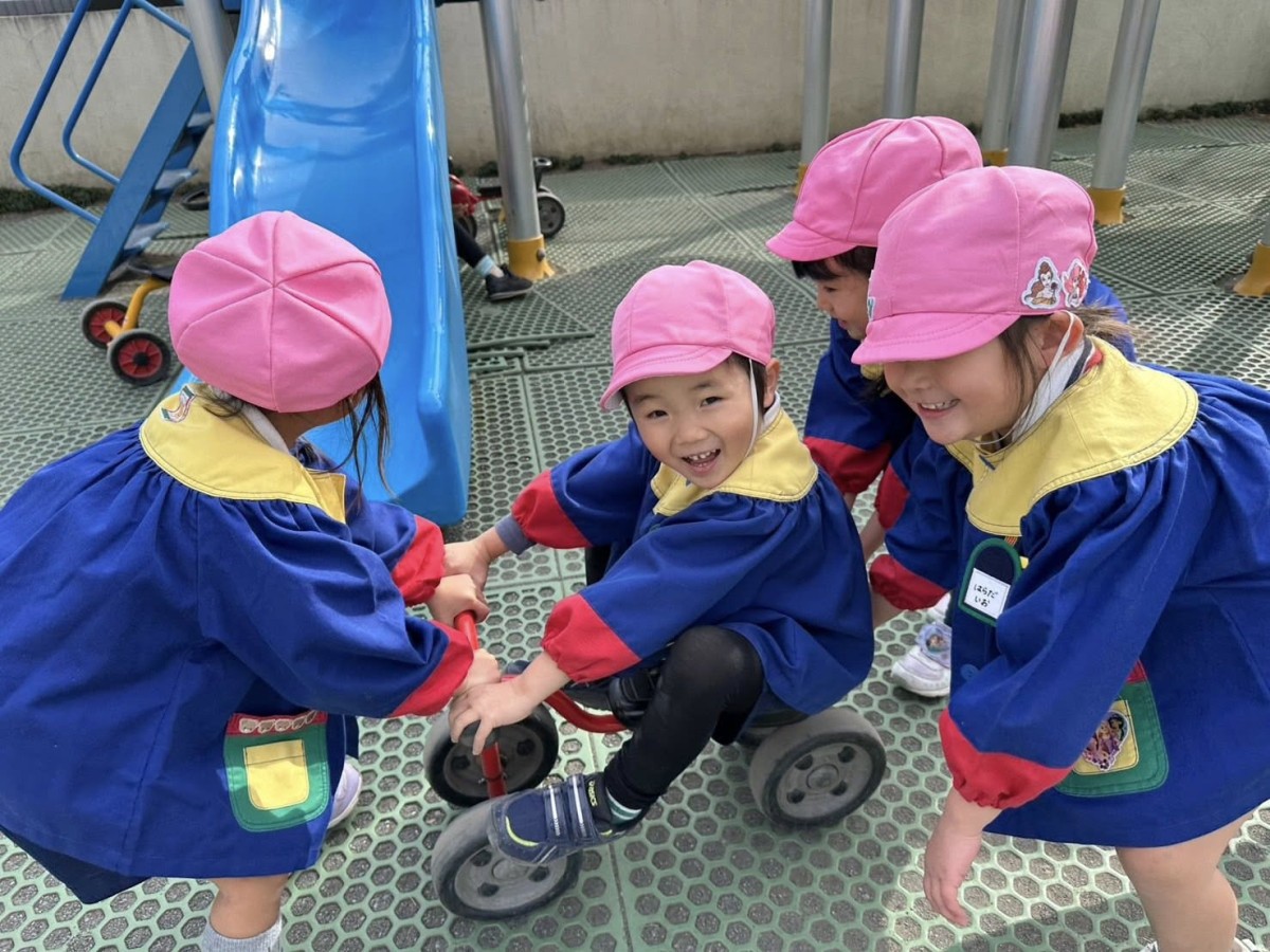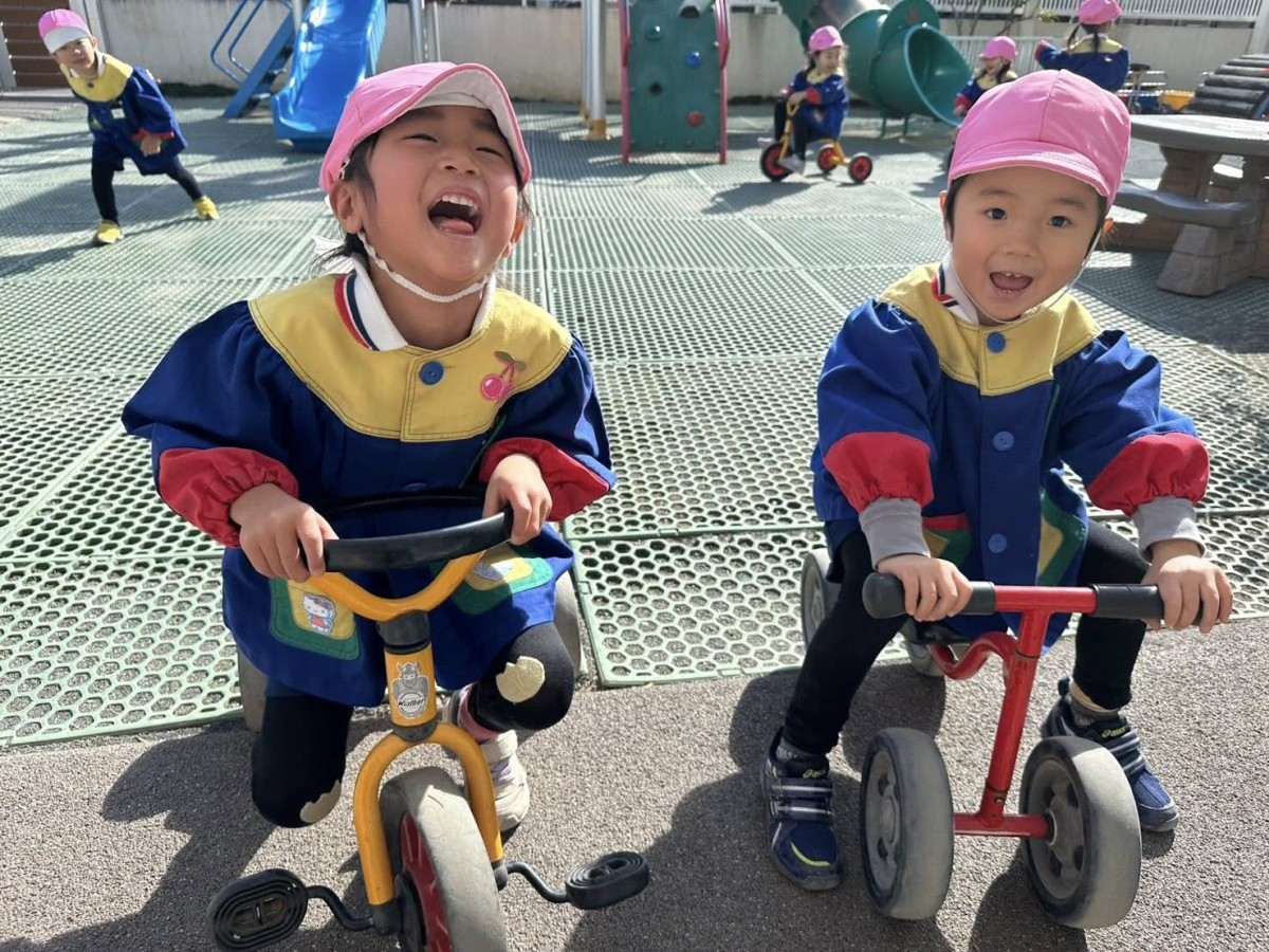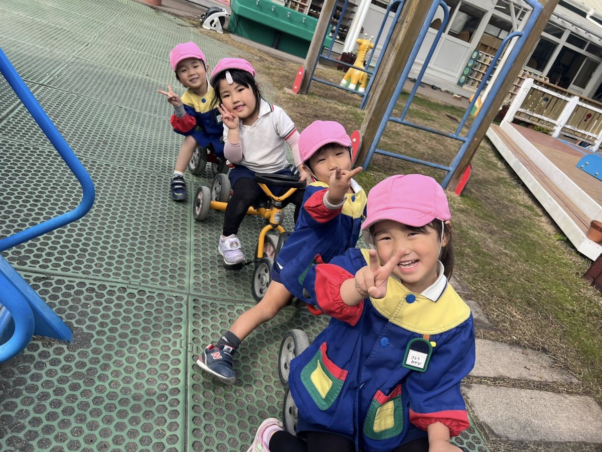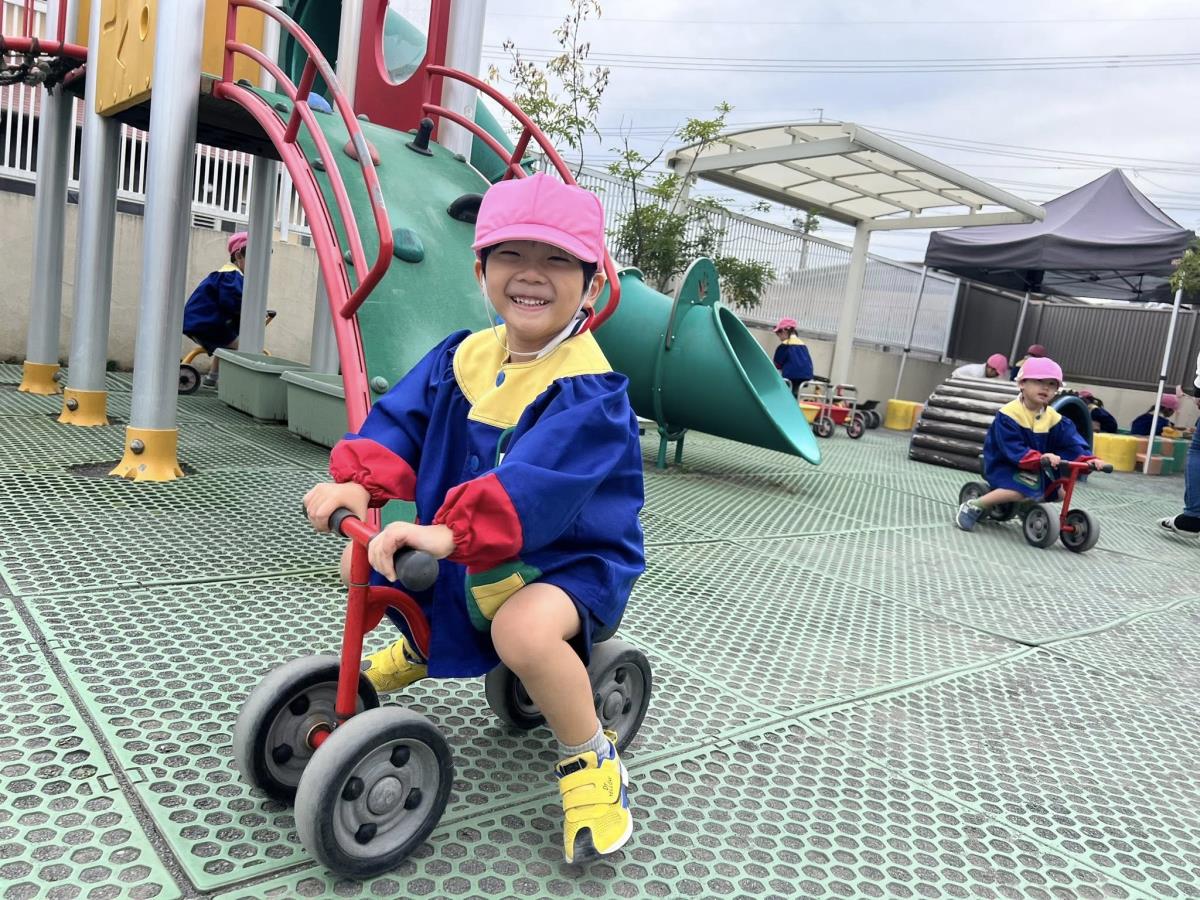 | 園庭で遊びました。三輪車を漕げるお友だちが増え、成長を感じます。友だちと、「信号が赤でーす!止まってくださーい」など遊びに夢中です。 |