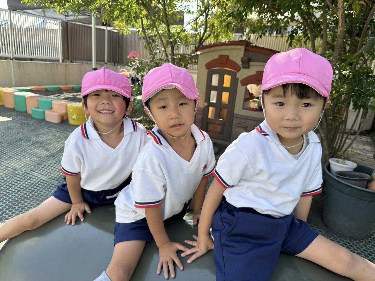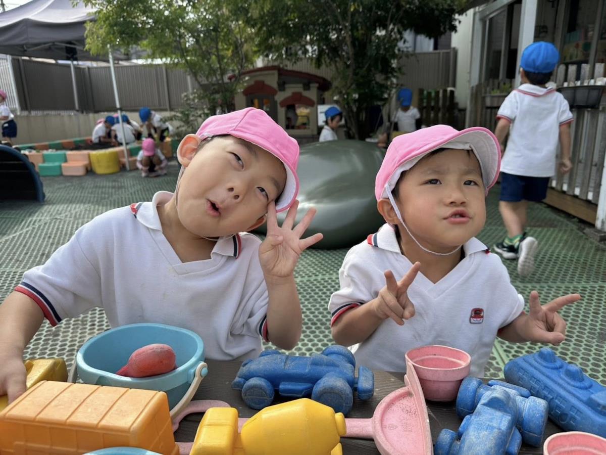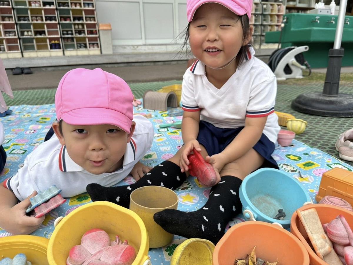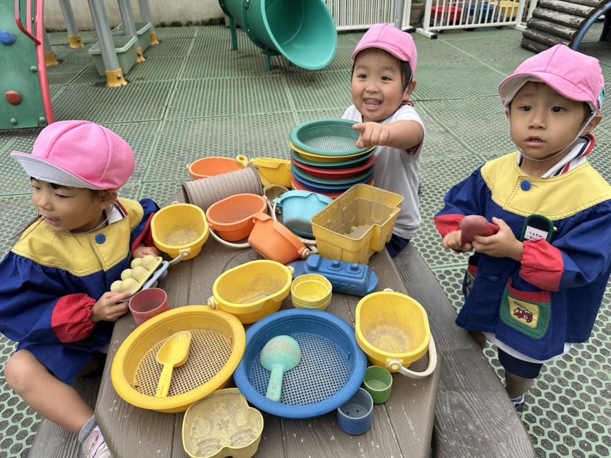 今日は園庭で遊びました。遊んでいると汗びっしょりなもも組さん。お茶休憩をこまめにしたり、パラソルの下でおしゃべりしたりしながら過ごしていました。その後は午睡をする子、お部屋でゆったりと遊ぶ子、それぞれの時間を過ごしています。