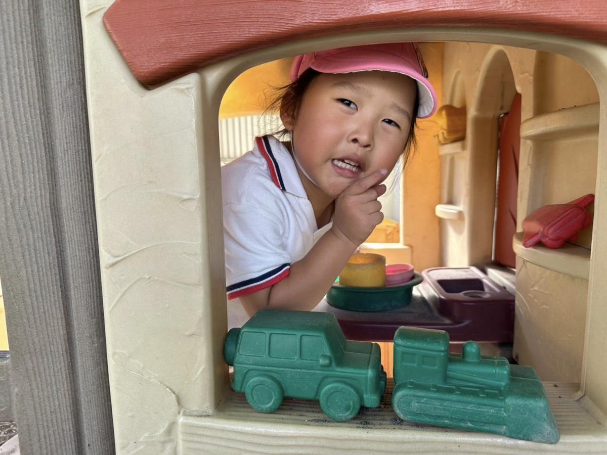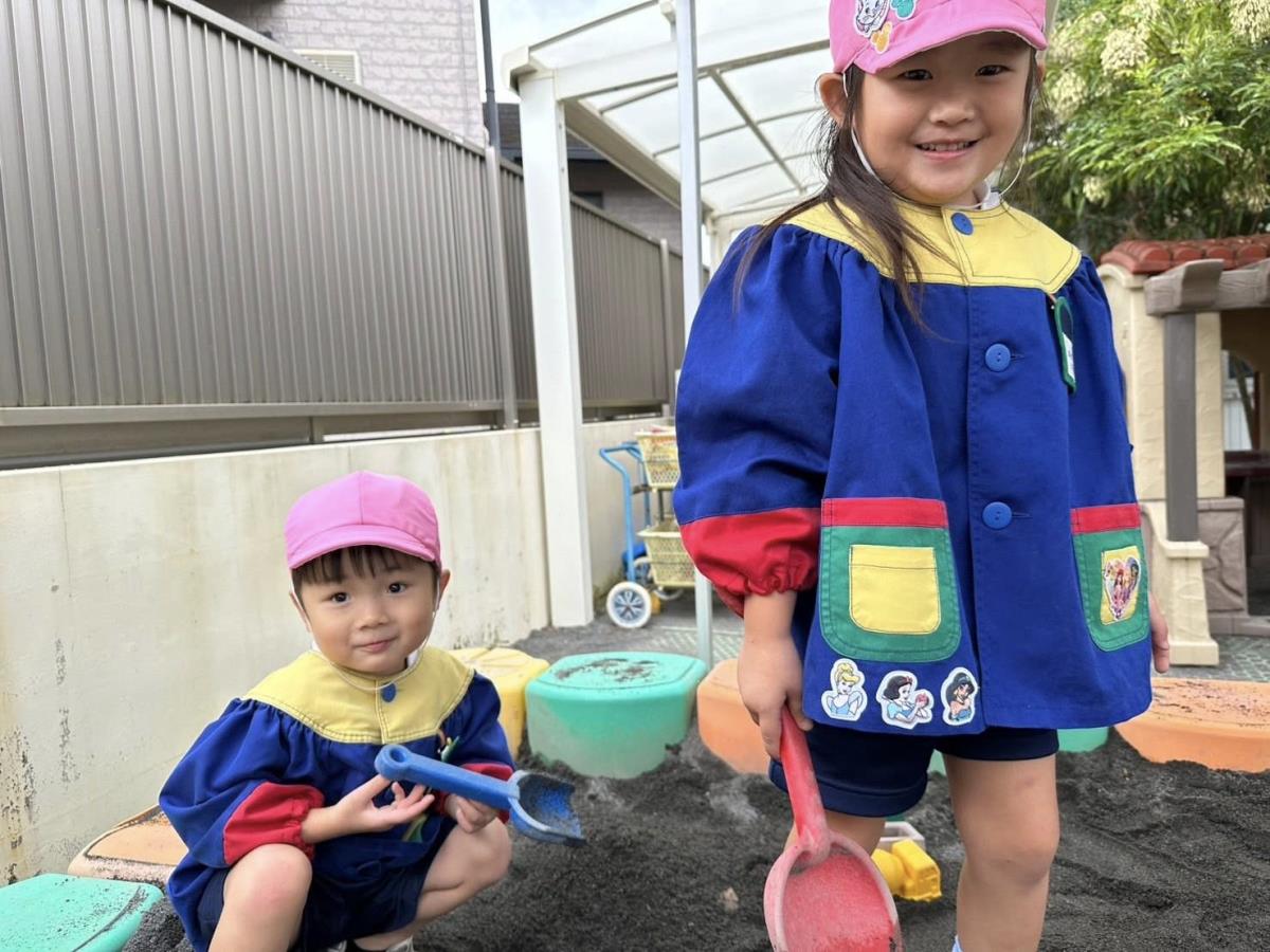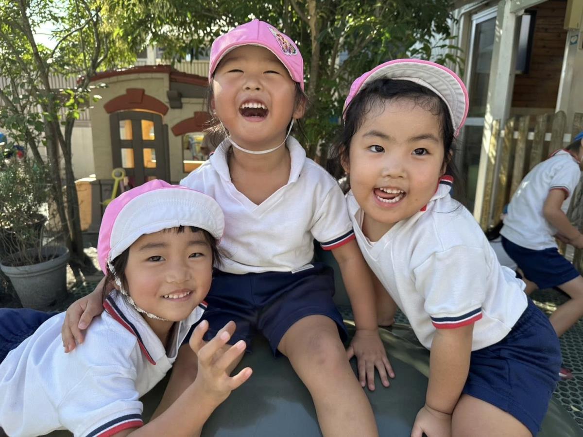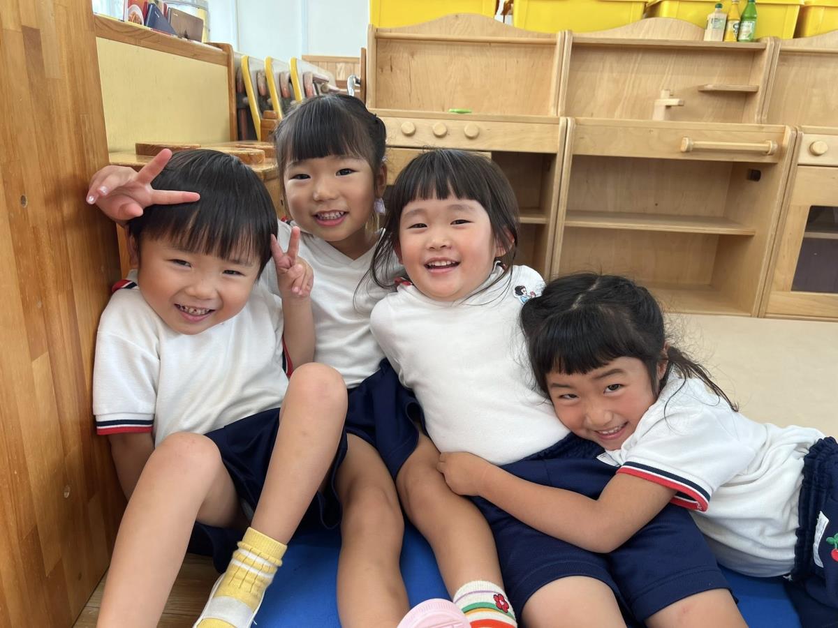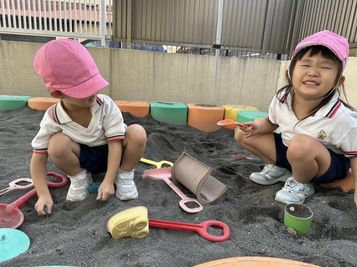 今日は園庭で遊びました。遊んでいると汗びっしょりなもも組さん。お茶休憩をこまめにしたり、パラソルの下でおしゃべりしたりしながら過ごしていました。その後は午睡をする子、お部屋でゆったりと遊ぶ子、それぞれの時間を過ごしています。