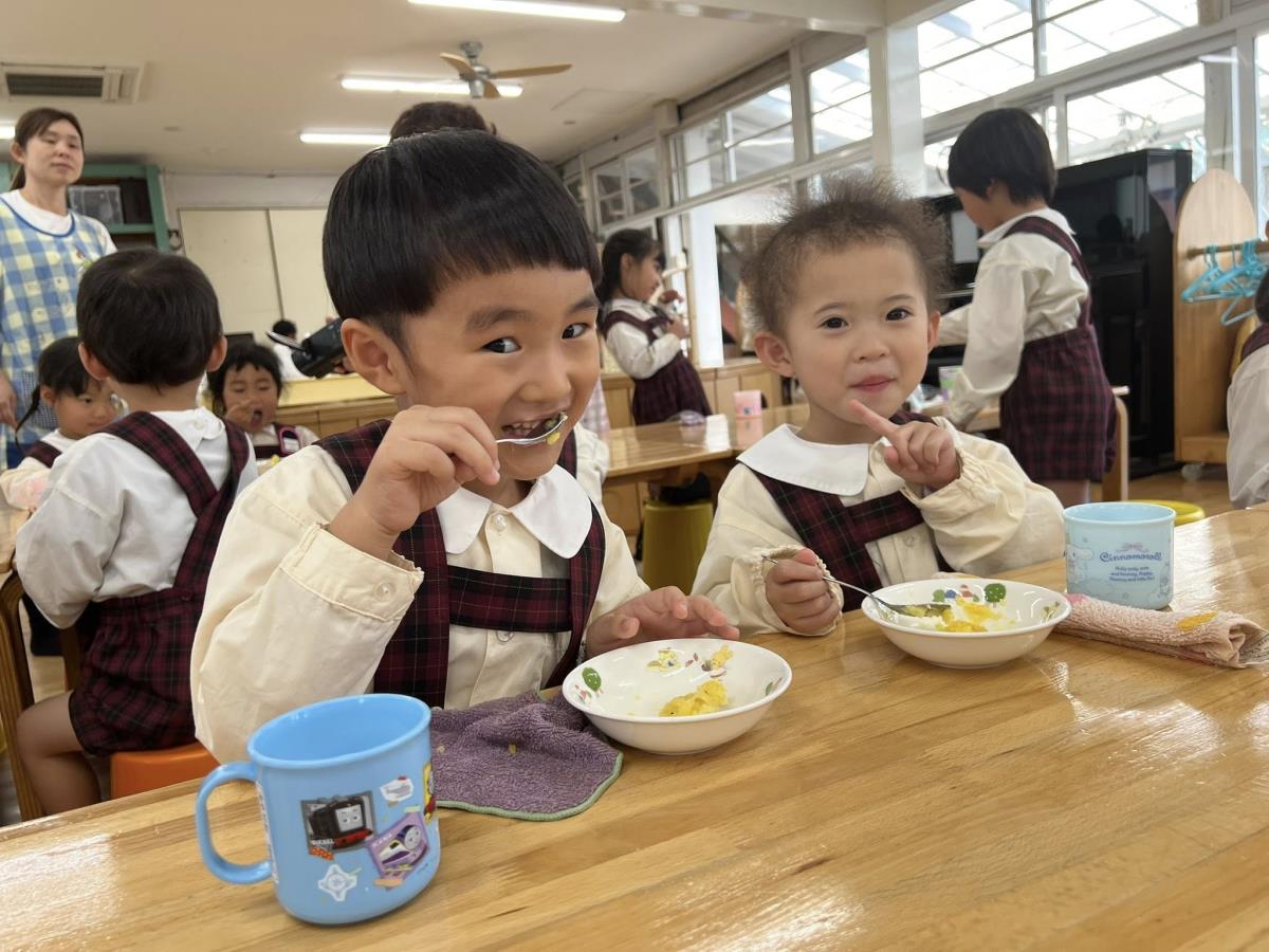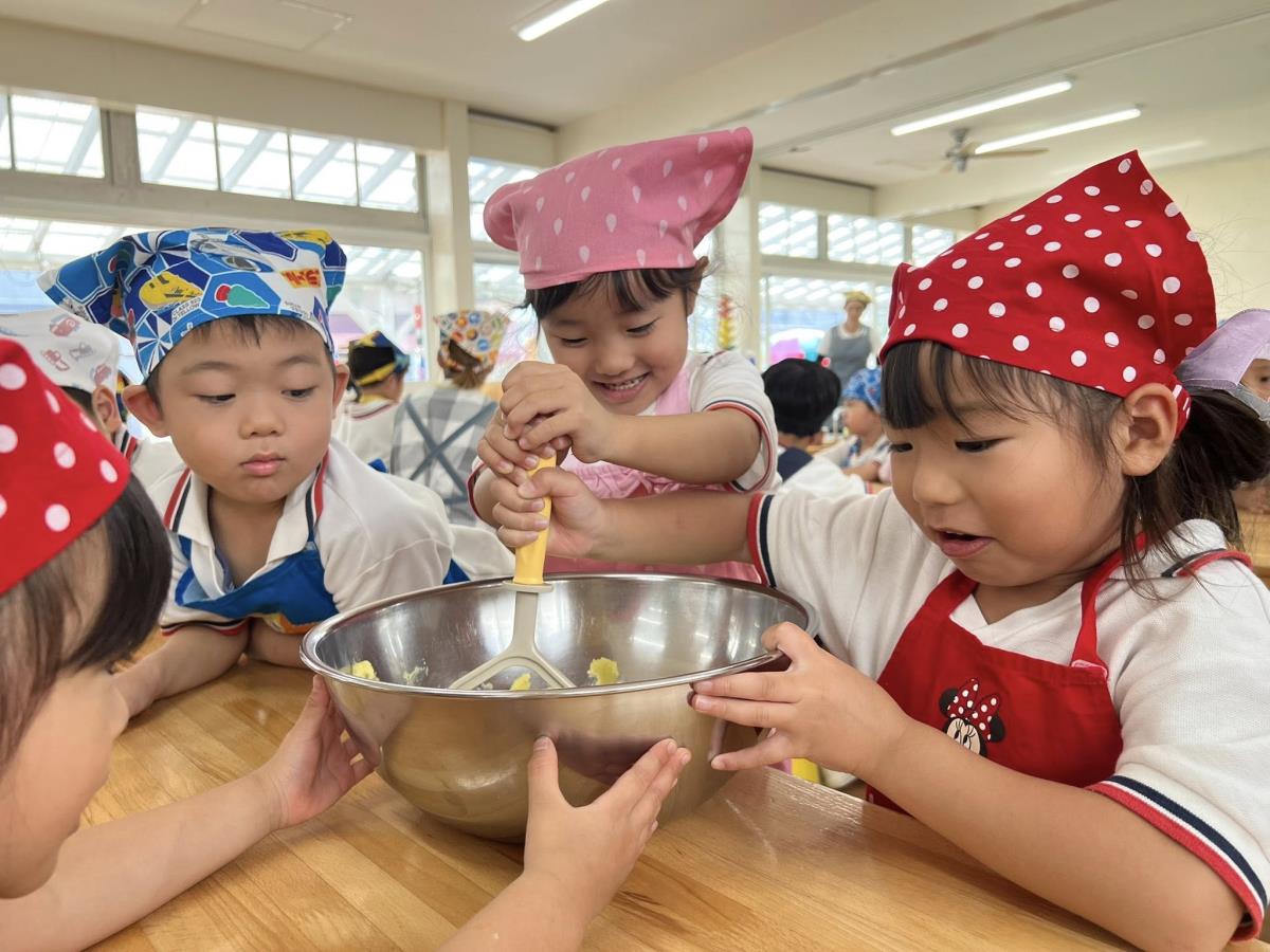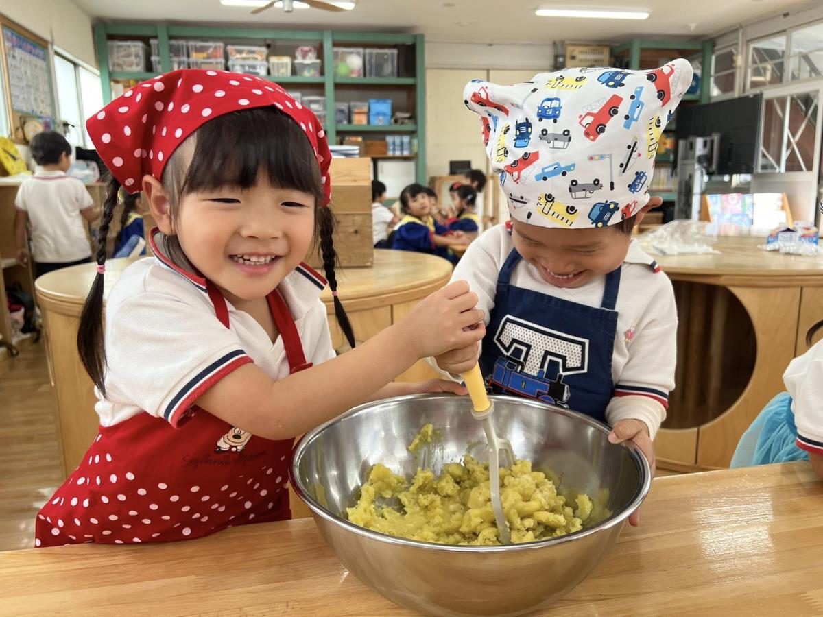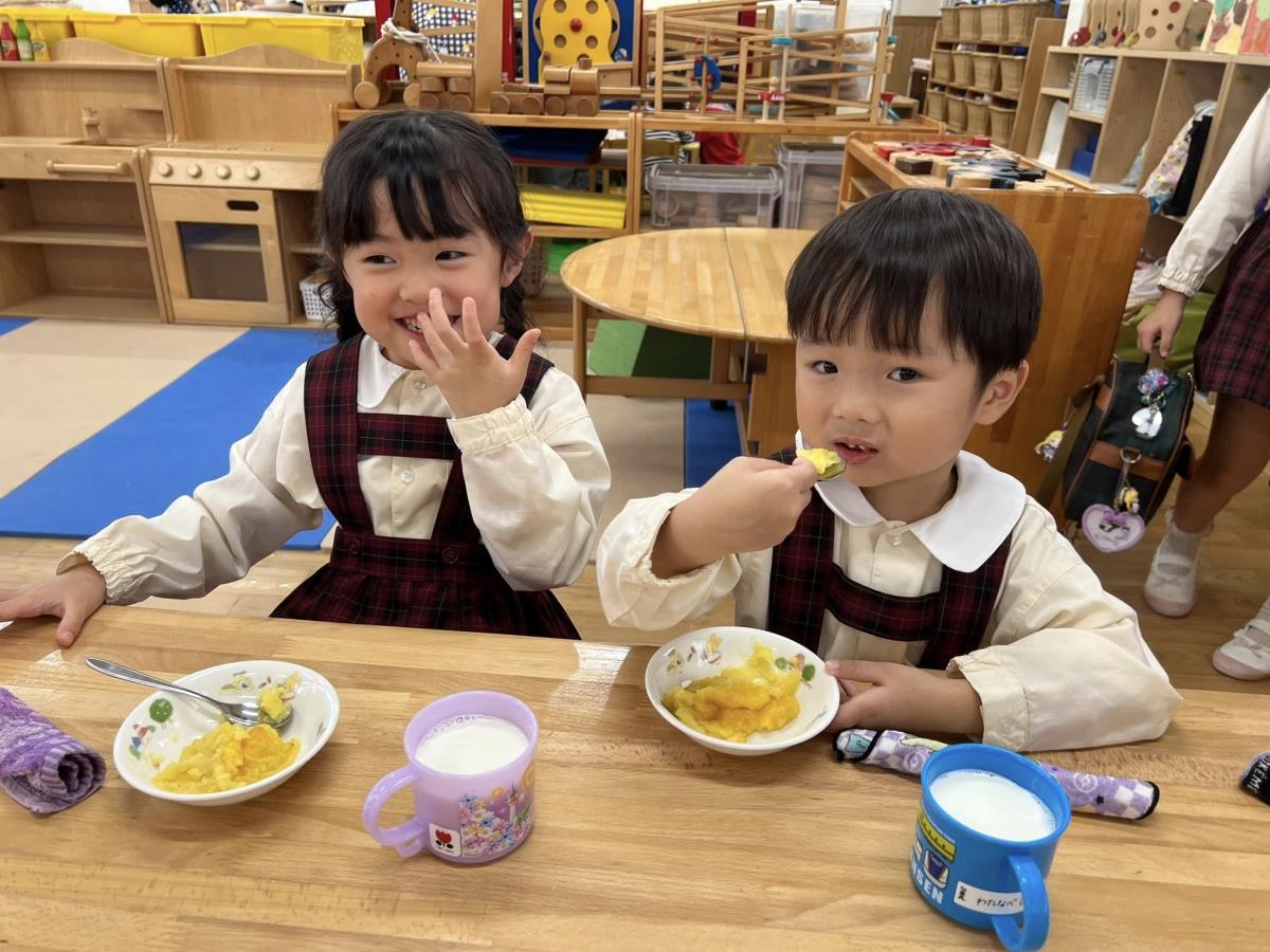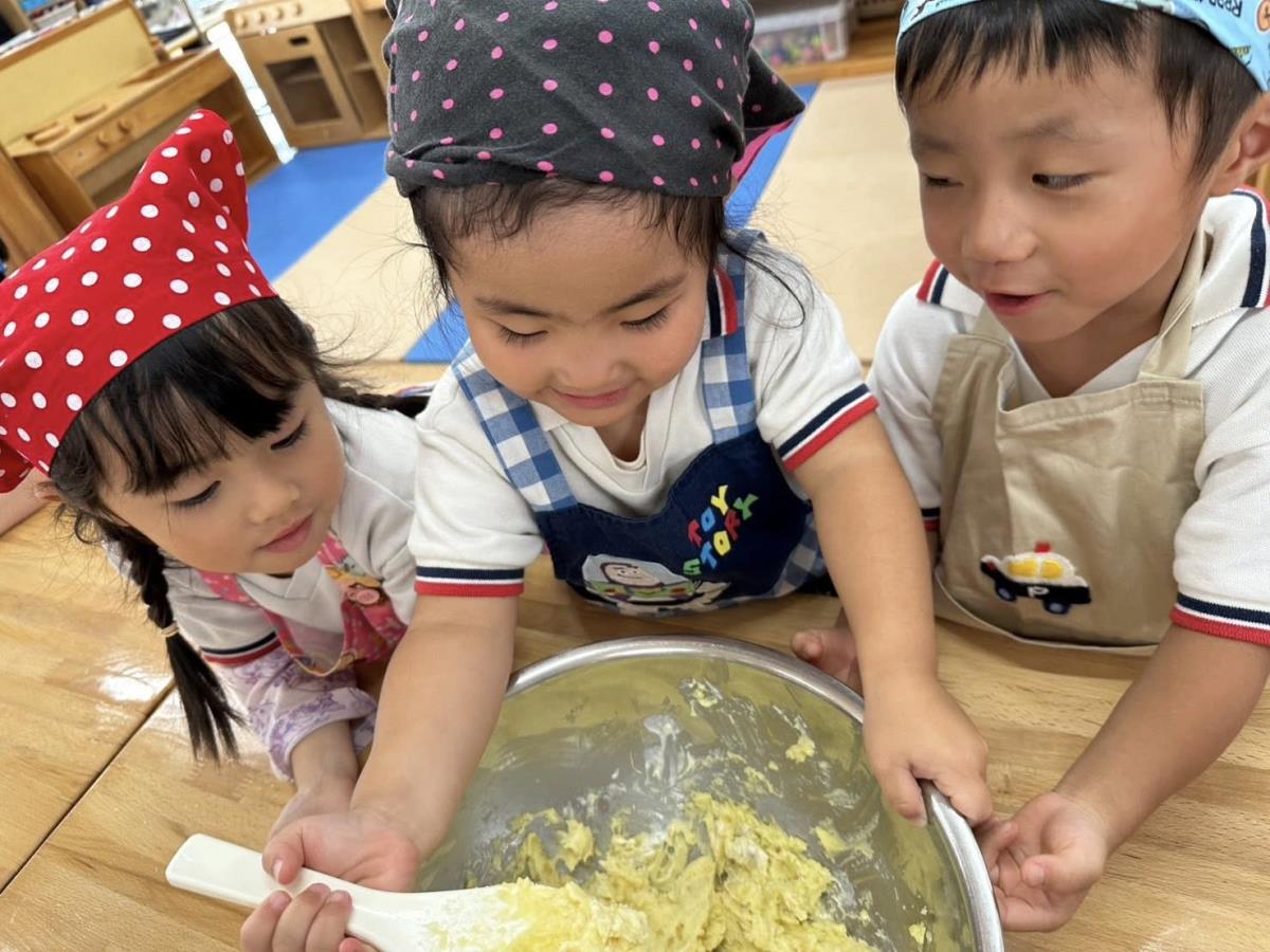 | 今日は午前中はオペレッタの練習をし、午後は園庭で遊んでから楽しみにしていたクッキングをしました。お芋をつぶしたり、混ぜたり、ハケで卵黄を塗ったりみんなとっても楽しそうに作っていました。スイーとポテトが焼き上がると、「いい匂い〜♡」とクンクン匂いを嗅いでいる姿が可愛かったです。美味しくておかわりをするお友だちも多かったです。 |