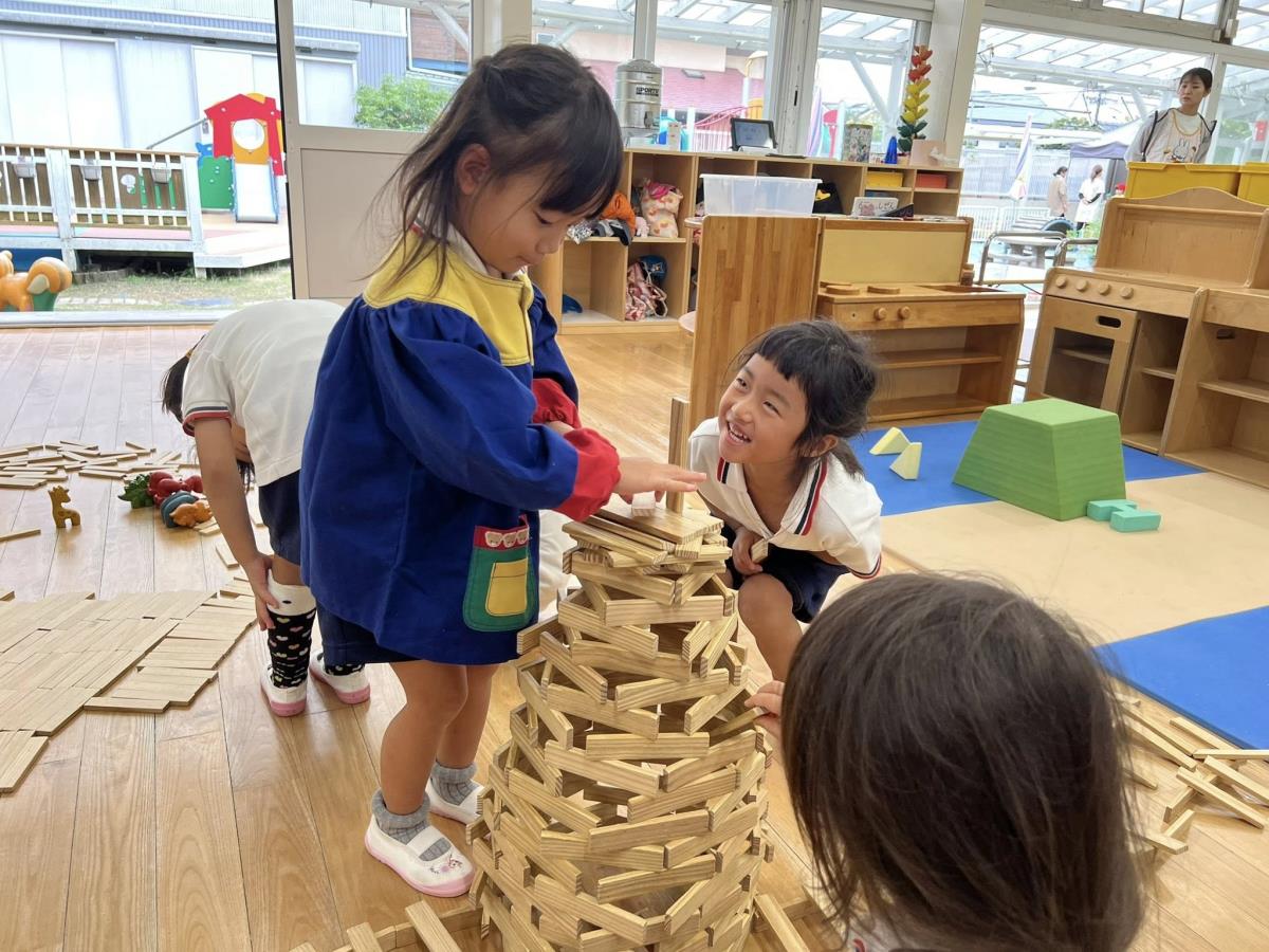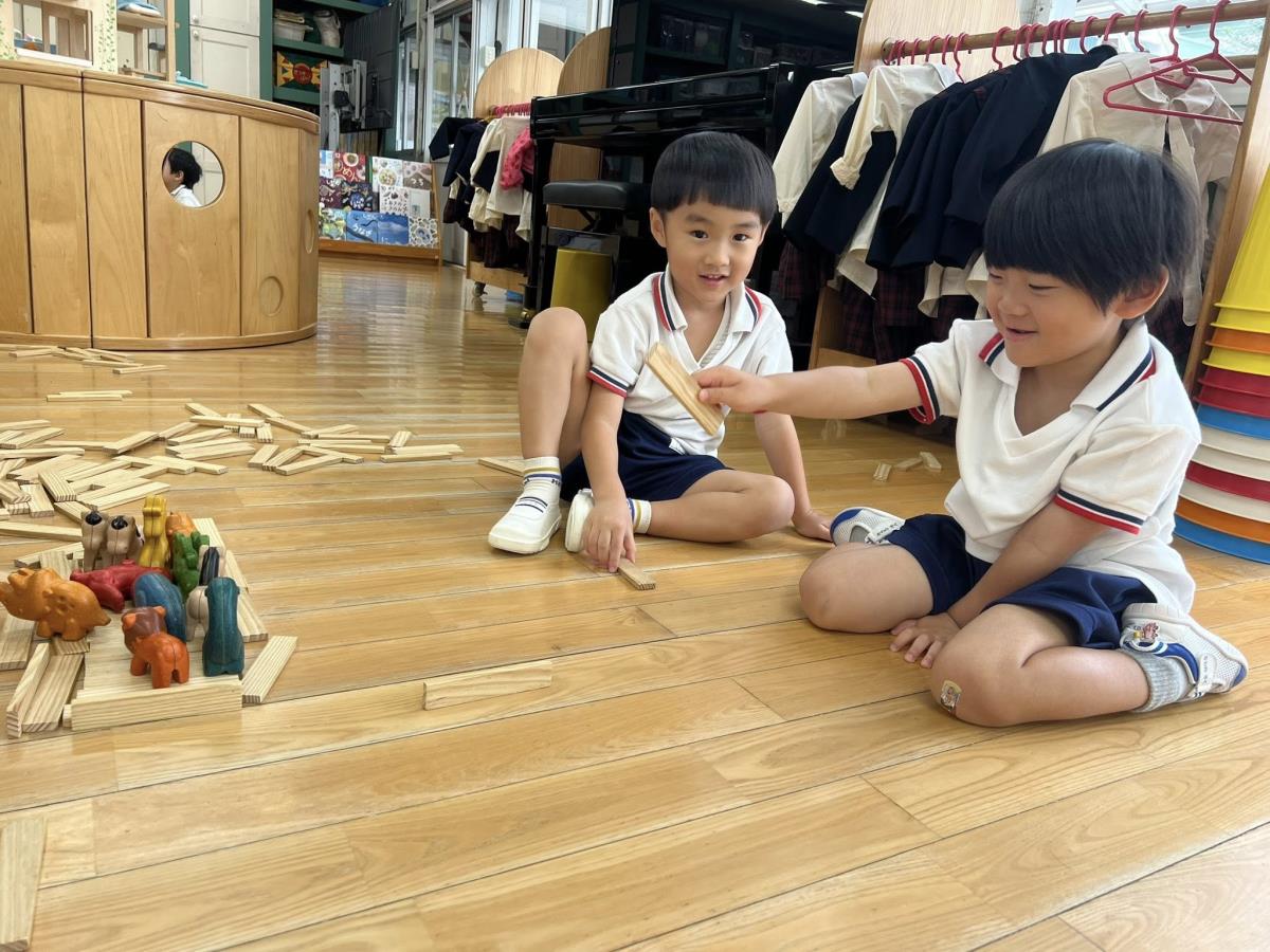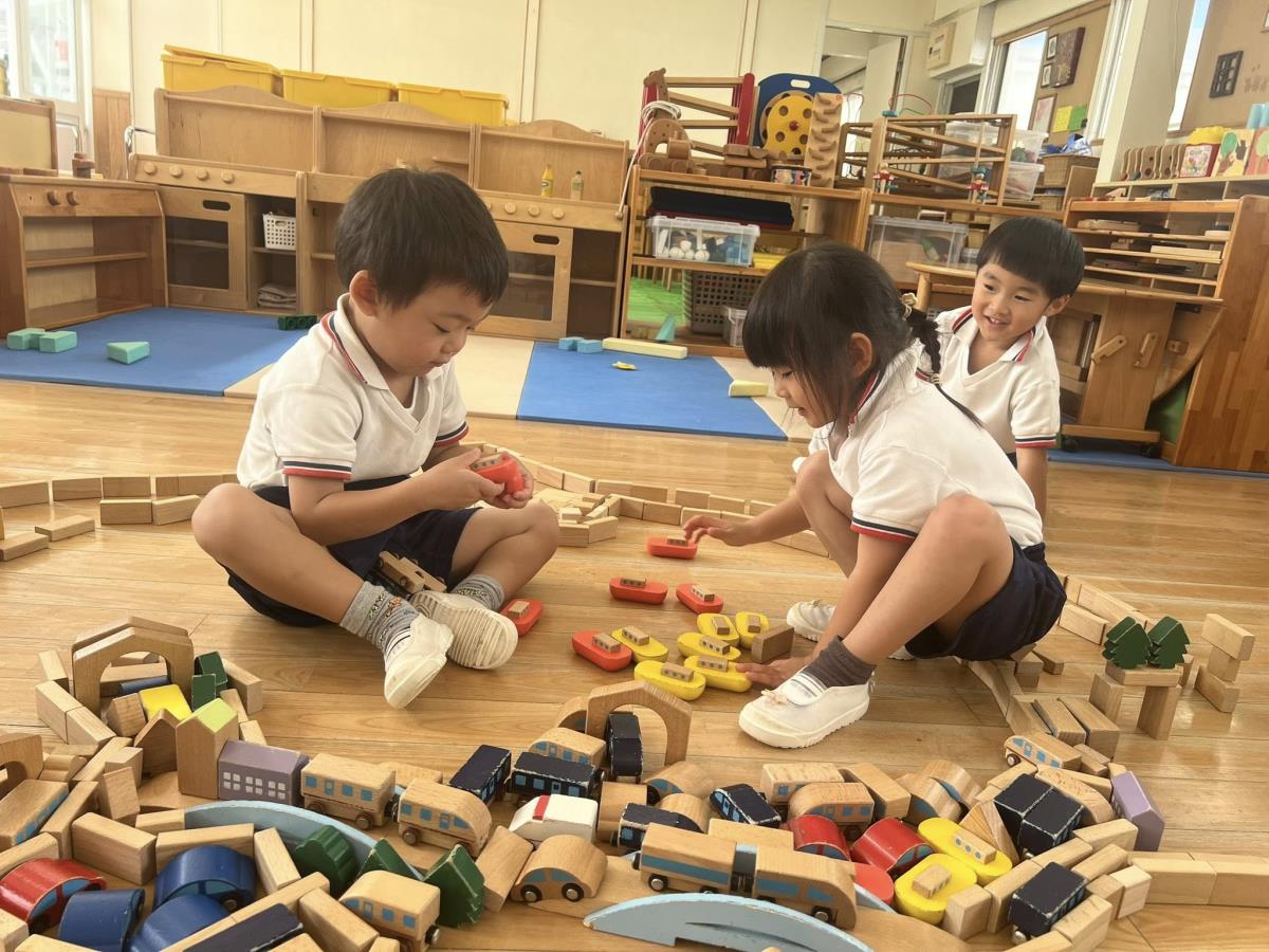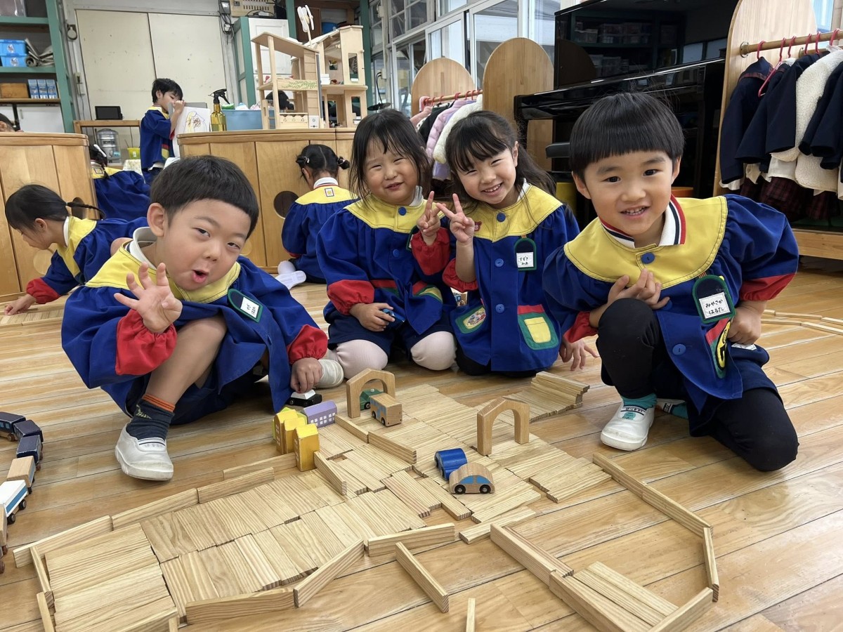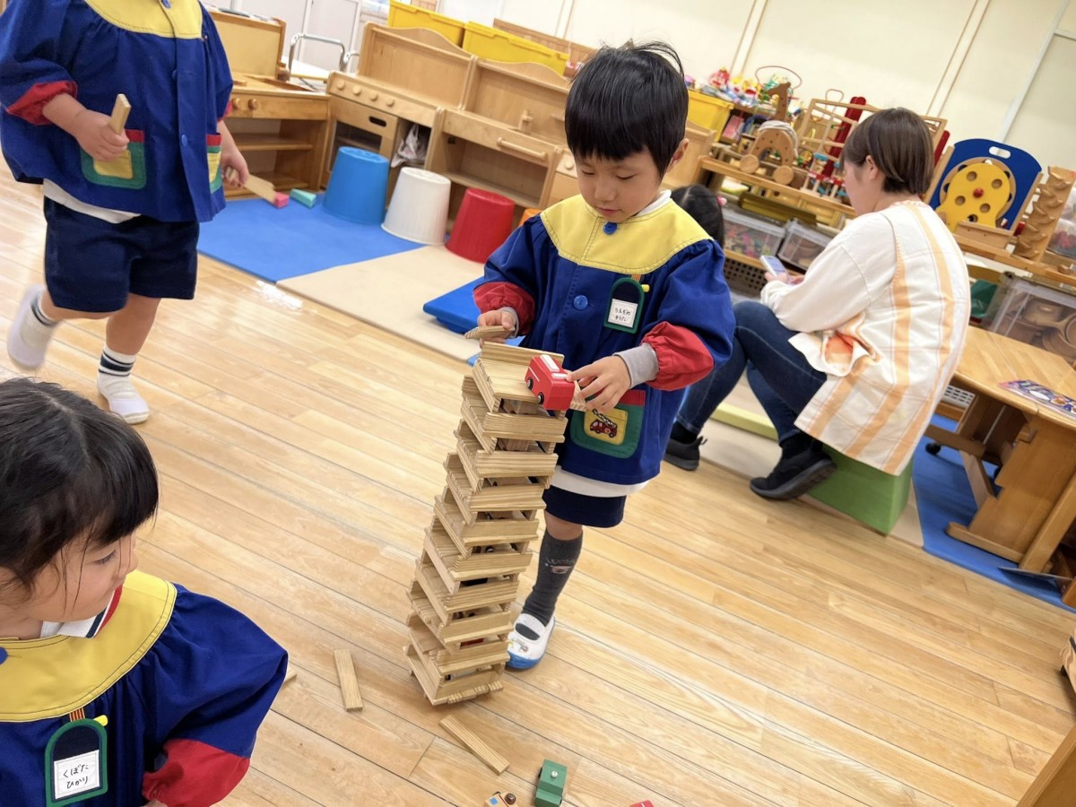 | オペレッタの練習をした後に、積み木や車の玩具で遊びました。駐車場を作ったり、友だちと「こうしようよ!」「これ使ったらいいんじゃない?」など、お話しながら作っていました。午後は園庭で遊びました。 |