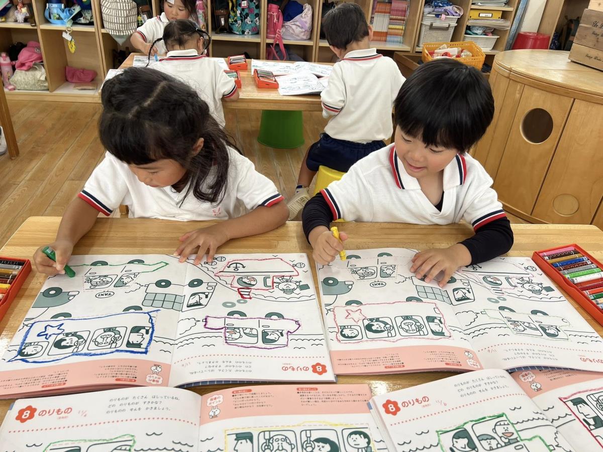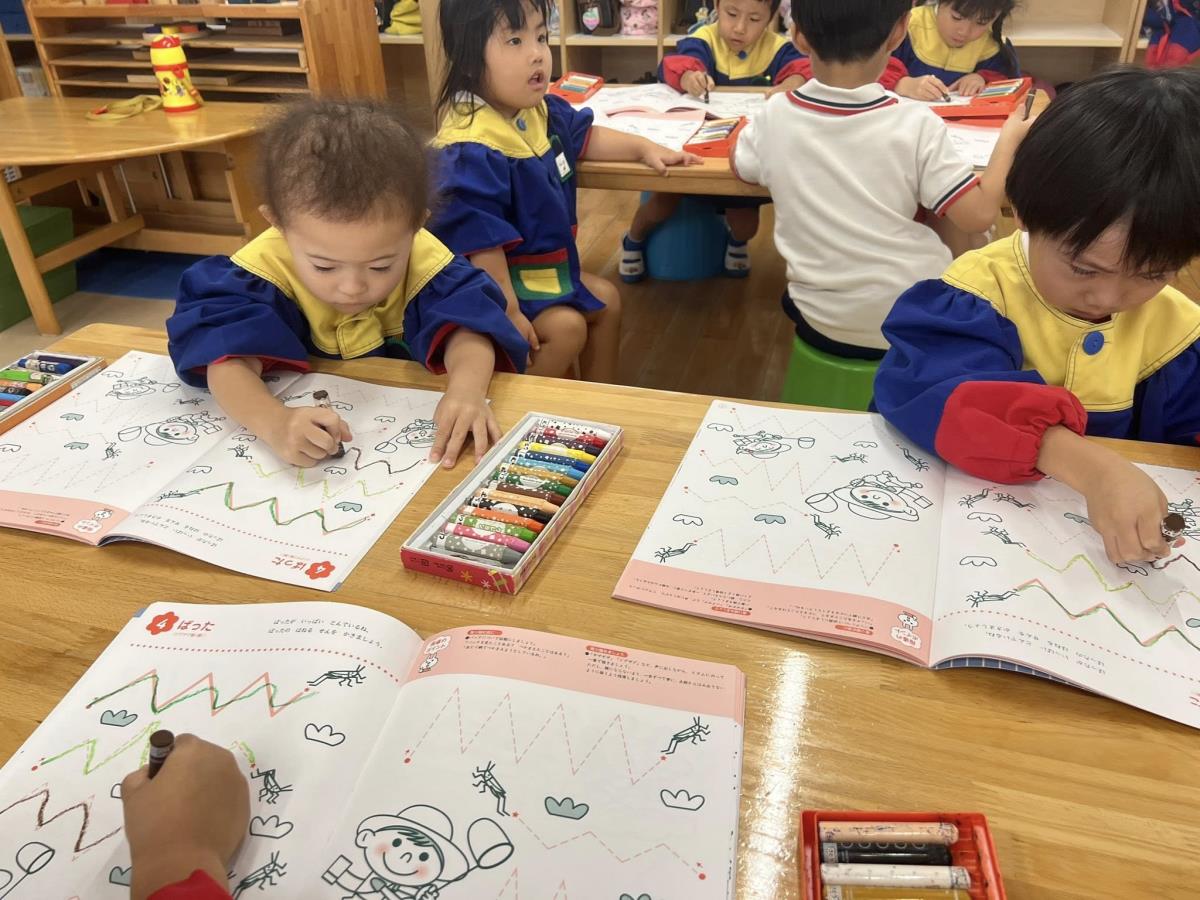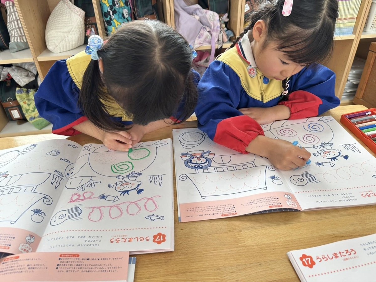 | 今日もオペレッタの練習をしました。小道具をたくさん使う演目ですが、少しずつ覚えてきているように思います。午後は線のワークをしました。迷路のようなページで、交差しながらゴールへ行くところが少し難しかったようですが、個別で対応すると「わかった!」ともう一度手でなぞり理解しているようでした。 |