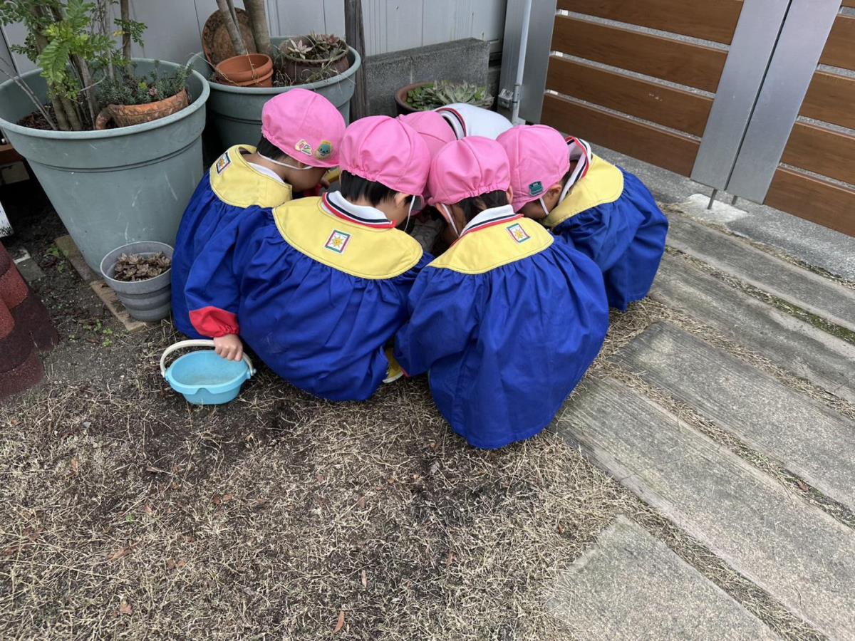 今日は園庭で遊びました。葉っぱや石を集めてごっこ遊びの材料として使っています。バケツに選んだ自然物を入れ、お友だちに「こんなのあったよ!」と見せていました。