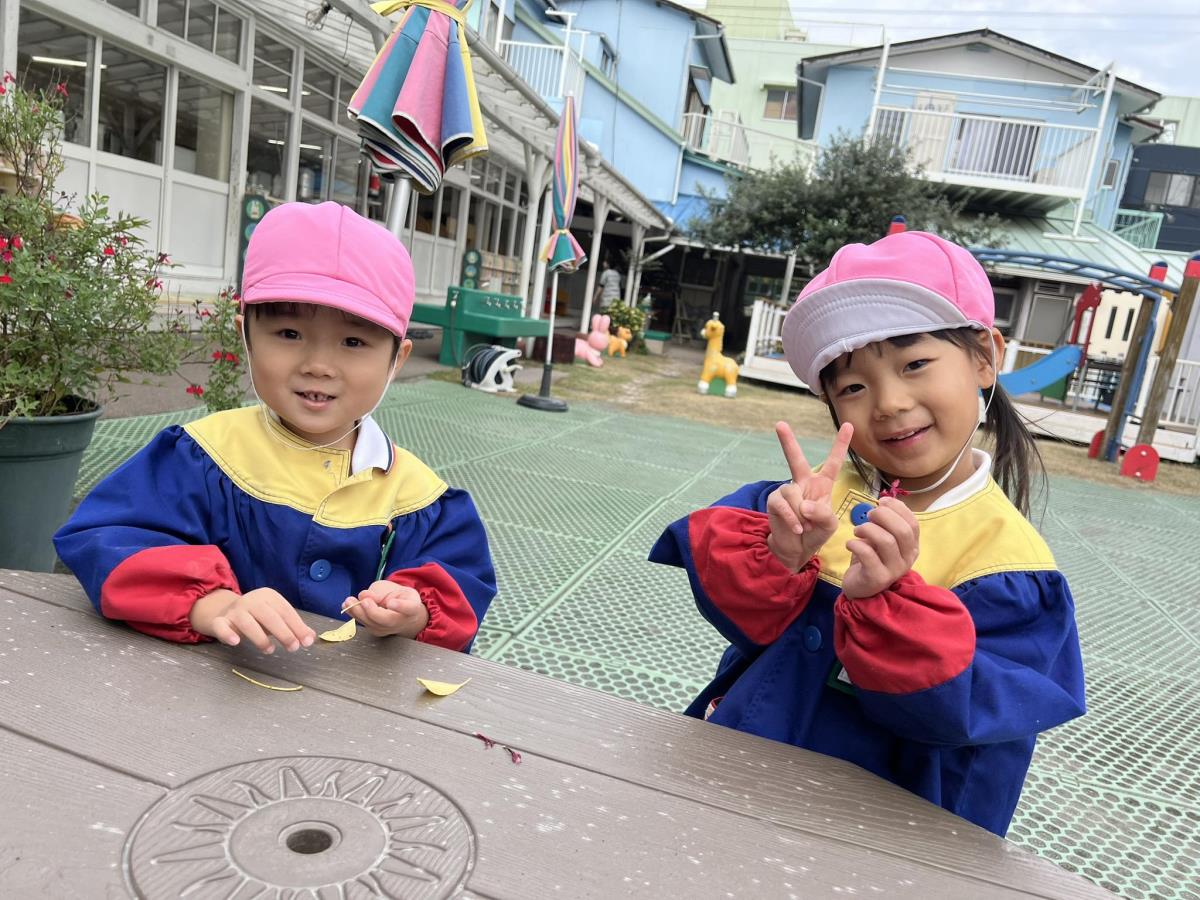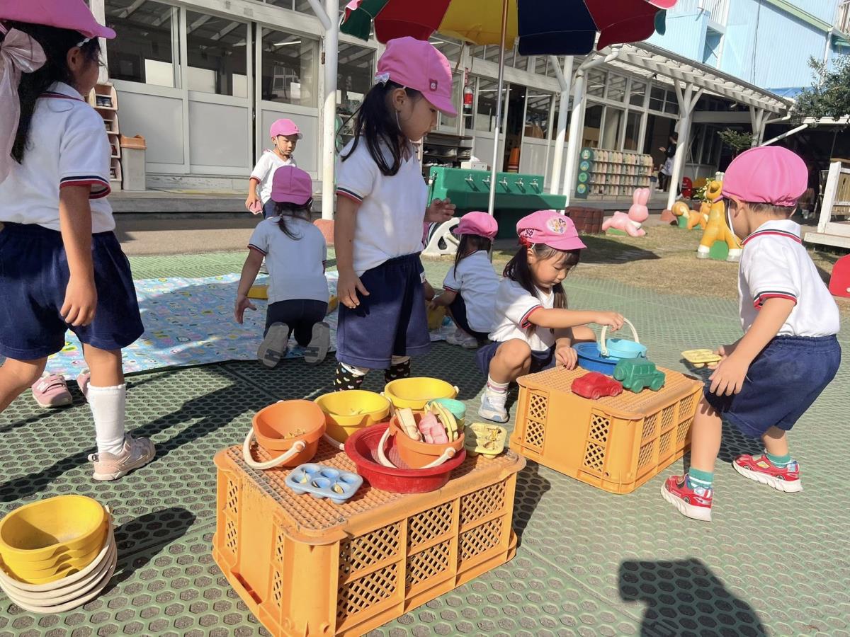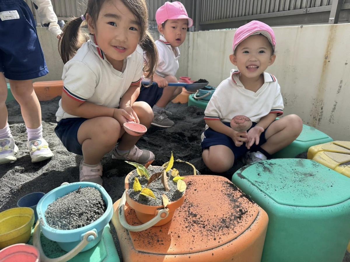午前中はオペレッタやお遊戯の練習をしました。お休み明けですが、歌や振りを覚えていてスムーズに進めることができました。覚えた歌詞は口に出して歌う姿も見られるようになってきました。午後は園庭で遊びました。葉っぱをお砂場遊びに使い、飾り付けや具材にしています。