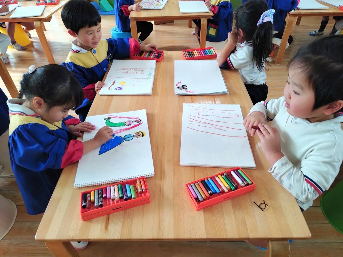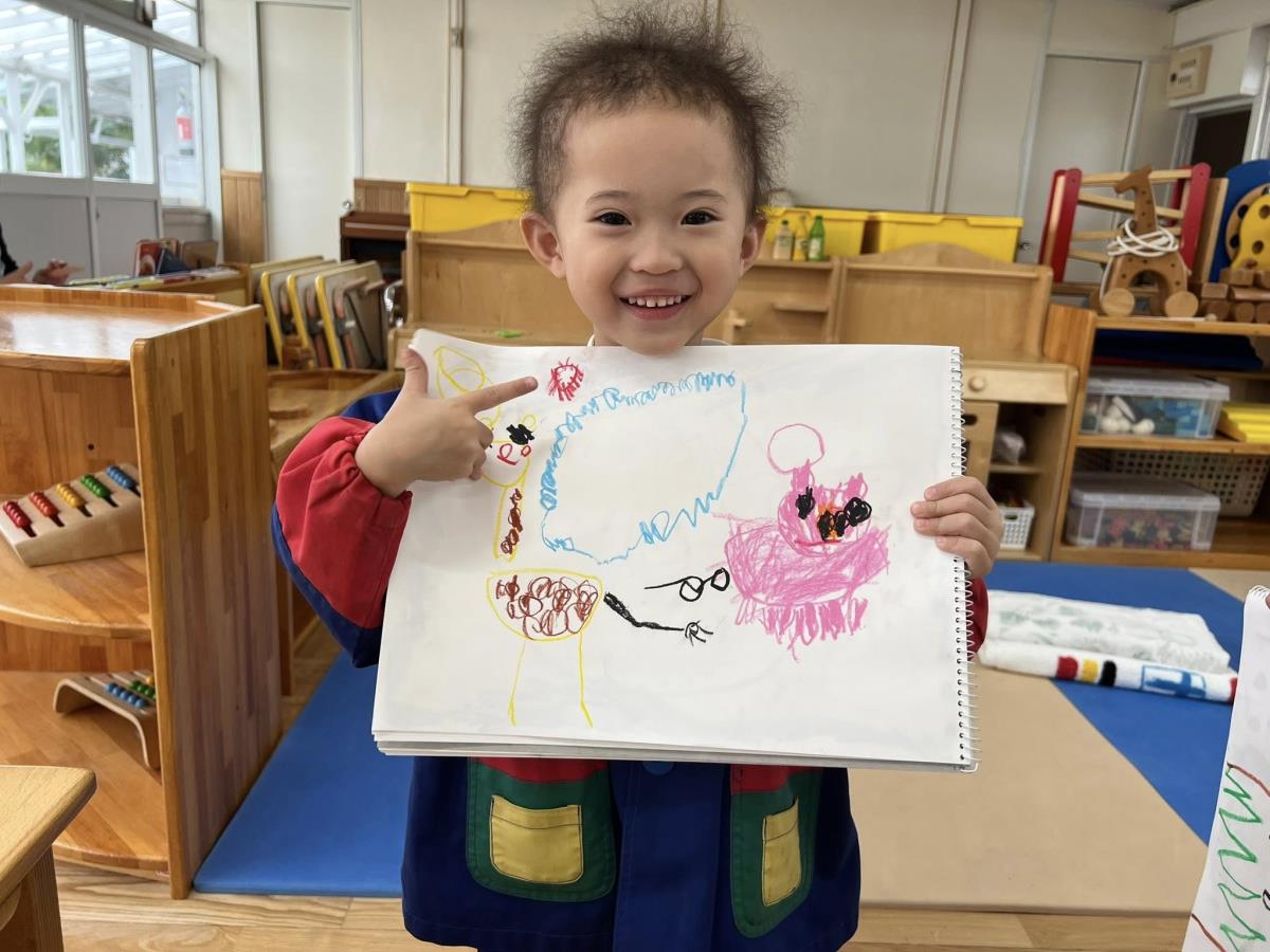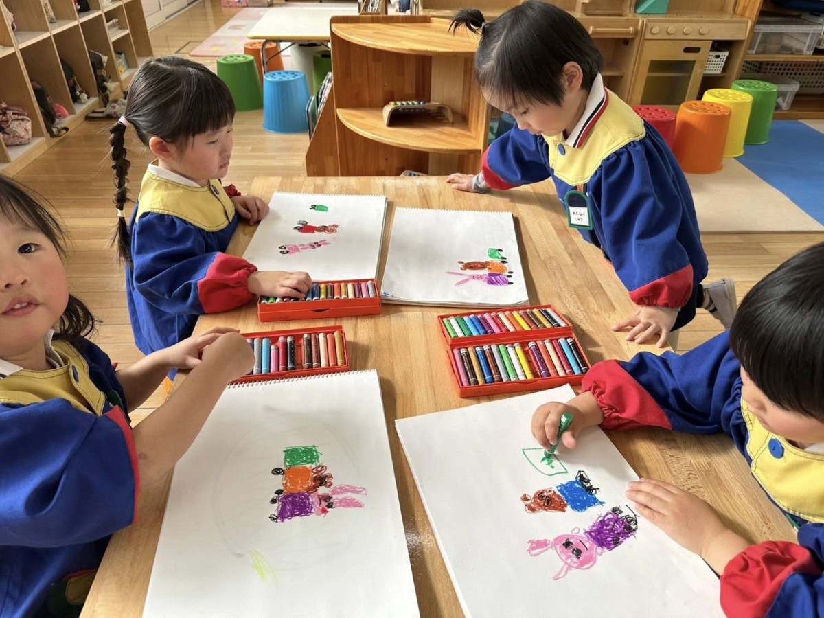 午前中はオペレッタの練習をしました。これからどんな役をやるのか楽しみにしてくれています。午後は園庭で遊んだりスケッチブックにこの前とは違う描き方の木やクワガタを描きました。少し難しいかな?と思いましたが、楽しそうに描いてくれました。その後自由に描く時間を設けると、復習のようにもう一度描いていたお友だちもいました。