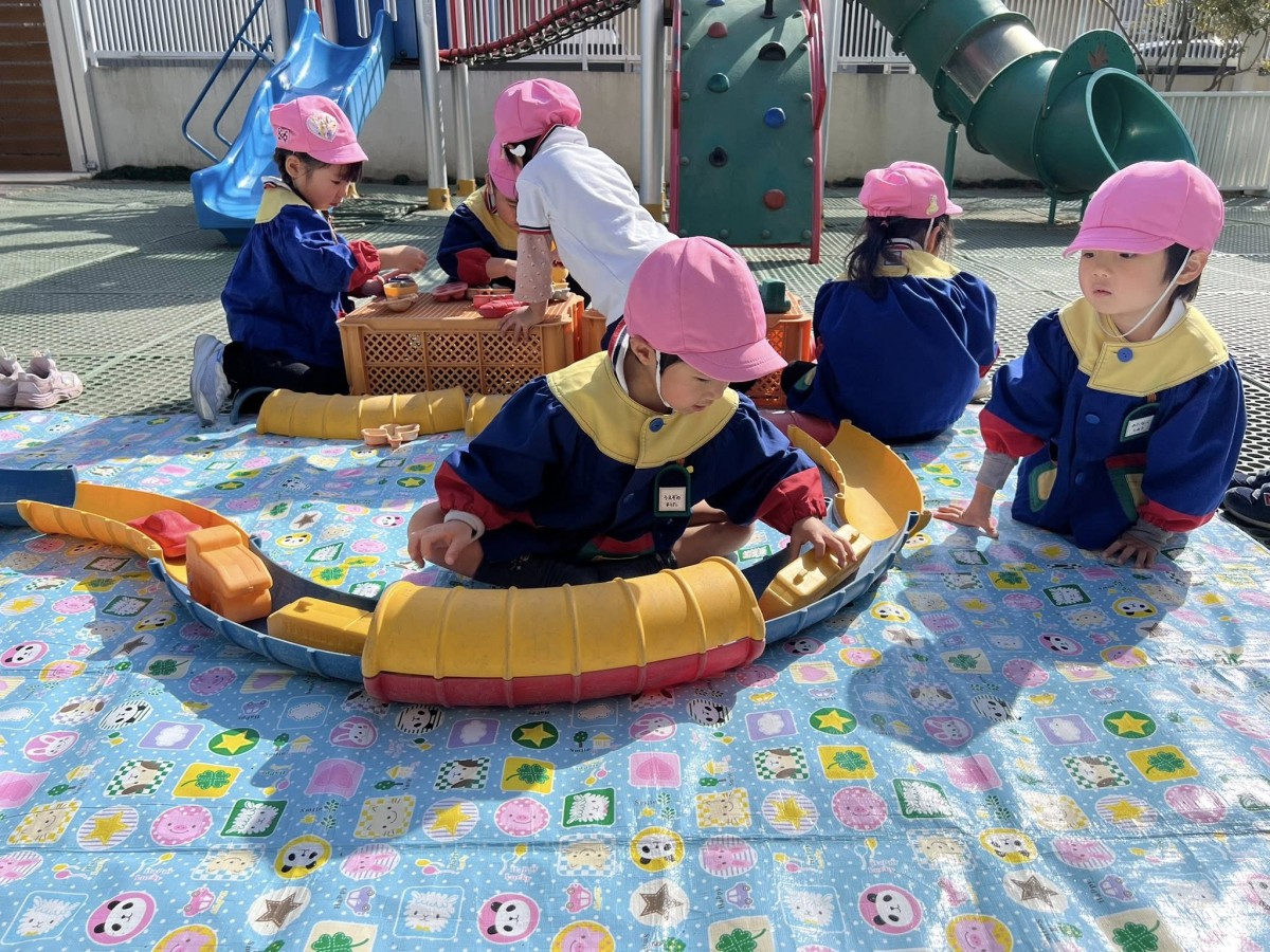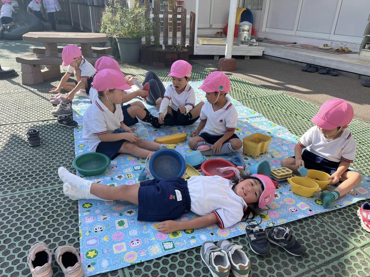 | 今日は園庭で遊びました。ピクニックシートを敷いてみると、ごろんと寝転んでゴロゴロ休んだり、ごっこ遊びをしたりと各々が楽しんでいました。また、コンテナをキッチンに見立てたりもしていました。 |