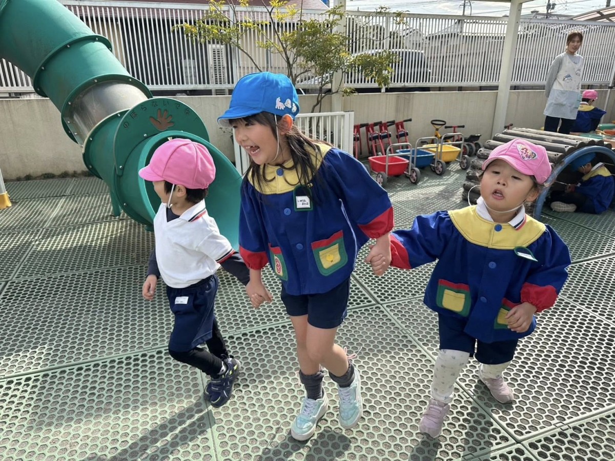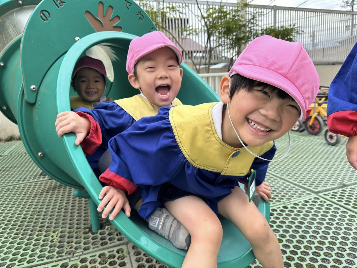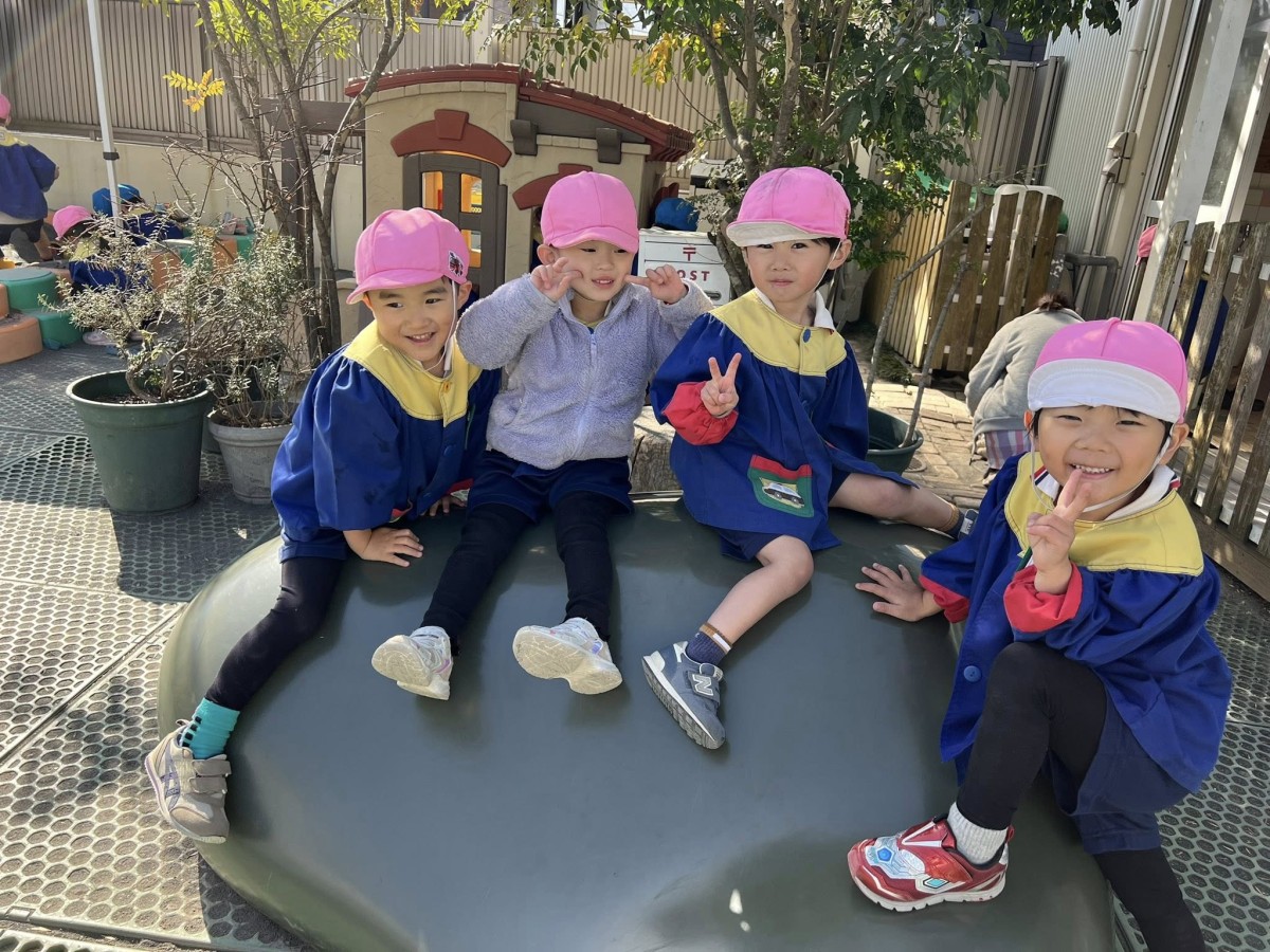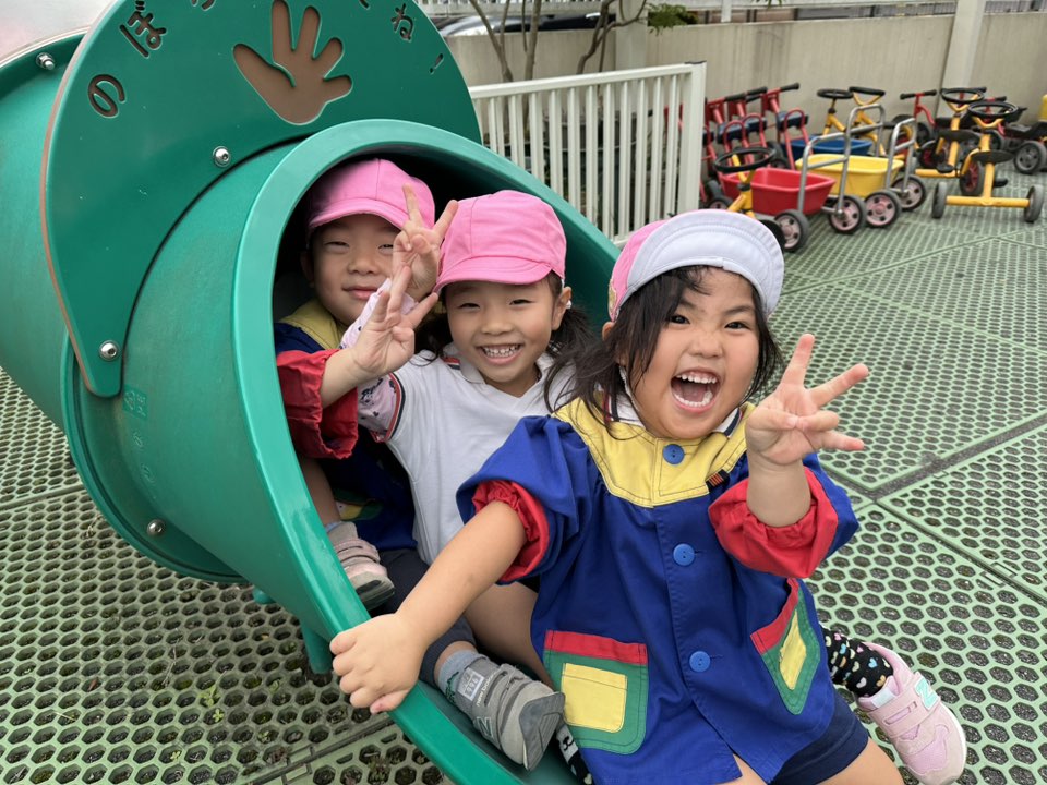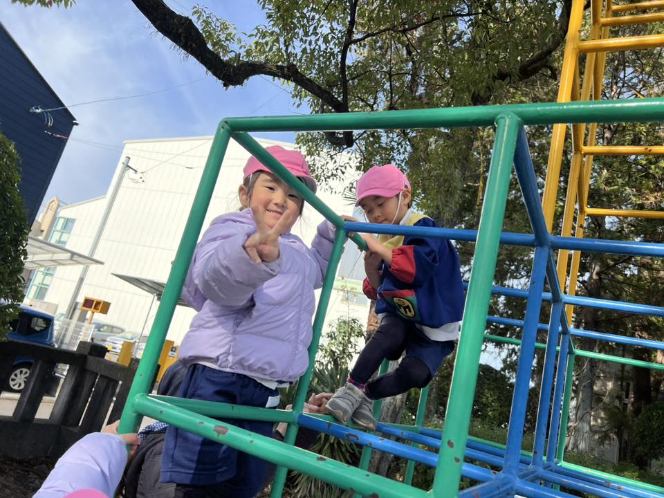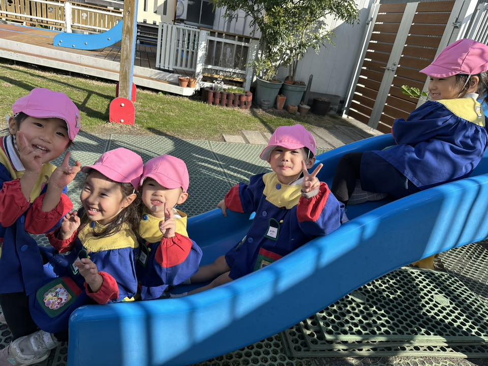 | 午前中はオペレッタの練習をし、午後は住吉公園へ行きました。遊具で思いっきり遊び、笑顔がたくさんみられました。今まで怖くて一歩踏み出せなかった遊具にも挑戦する姿が見られたり、成長を感じたお散歩にもなりました。 |