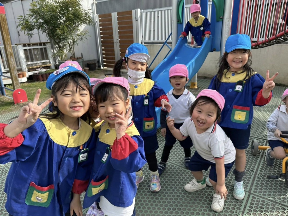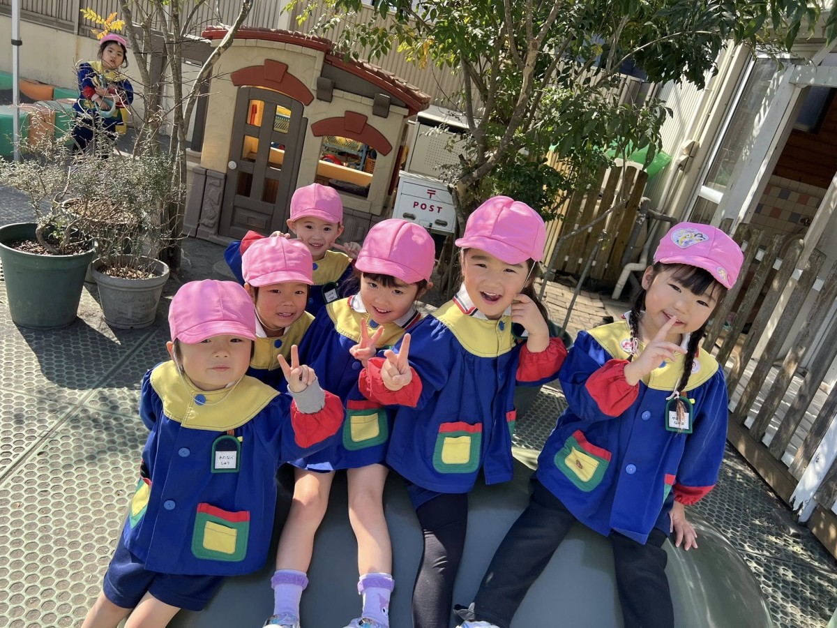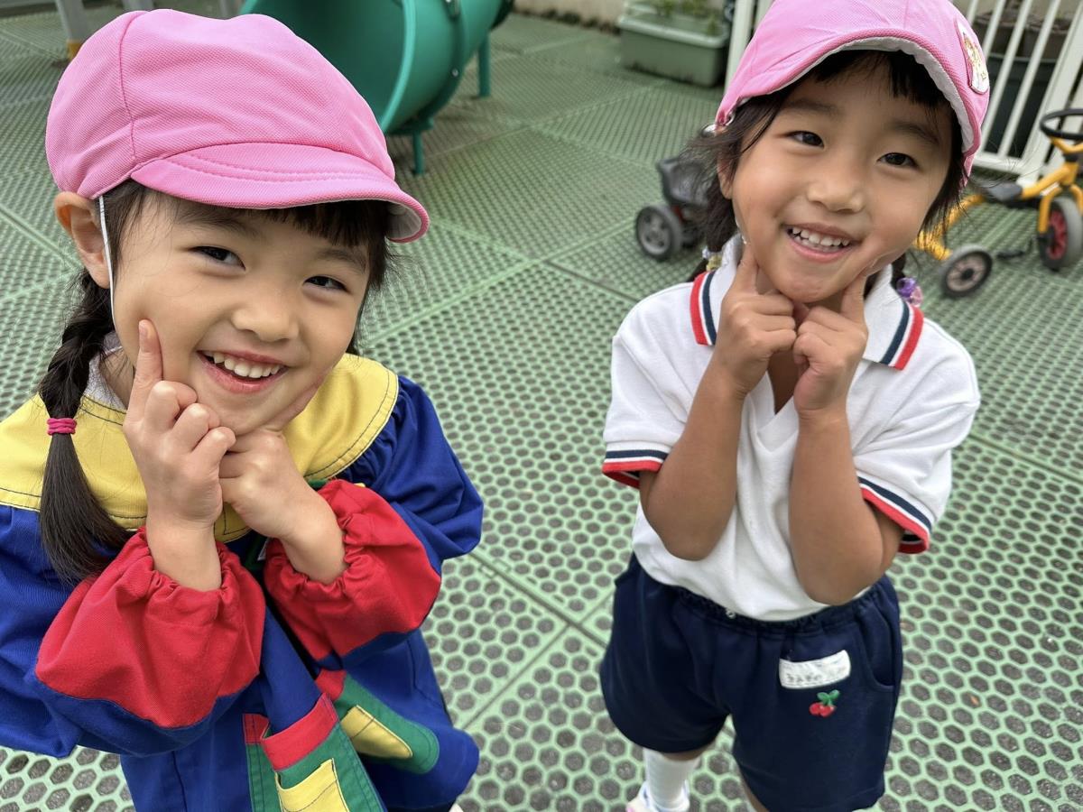 | 今日はおままごとをしたり園庭で遊びました。写真を撮ってほしくて、集まってきちゃうもも組さんが可愛いかったです♡スナップバンドで、可愛いメガネを作り見せ合っていました。 |