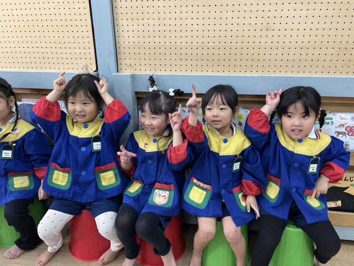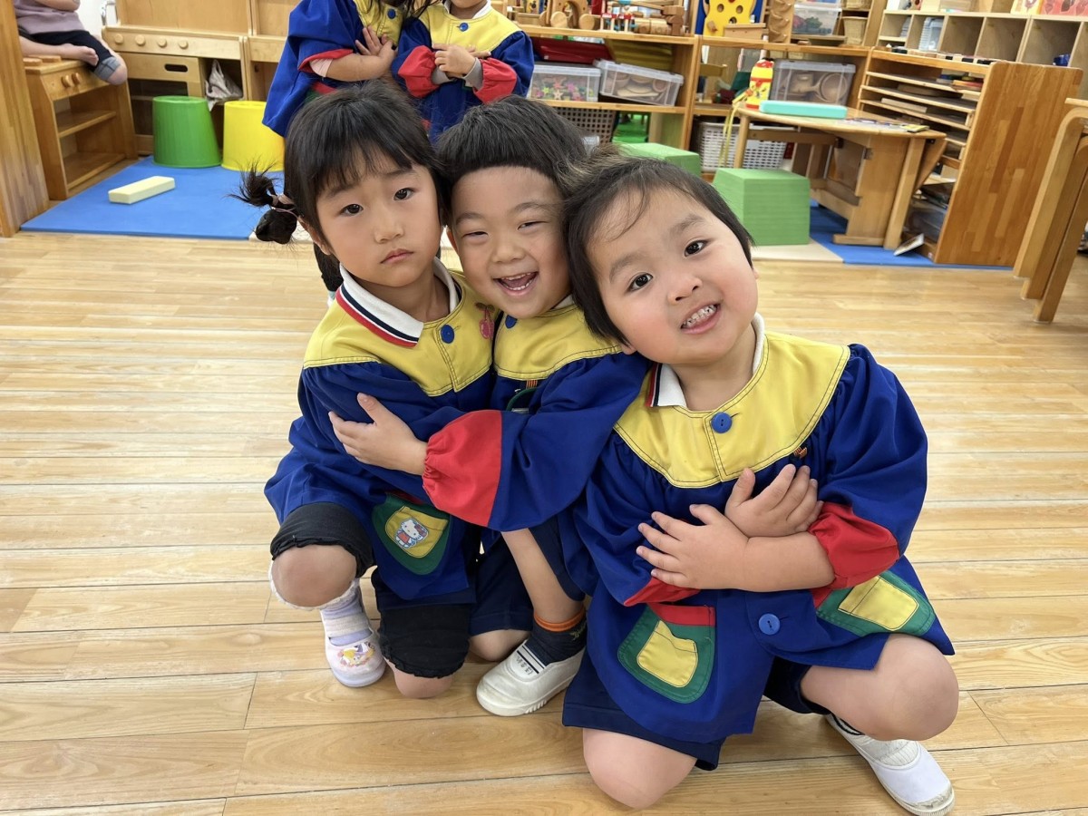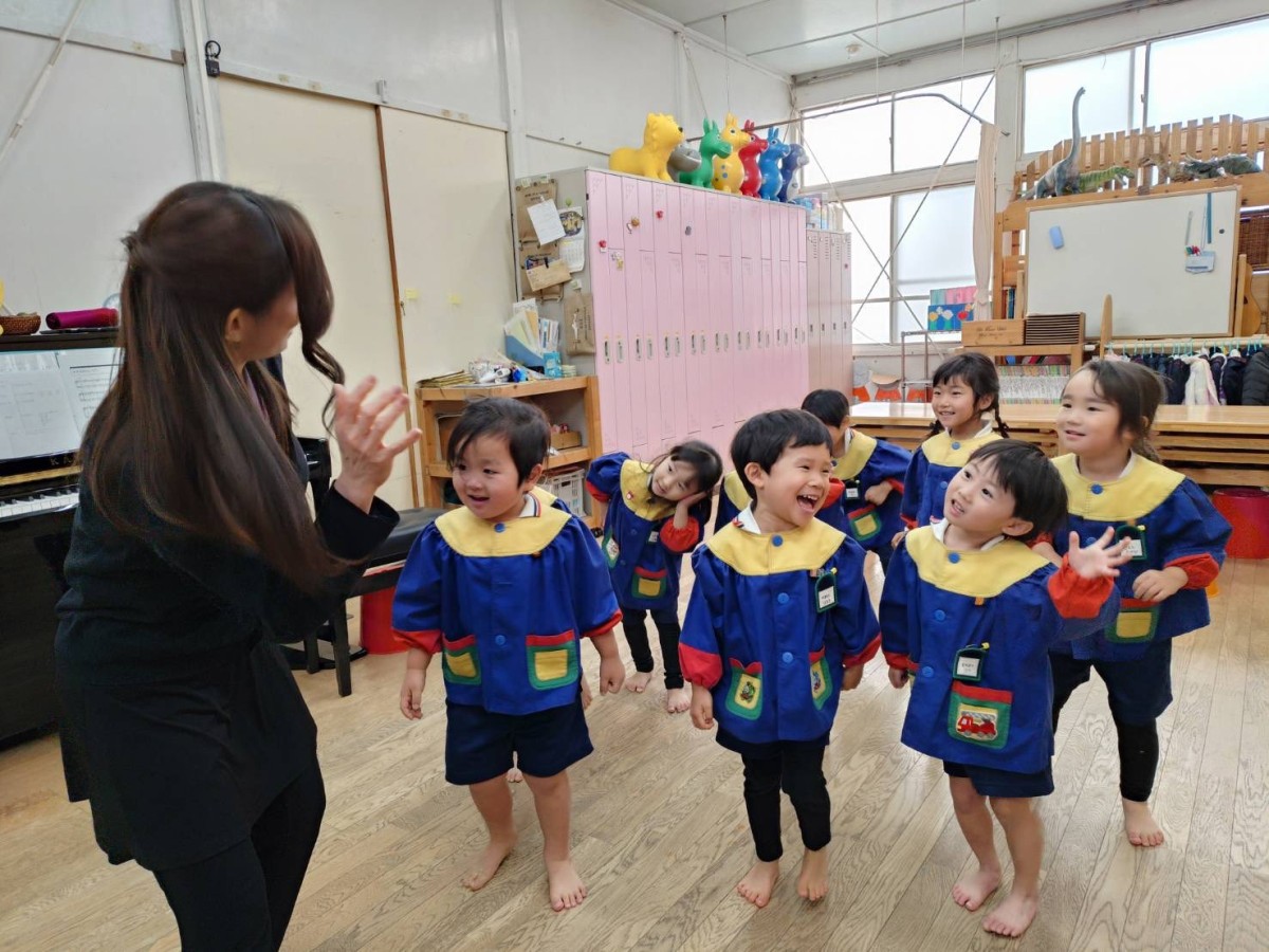 | 今日はお遊戯の練習をしました。顔を友だちと見合わせる振り付けがあるのですが、難しいお友だちもいるので重点的に練習をしました。顔を見合わせると嬉しくて自然とニコニコになるお友だちです。午後は園庭でたくさん遊びました。 |