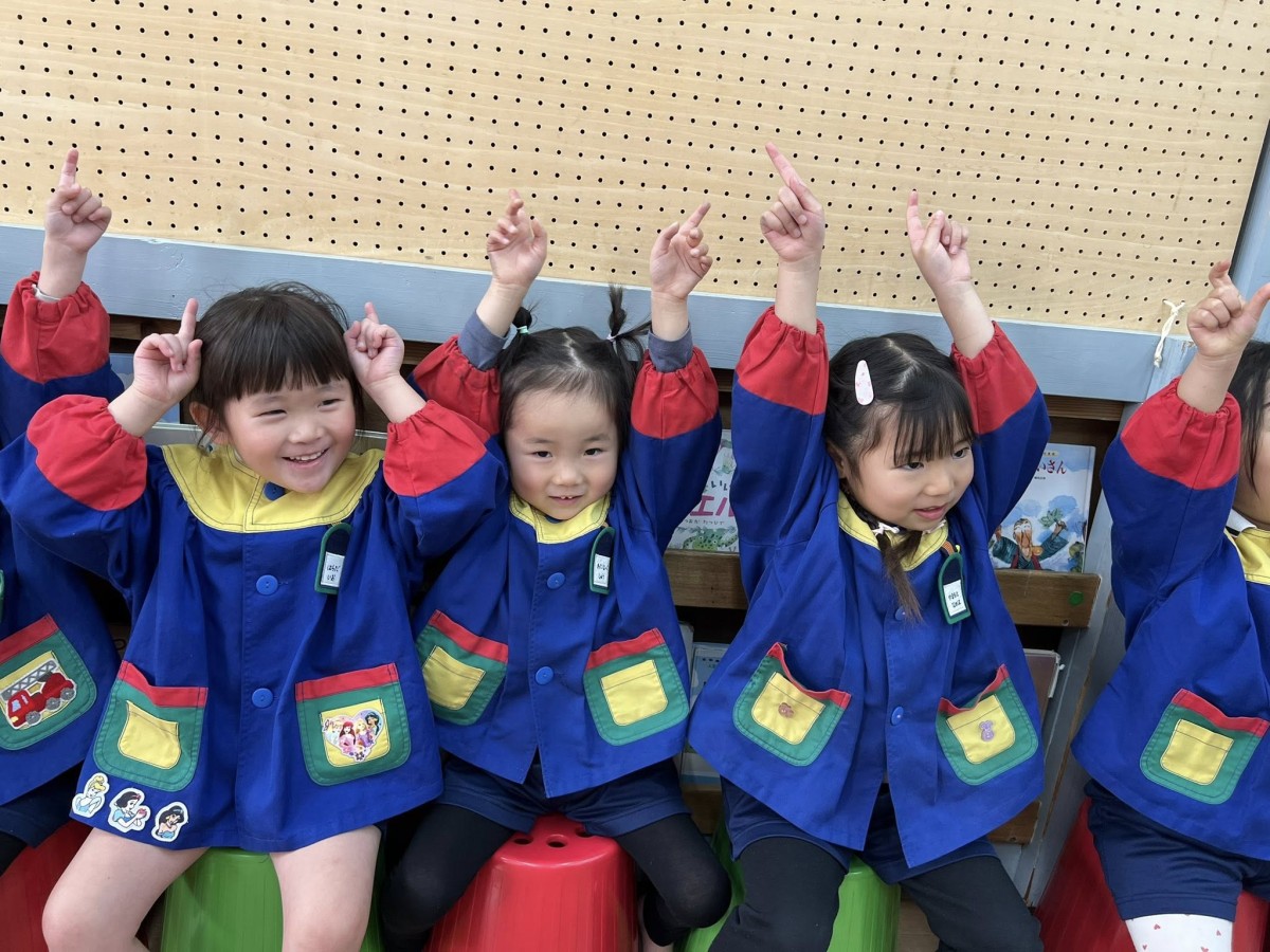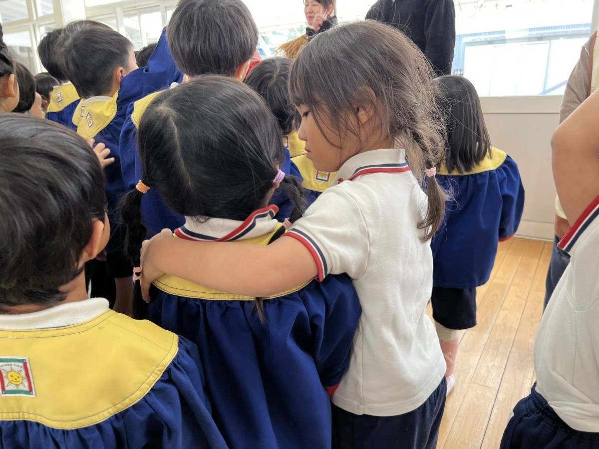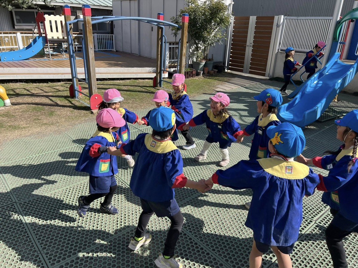 | 今日はお遊戯の練習をしました。顔を友だちと見合わせる振り付けがあるのですが、難しいお友だちもいるので重点的に練習をしました。顔を見合わせると嬉しくて自然とニコニコになるお友だちです。午後は園庭でたくさん遊びました。 |