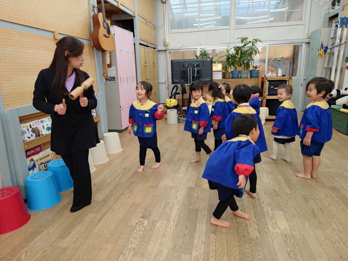 | 午前中は器楽の練習をしました。太鼓やトライアングル、マラカス等様々な楽器で演奏します。一生懸命取り組んでくれました。午後は園庭で遊びました。 |