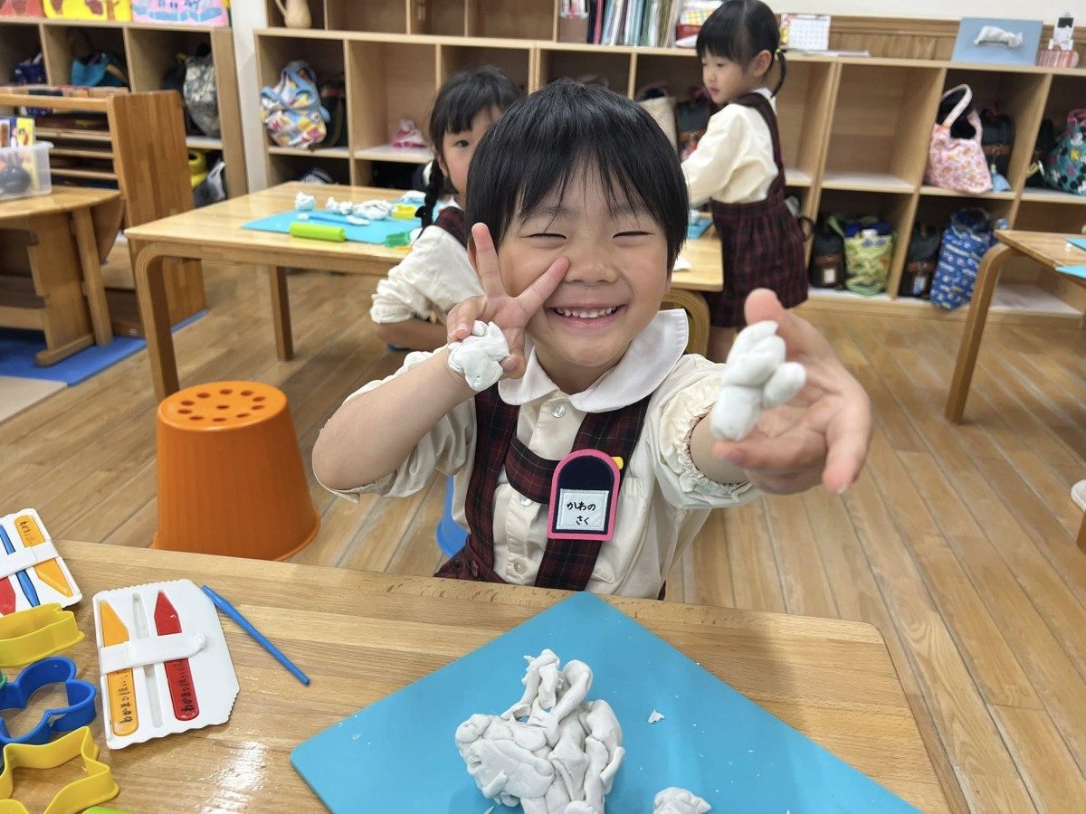 今日は粘土で遊びました。型抜きや、ピザ、お寿司屋さんなど作ることに夢中なもも組さんでした。午後はクレヨンで葉っぱを描いたり、折り紙をして過ごしました。