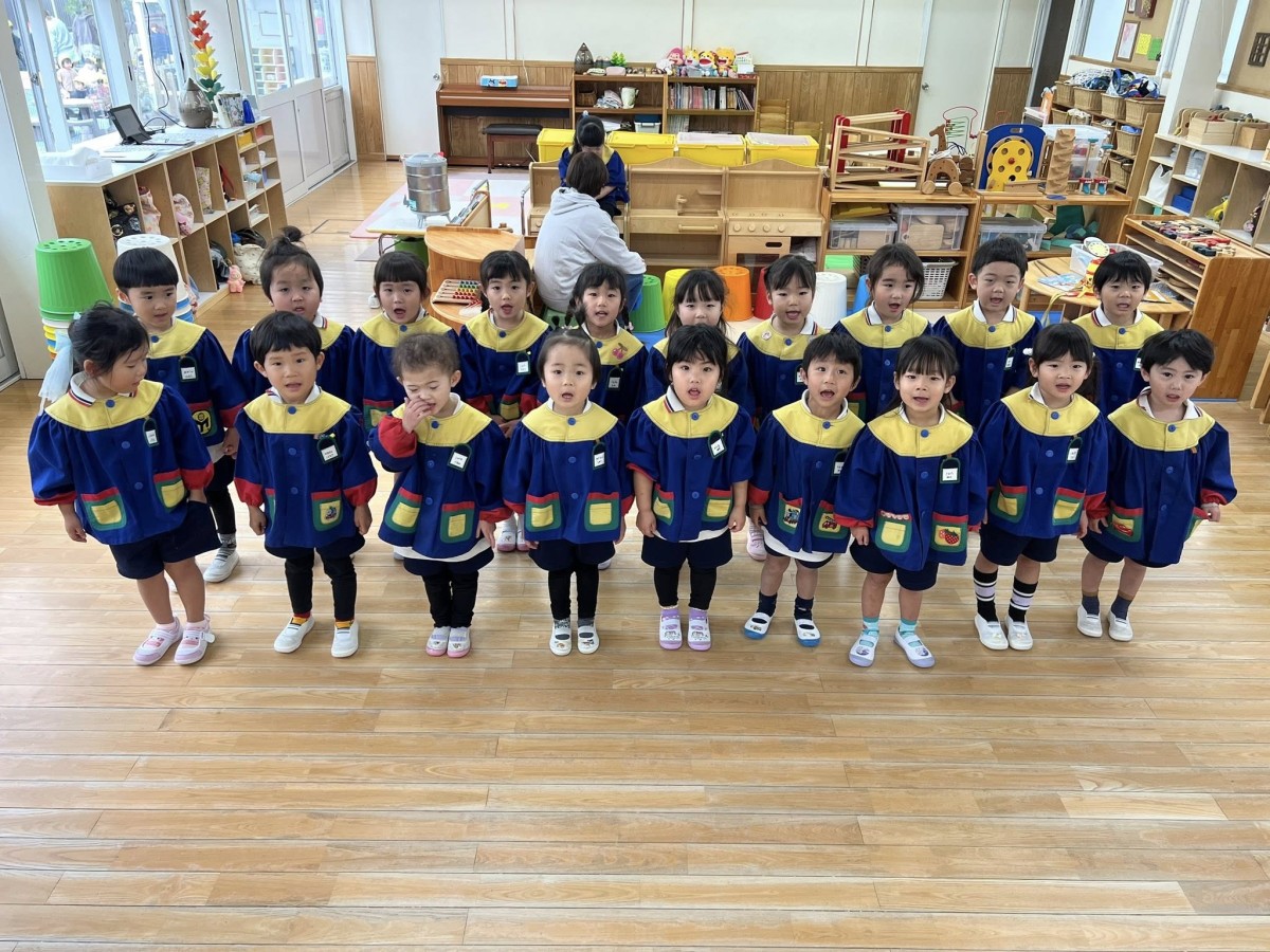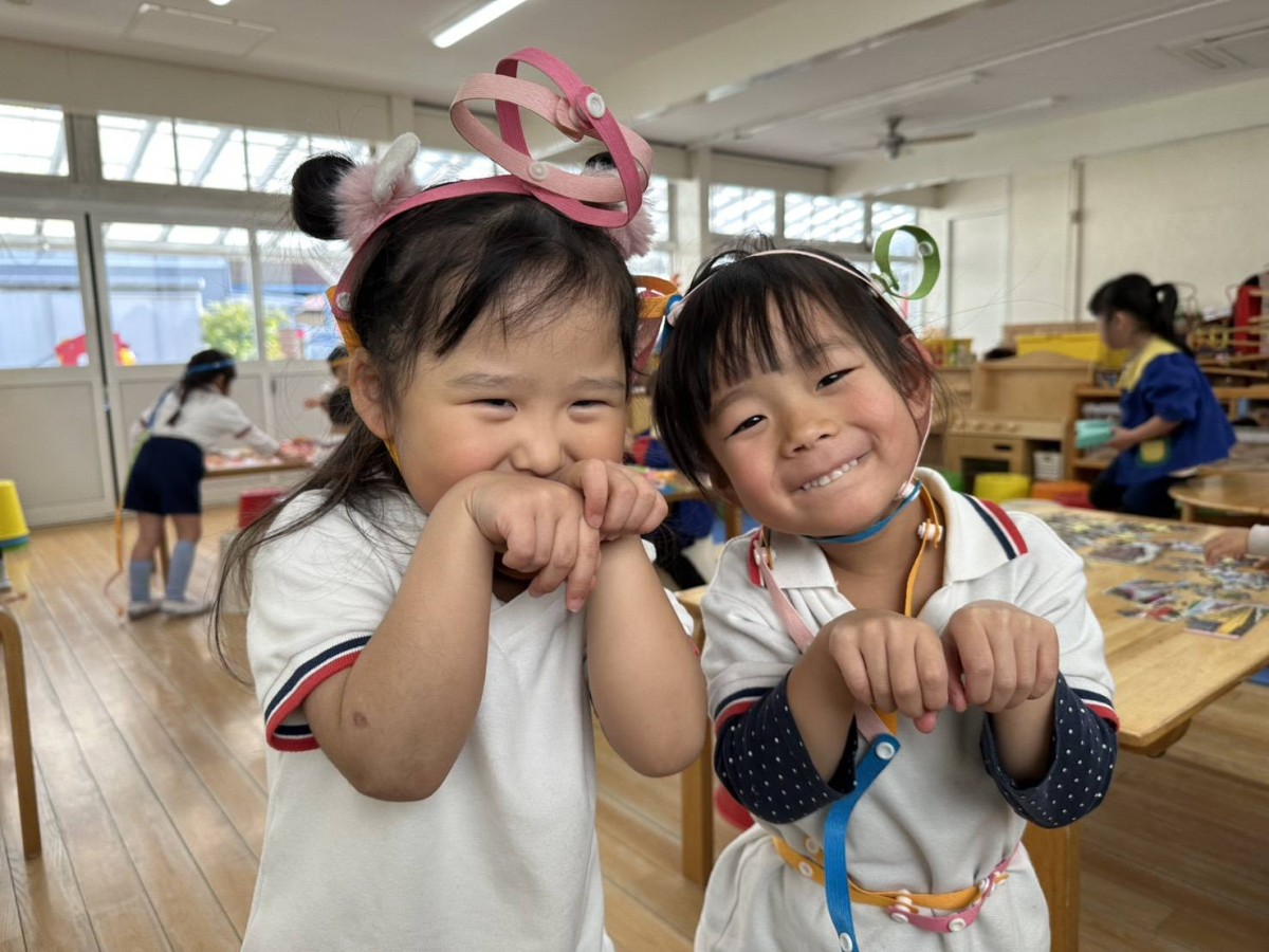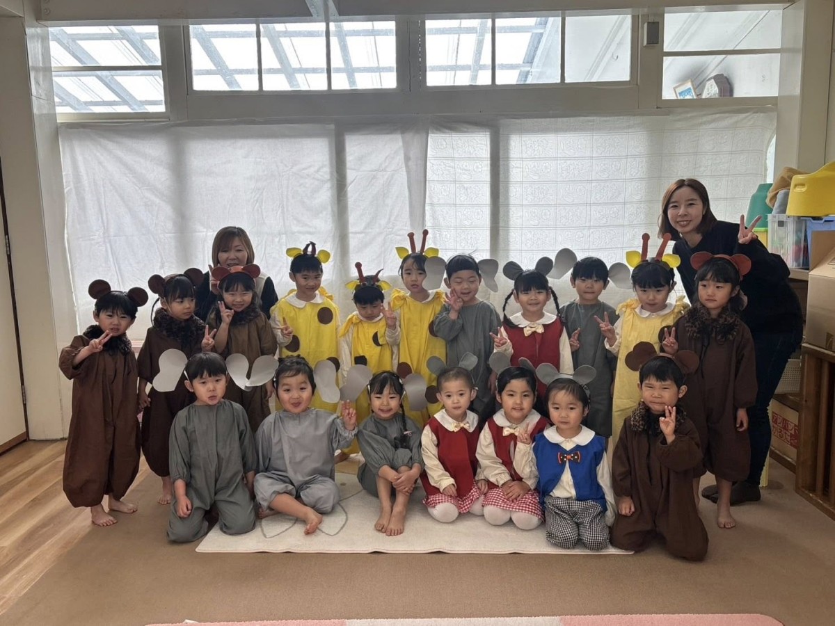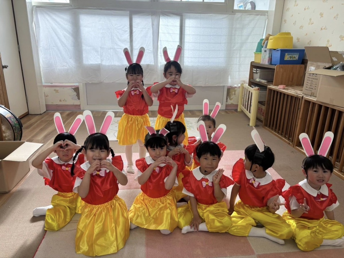 | 今日も発表会の練習をしました。初めて被り物をつけて練習をするとお互いの姿をみて「可愛い〜♡」と言っている姿にほっこりしました。午後は園庭で遊びました。 |
