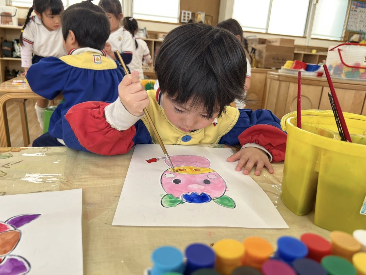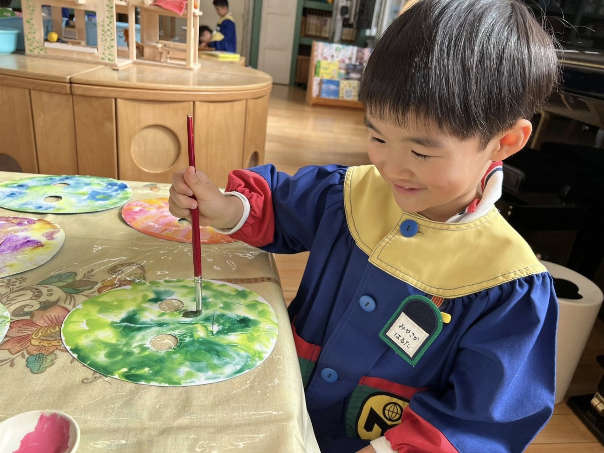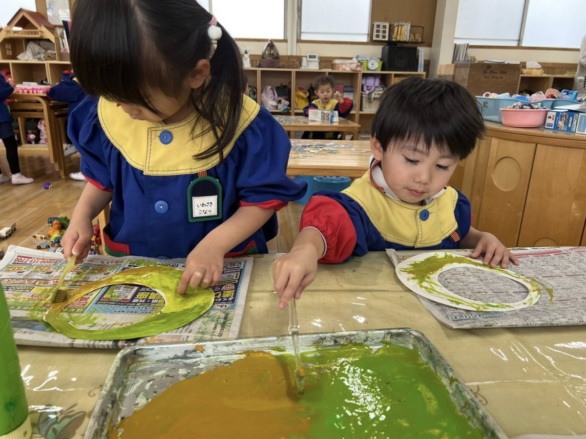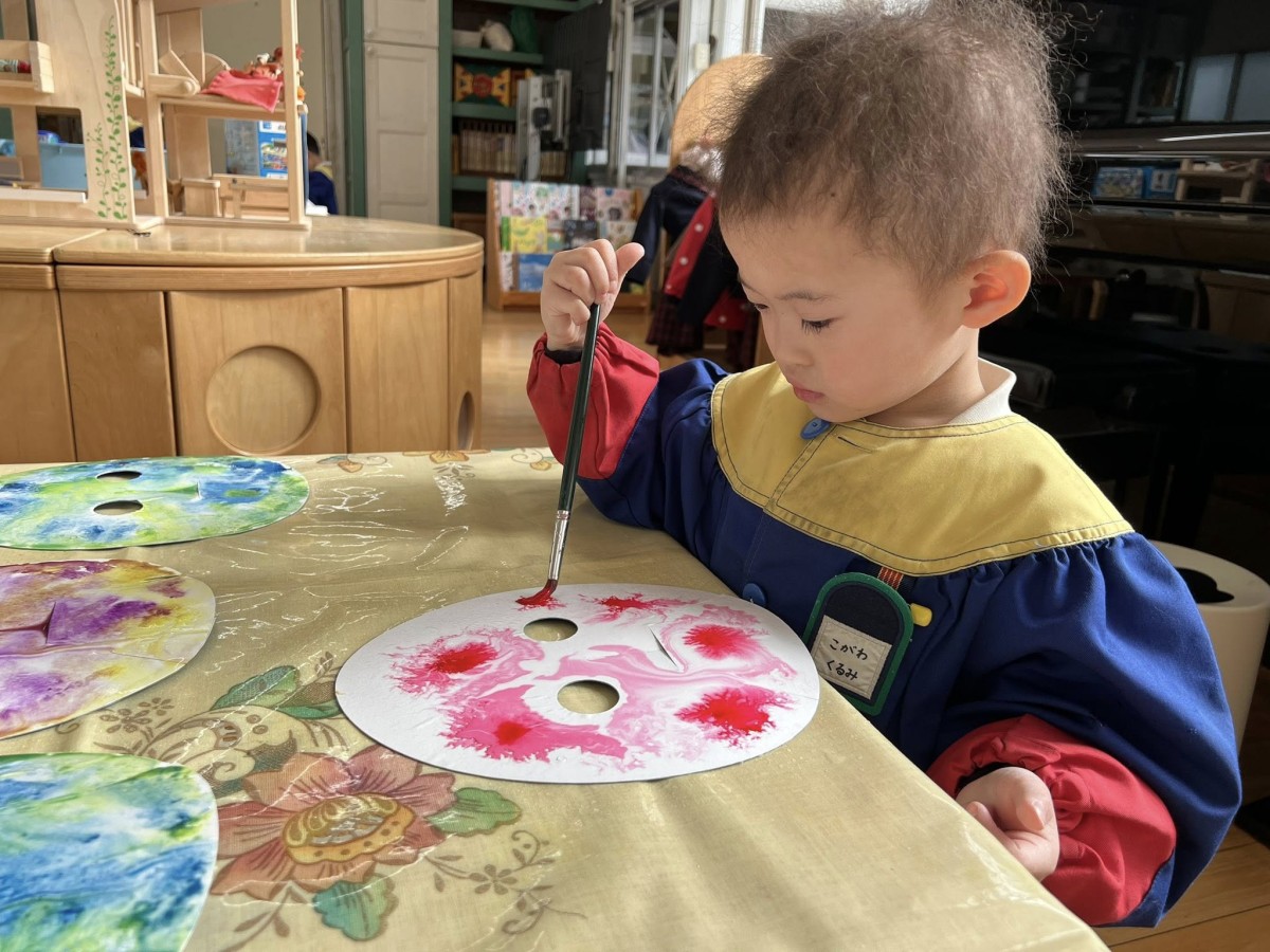 今日は鬼面制作をしました。水をつけた土台に筆で色をのせ、じんわり色が混ざり合うのを楽しみながら行いました。最後に塩をパラパラーっとかけて完成です。「どんな風になるんだろう」と乾くのを楽しみにしていました。