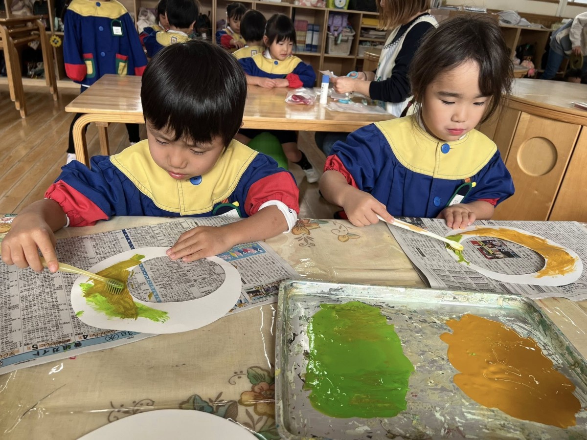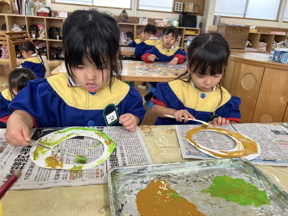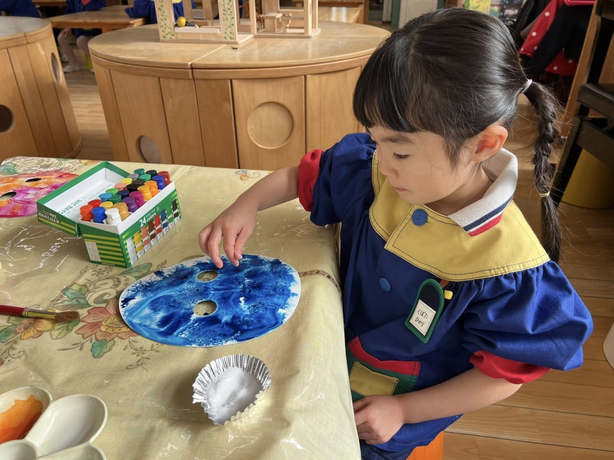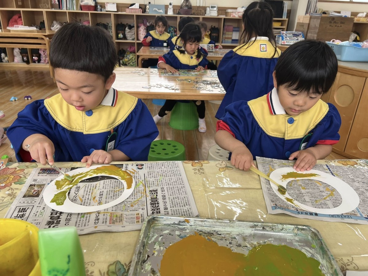今日は鬼面制作をしました。水をつけた土台に筆で色をのせ、じんわり色が混ざり合うのを楽しみながら行いました。最後に塩をパラパラーっとかけて完成です。「どんな風になるんだろう」と乾くのを楽しみにしていました。