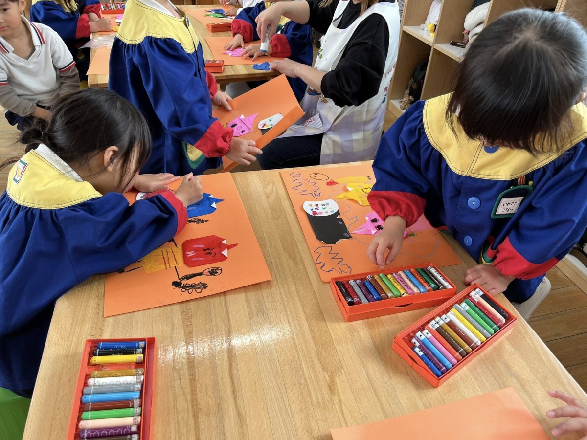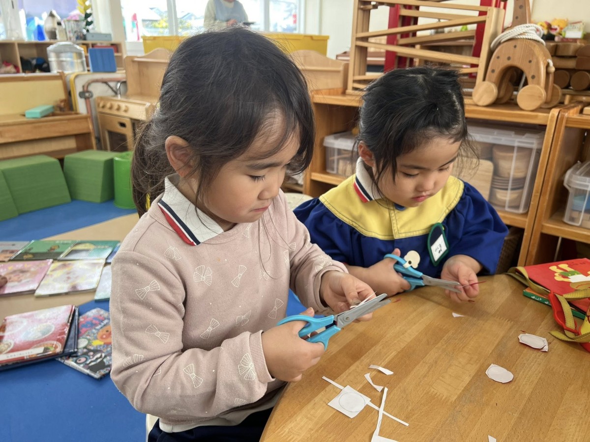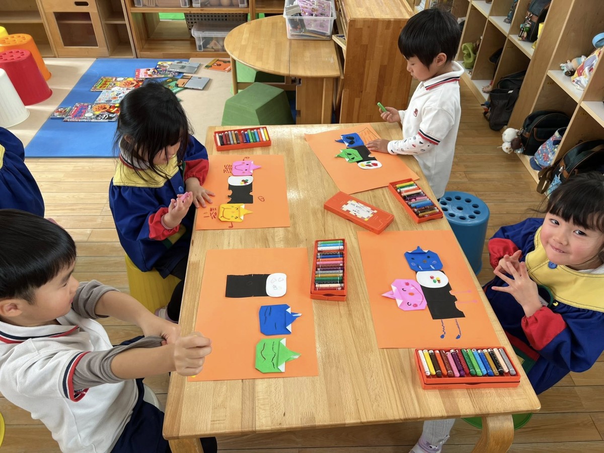 今日は制作をしました。恵方巻きを千切る工程は慣れていなかったのか、難しい子もいましたが頑張ってちぎっていました。周りに自分のイメージで絵を描く力もついてきて、可愛らしい節分制作ができました。