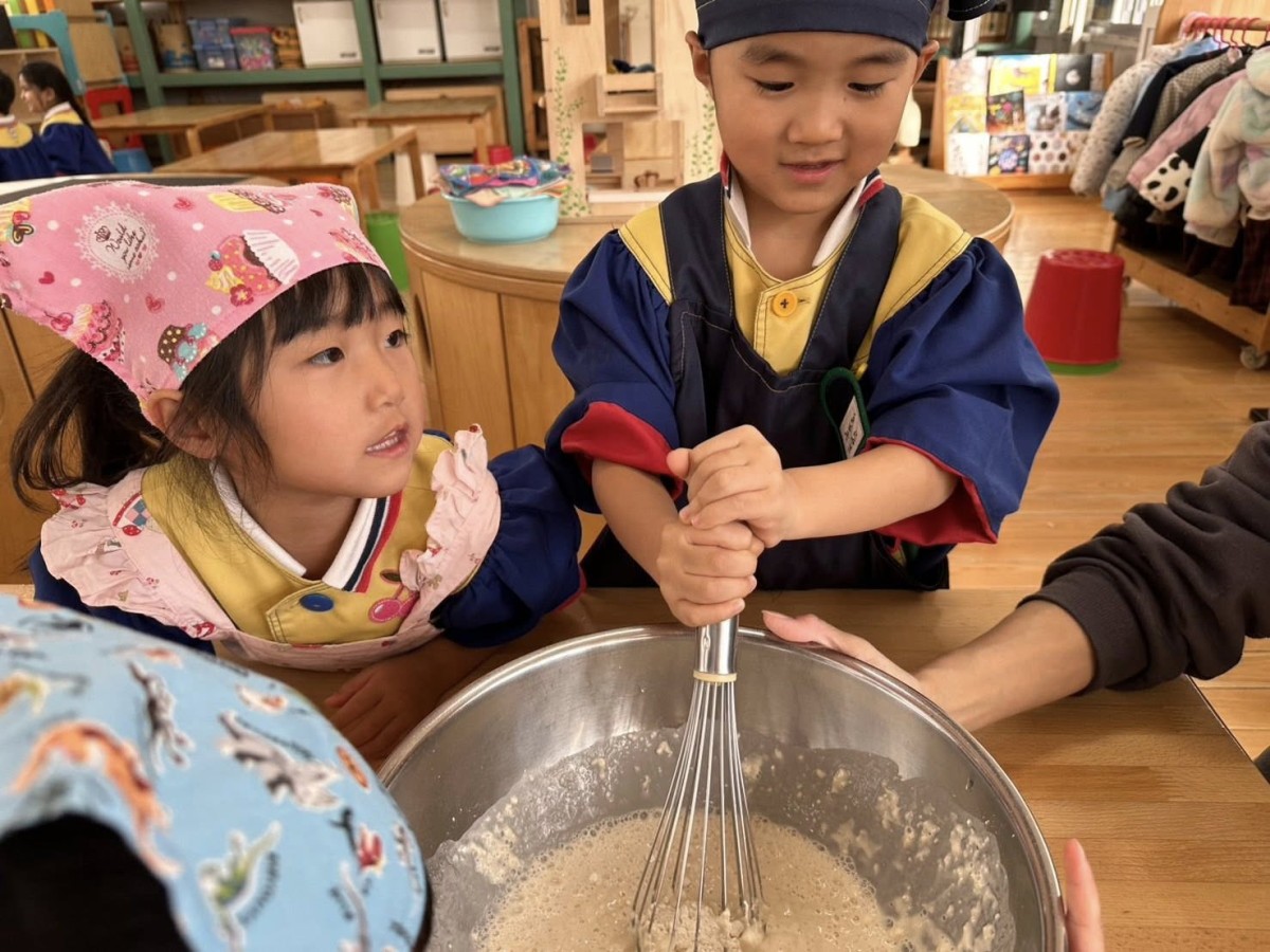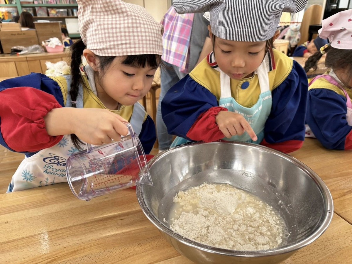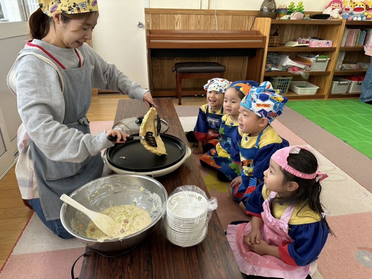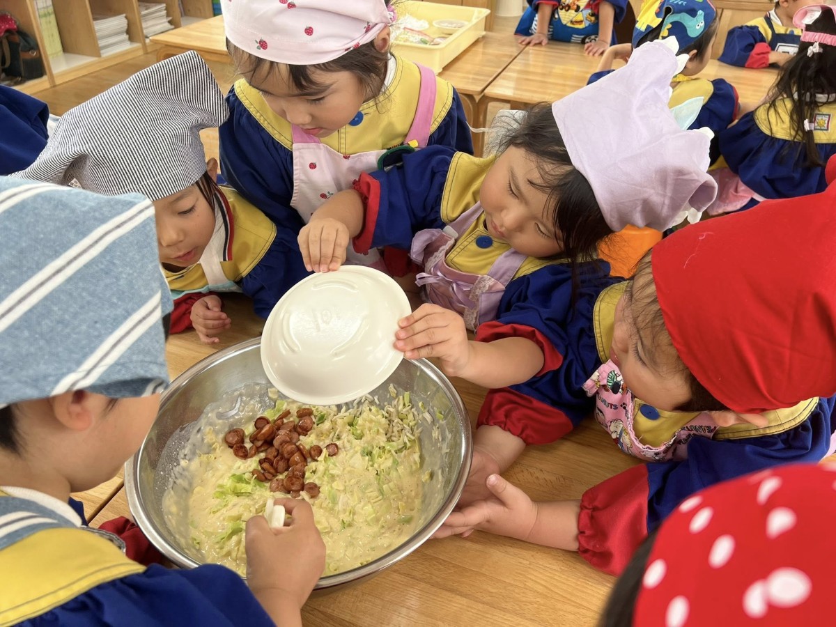 今日は昨日の制作の続きをしました。制作が好きなお友だちが多く、順番が来ると嬉しそうです。午後はクッキングでお好み焼きを作りました。入れるものが多く、たくさん混ぜる機会があったのですが、混ぜる子とボールを押さえる子と協力していました。あか組さんの時よりも美味しく食べられるお友だちが増え、みんなたくさんおかわりしていました♡