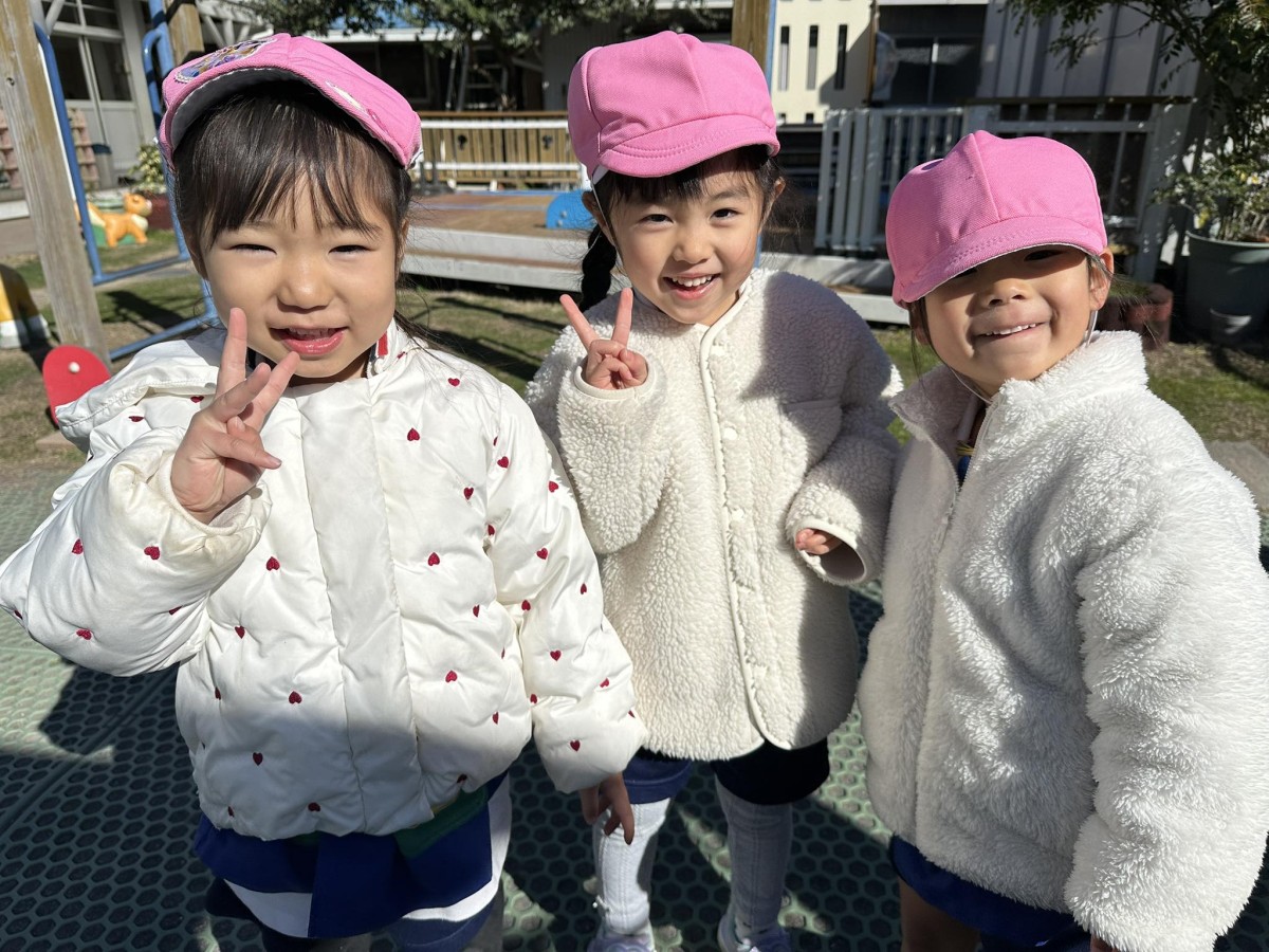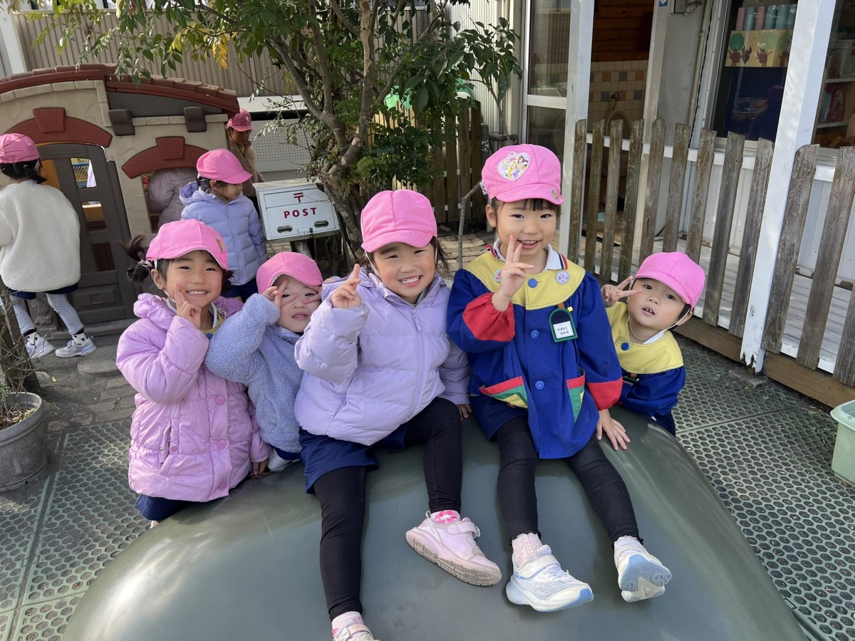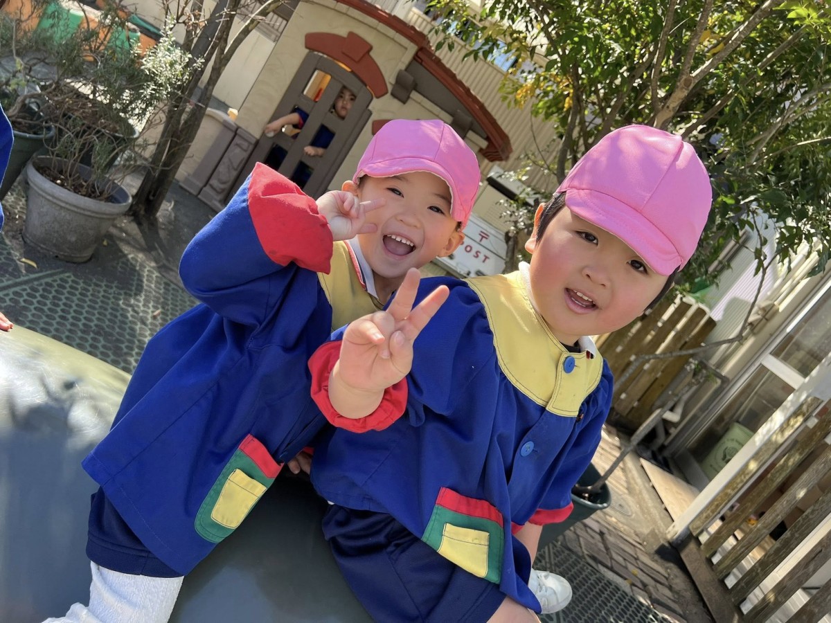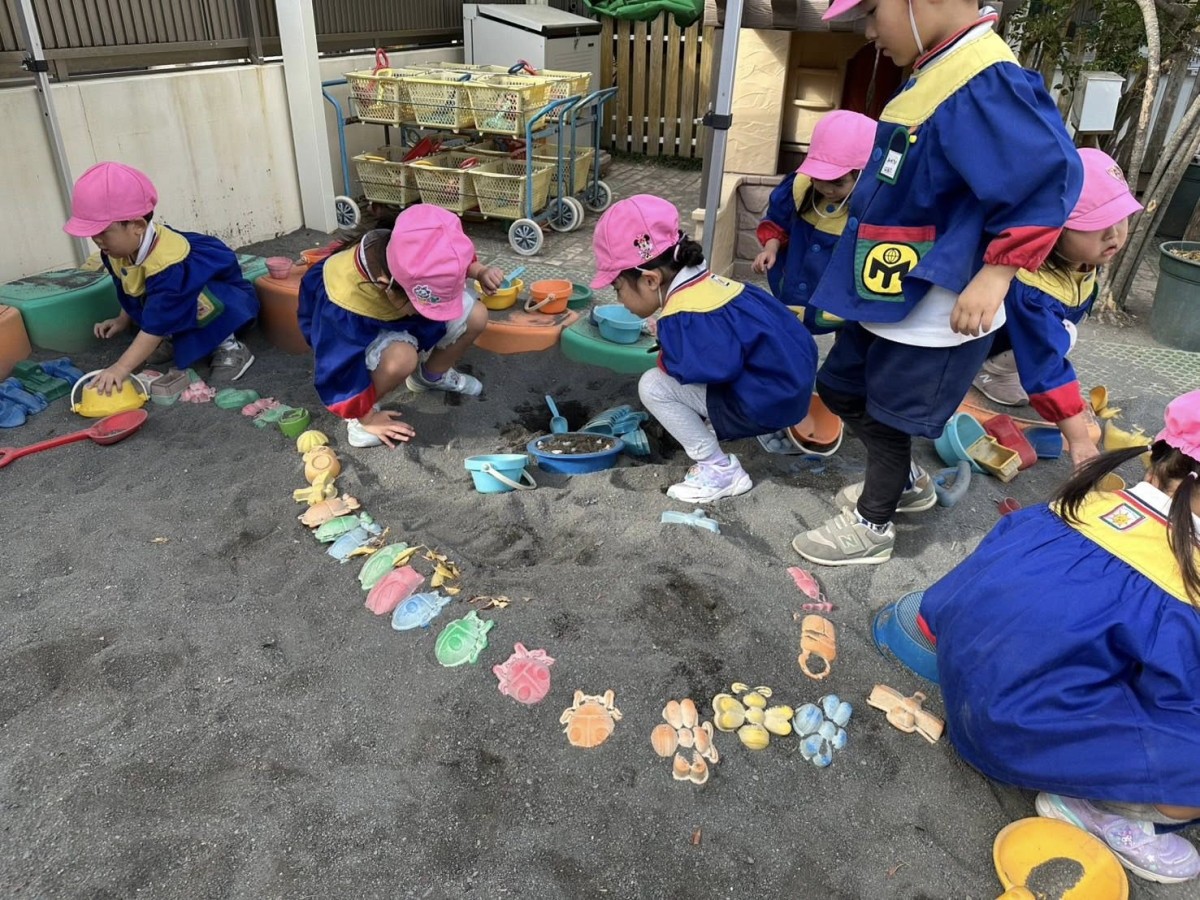 午前中は発表会の練習を頑張りました。午後は園庭で遊びました。葉っぱを集め見立ておままごとをたのしんでいました。また、滑り台の下で何をやっているのかな?と遠くからそっそり見ていると、砂場用玩具を携帯に見立て、インカメで自撮りをしていました。可愛いなー♡と微笑ましい姿でした。