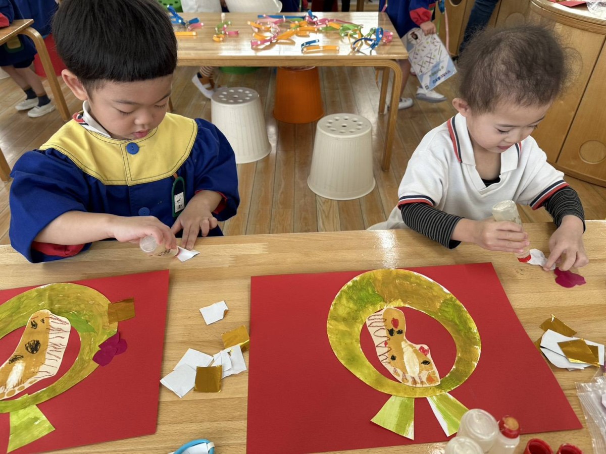| 今日はリトミックがありました。「クリスマスのうたがきこえてくるよ」に合わせて踊りました。みえ先生の振り付けを真似っこし、可愛く踊っていました。午後は園庭で遊んだり、昨日制作したツリーにクレヨンで飾りをつけたり、スパッタリングや指スタンプで雪を表現し、完成させました。 |