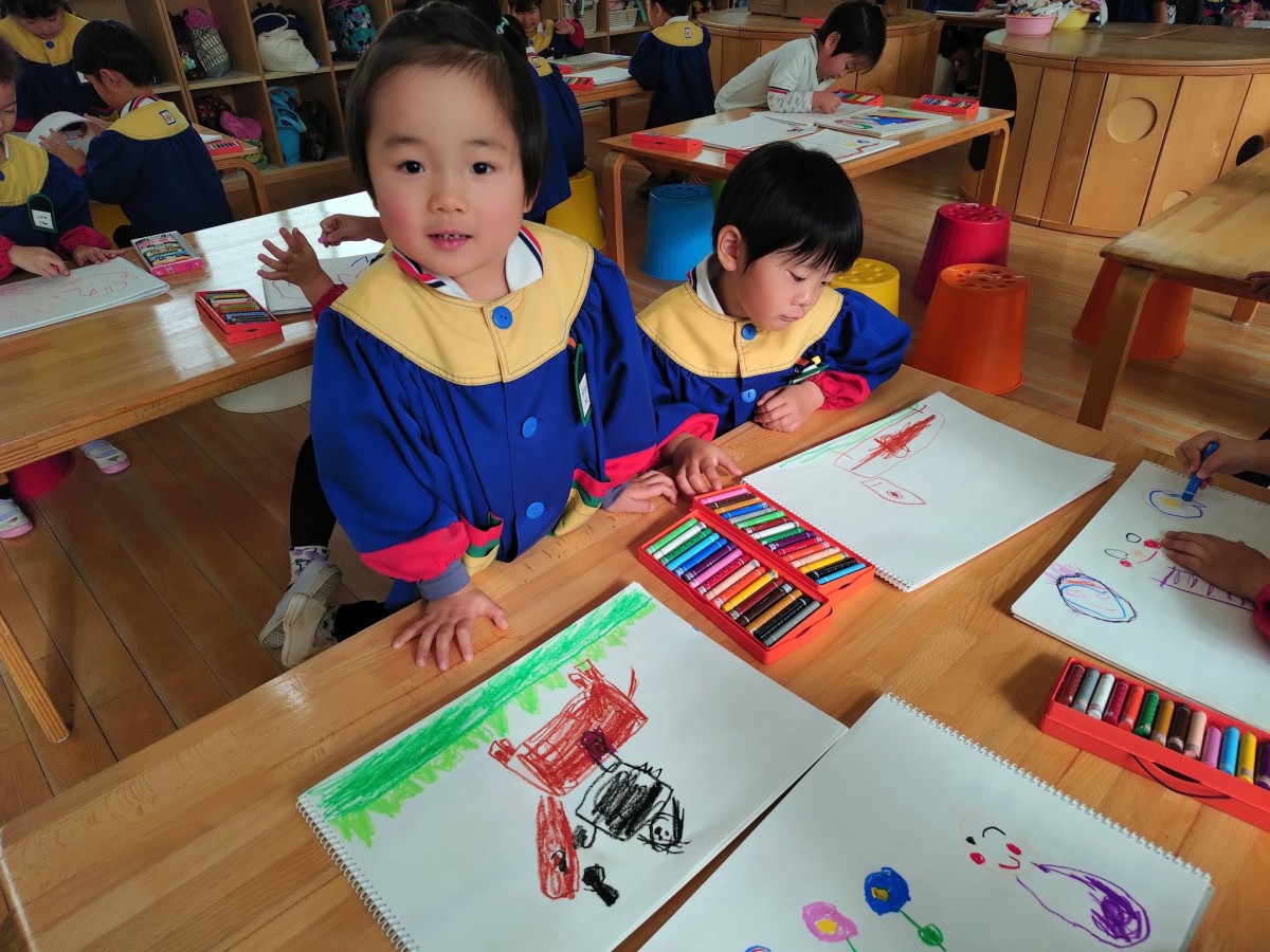 | 今日も午前中はオペレッタの練習をし、午後は園庭で遊んだりワークをしたり、お絵描きをしたりして過ごしました。スケッチブックに体付きのブタとキリン、雲、それから以前描いてみた太陽を描いてみました。筆圧が濃くなってきた子、色を丁寧に塗りつぶせるようになってきた子、それぞれがレベルアップしてきたように思います。今だけの可愛らしい絵にほっこりします。 |