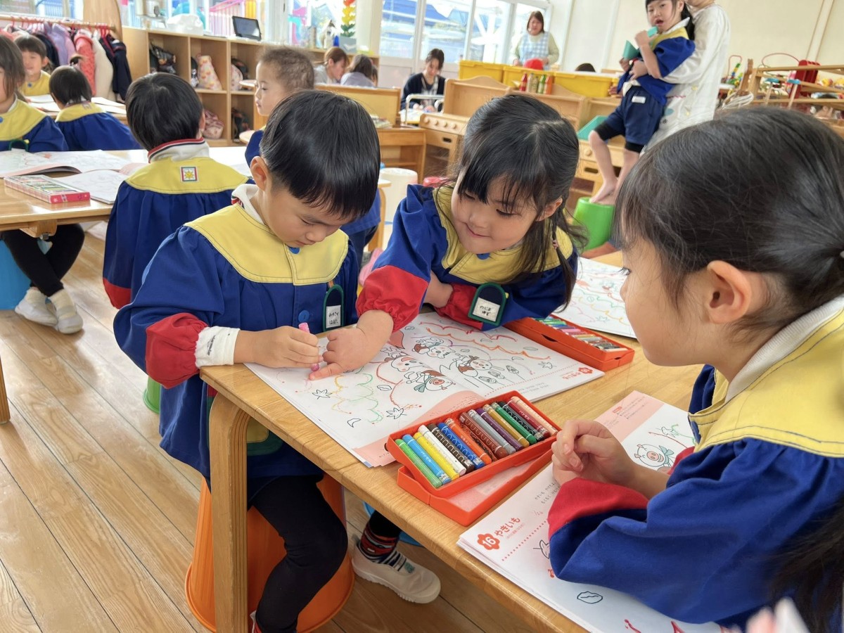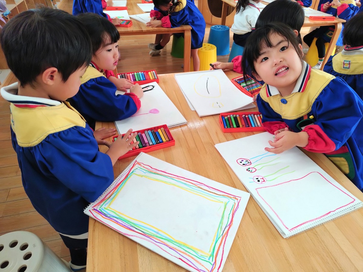 | 今日はお絵かきや園庭遊び、制作をやりました。制作では自分たちで作った飾りにのりをつけて、画用紙に丁寧に貼り付けていきました。どの子も集中した様子で取り組んでいました。お絵かきでは、好きなプリンセスや動物、お友達や家族を描いて楽しむもも組さん。上手に描けていました。 |