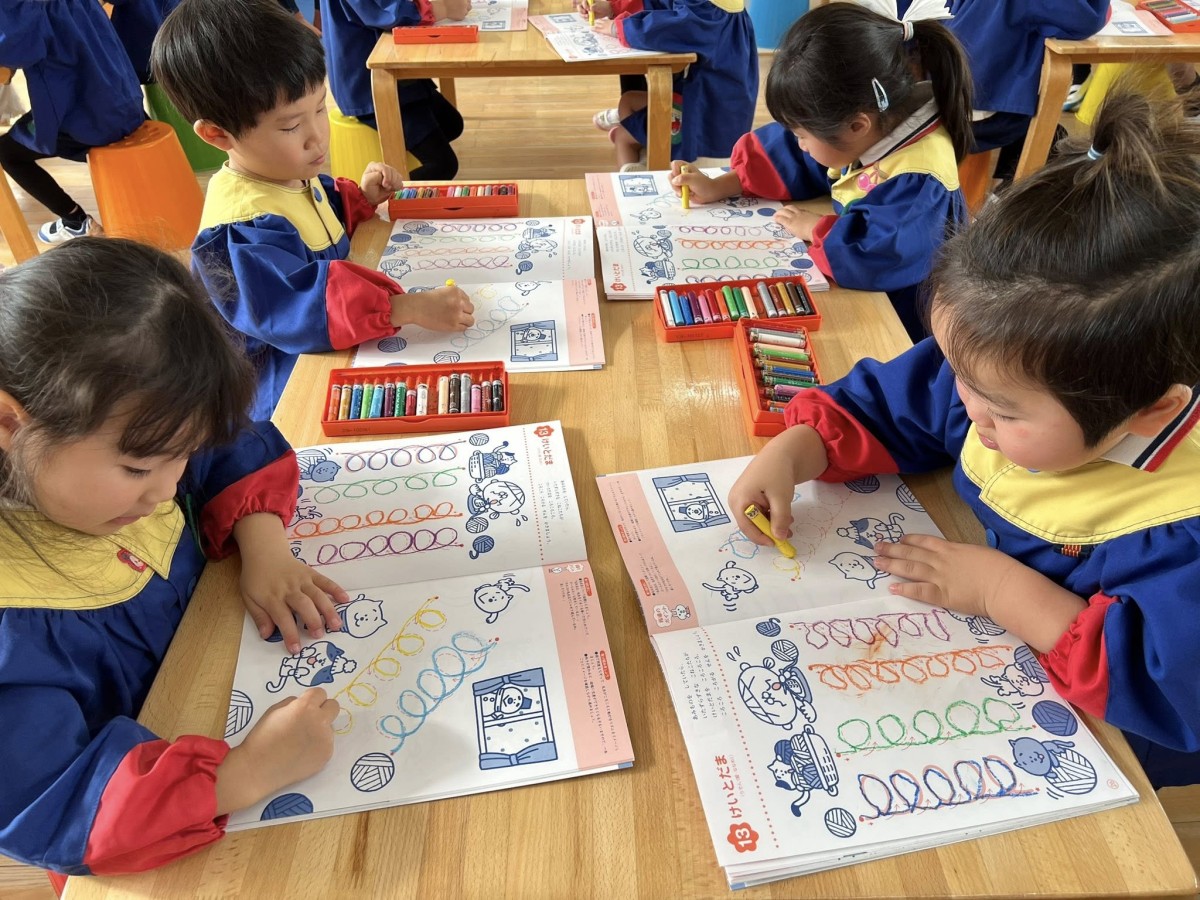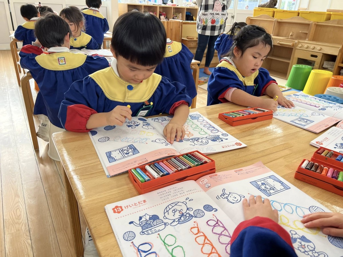 | 今日は線のワークをやりました。くるくるとした線も交わるように書けるようになりました。とても集中して最後まで取り組めました。午後は園庭で遊びました。 |