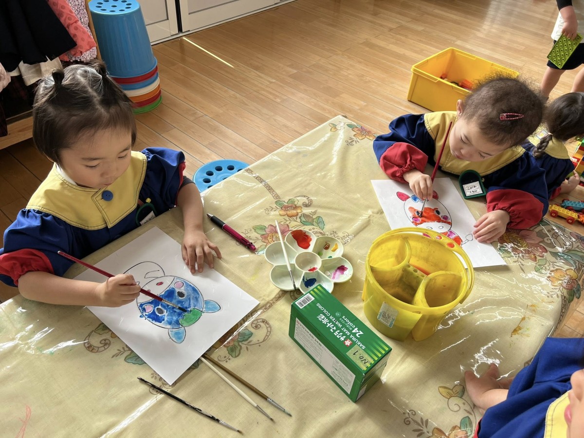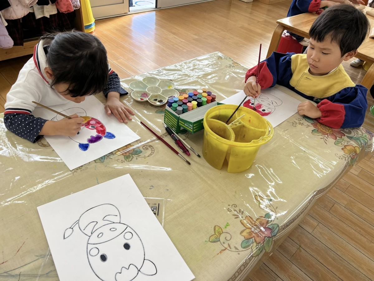 | 今日は凧の色付けをしました。好きな絵の具の色を選んで色をつけていきました。はみ出さないように注意しながら、行っていました。午後は園庭で遊びました。園庭で遊ぶのが大好きなお友だちは、昼食を終えると「外行く?」と楽しみにしています。 |