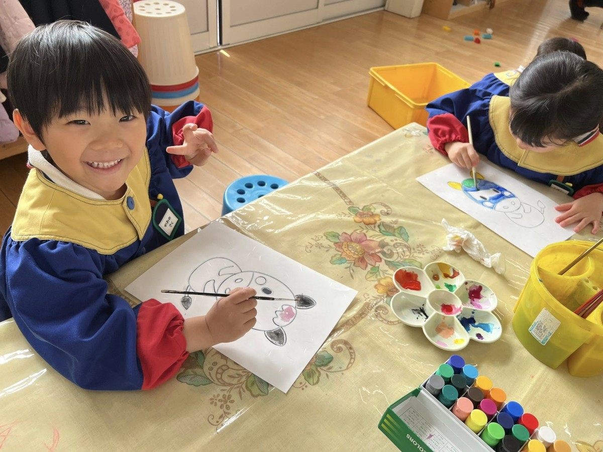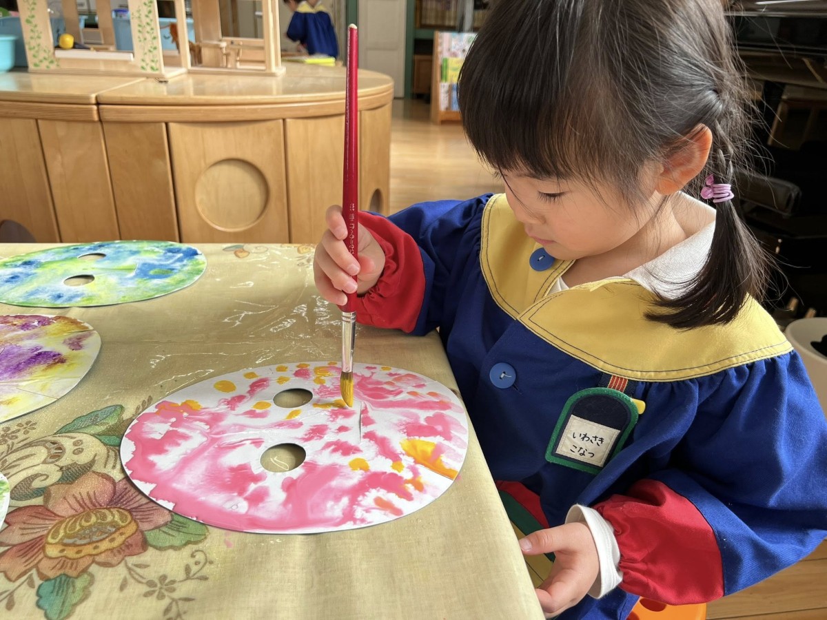 今日は白いクレヨンで模様を付け、その上から絵の具を塗り弾き絵という技法で、ペロペロキャンディーを作りました。好きな色で色付けをするのが楽しいようで、とっても集中して取り組んでいました。乾いたキャンディーを手に持つと、舐める真似をしたり可愛らしいもも組さんです。