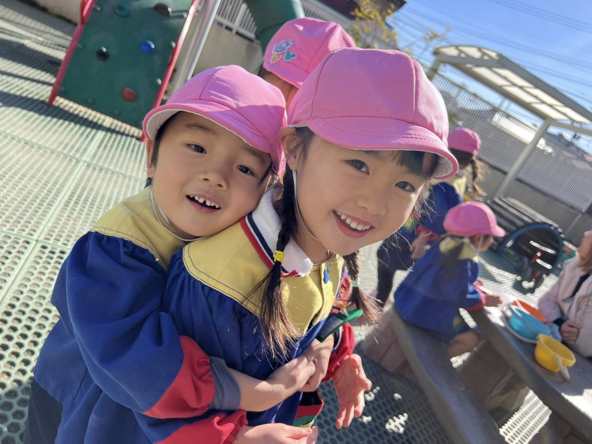 | リトミックがありました。手遊び「やさいのうた」では、もも組さんの好きな手遊びの1つで、とっても楽しそうに行っていました。また、「カエルの体操」では、とっても可愛く踊ってくれました。午後は園庭で遊びました。今日はあお組さんも一緒の時間に園庭に出ていて、たくさん甘えたり可愛がってもらいながら楽しく過ごしていました。 |