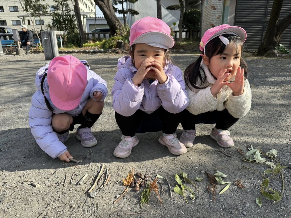 | 今日は八雲神社に初詣に行きました。みんなでお参りをし、遊んできました。自然物を集めてお店屋さんを開くお友だち。「いらっしゃいませ〜」とお店を切り盛りしていました。どんどんお店屋さんが増え、商店街のようになっていました。「お会計は?」「PayPayで」も今時ぽくて可愛かったです! |