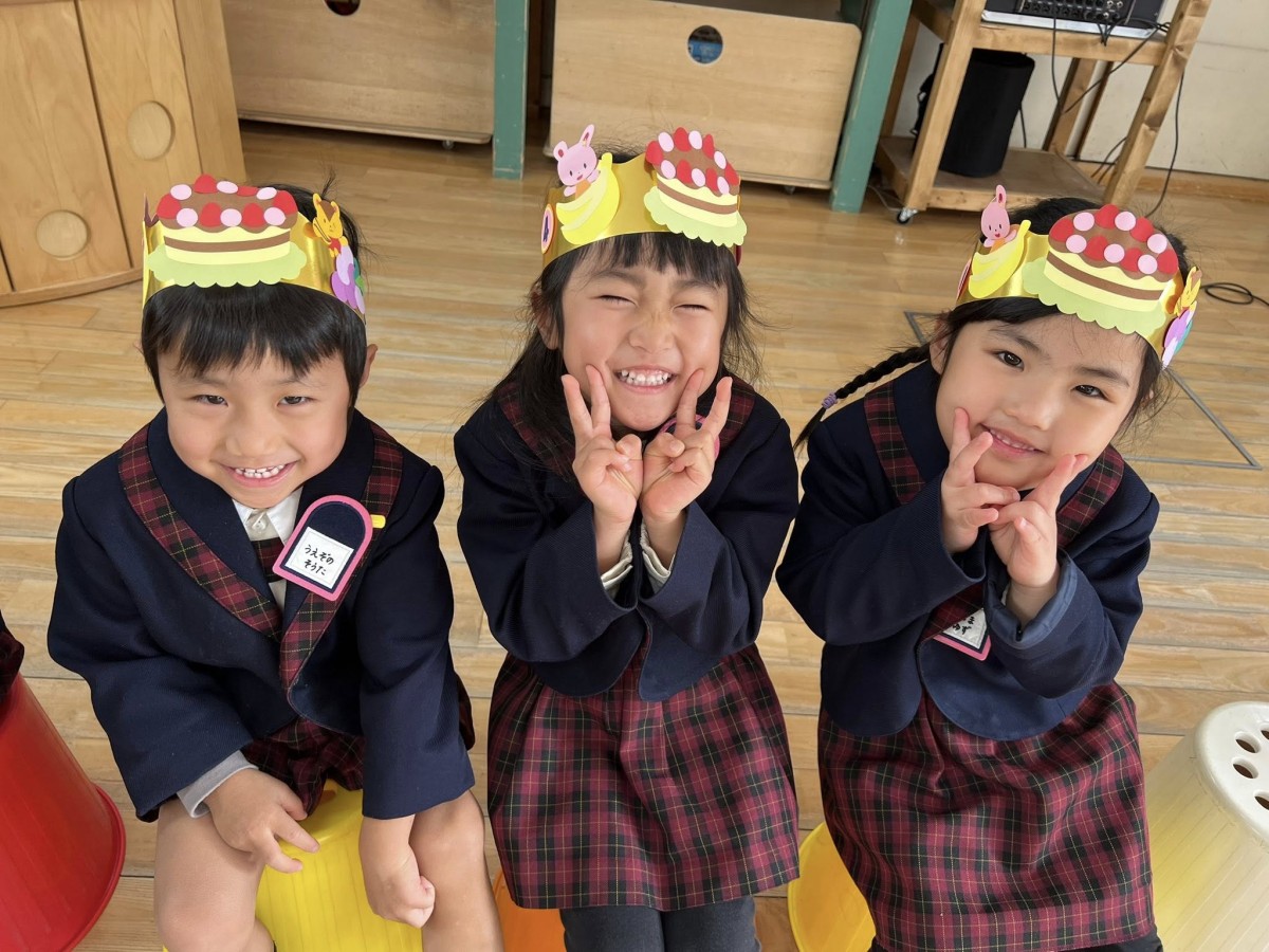 | 今日はお誕生会がありました。とっても嬉しそうに冠を被り、みんなで楽しんだお誕生会になりました。午後はお遊戯の練習をしました。振り付けを覚えようと真剣なお友だち。楽しく練習ができました。 |