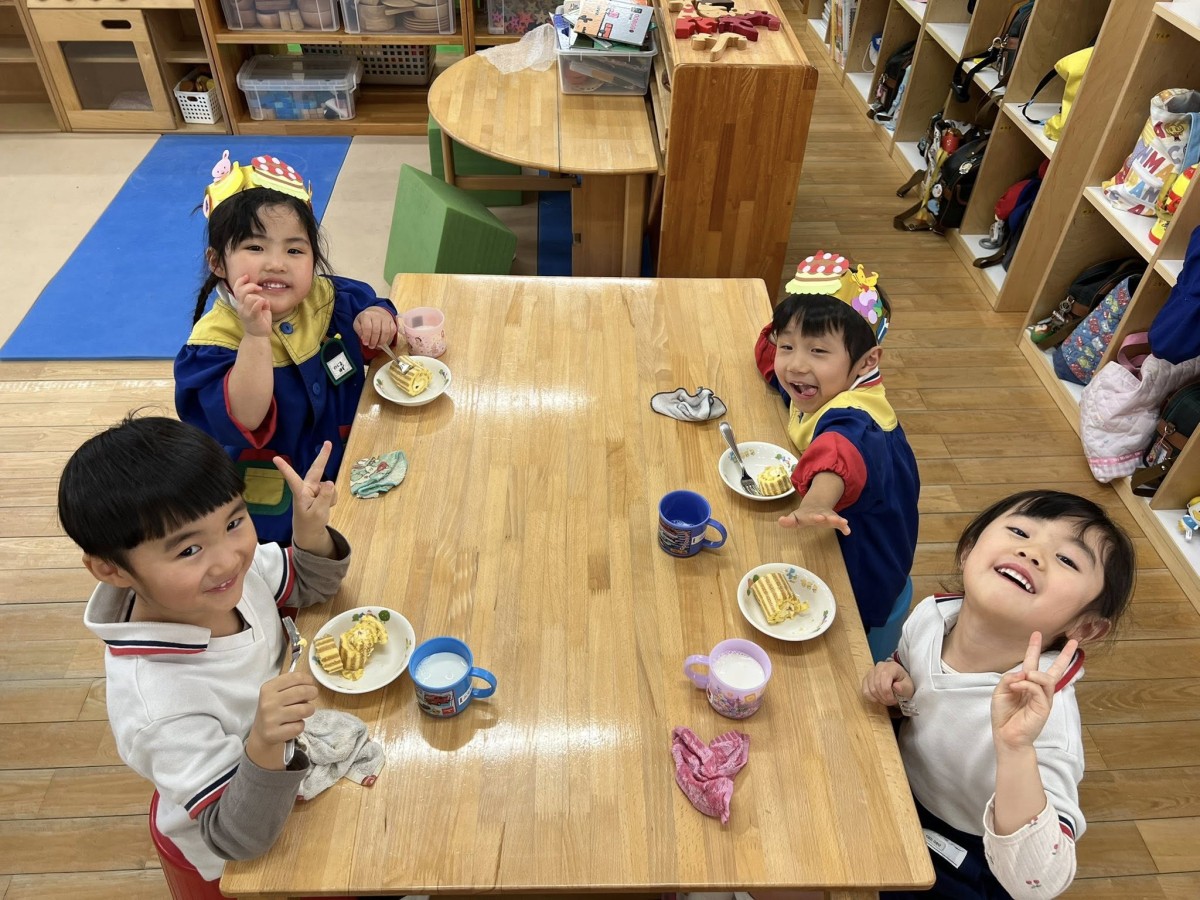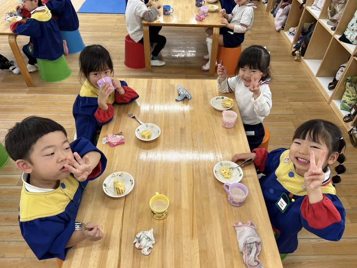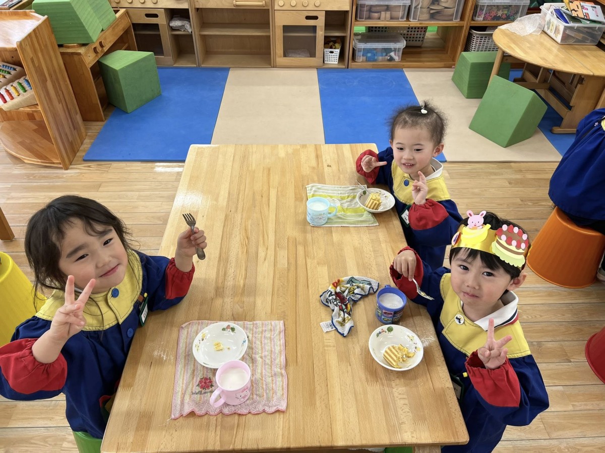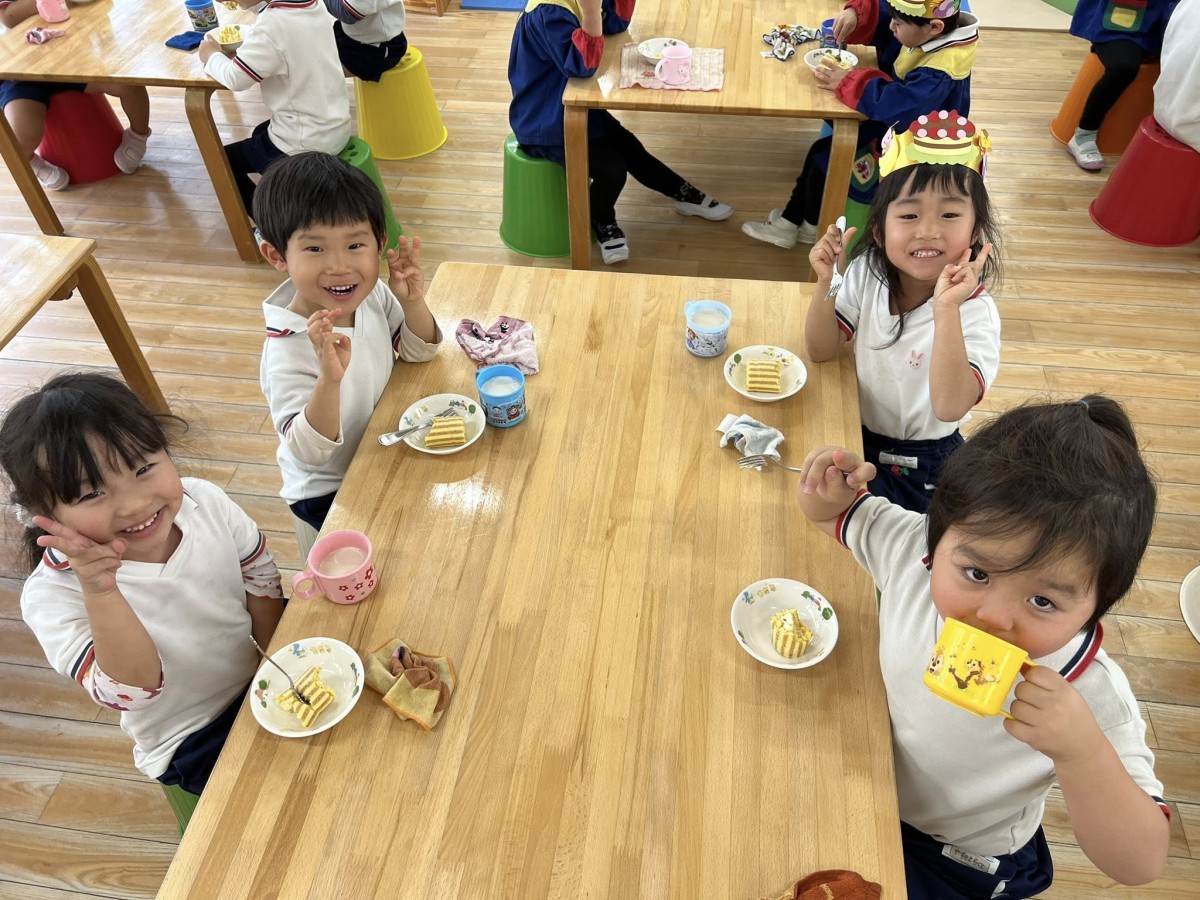 | 今日はお誕生会がありました。「緊張しちゃった♡」と言っていましたが、とってもいい表情。みんなにお祝いしてもらい、嬉しそうでした。おやつはロールケーキ!ミルクティーも大好きなお友だちが多く、おかわりをしていました。友だちと楽しくおしゃべりしながら食べています。 |