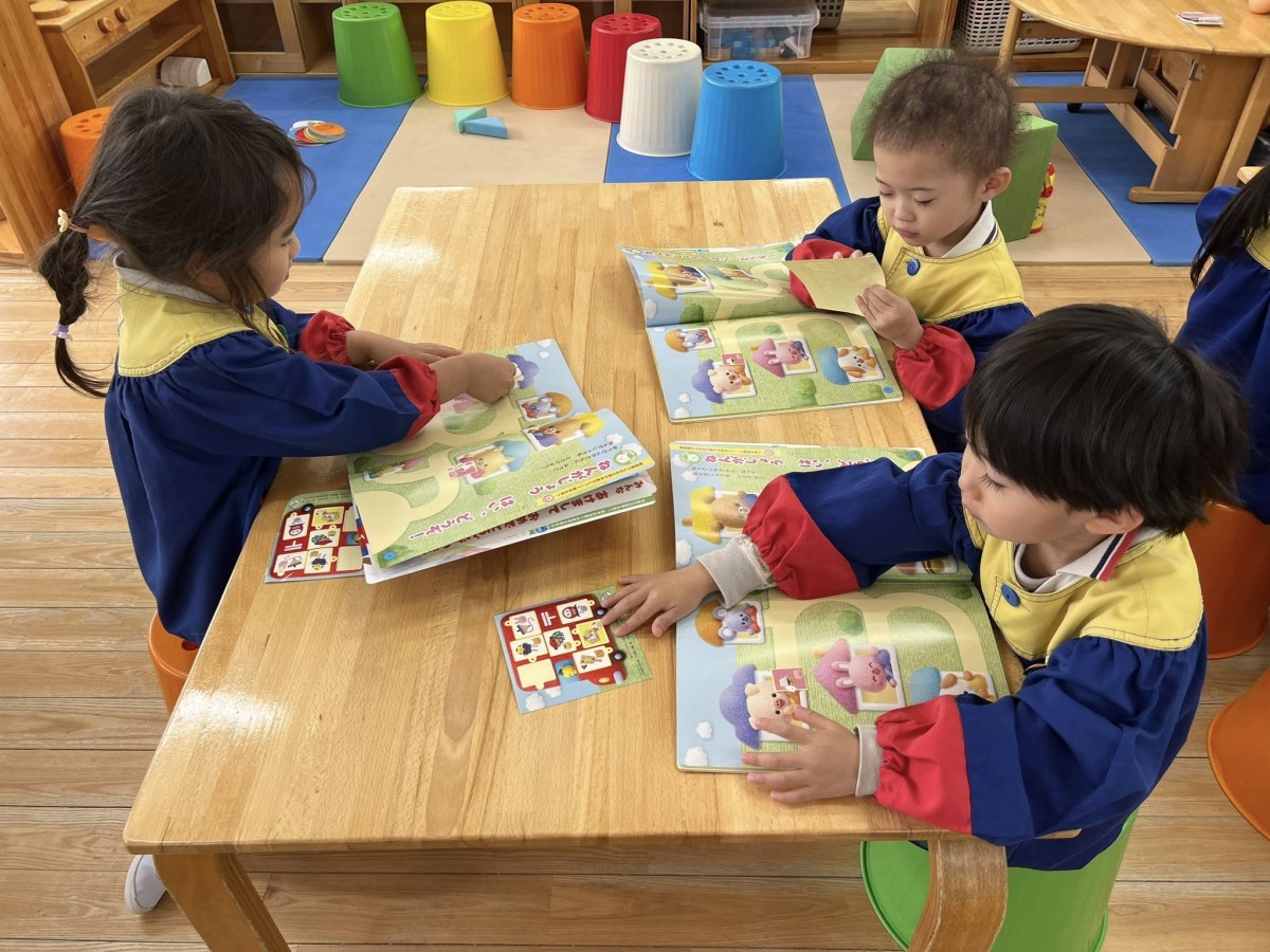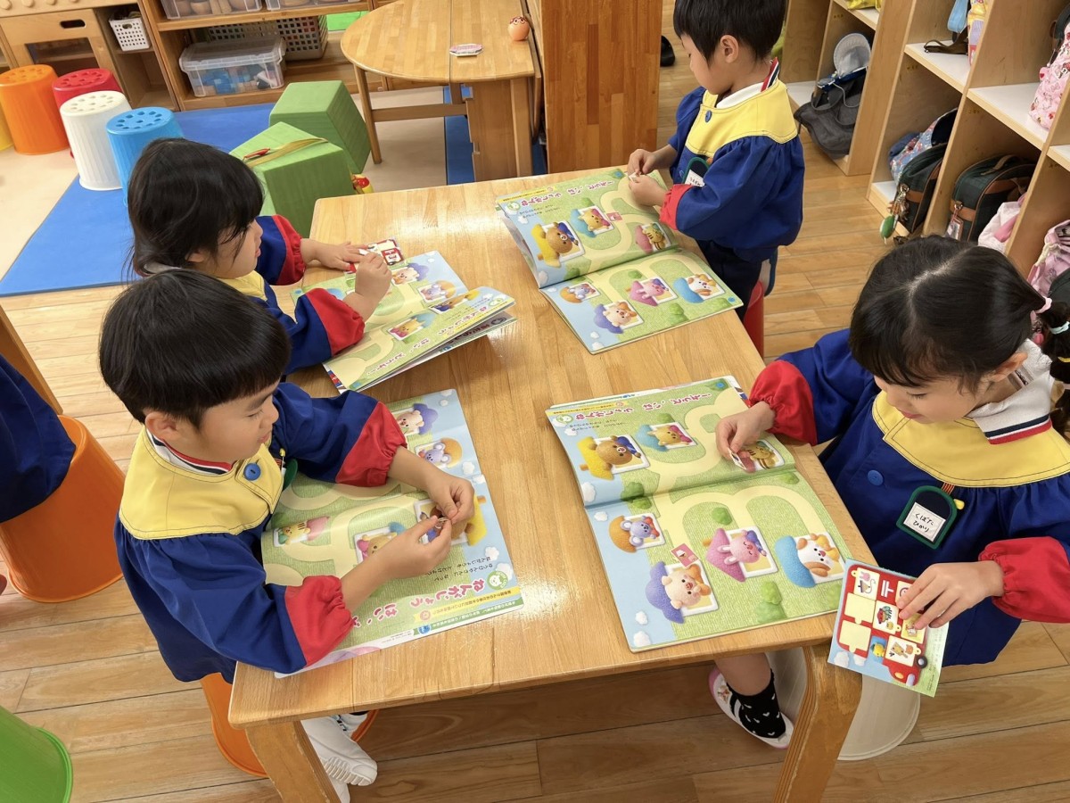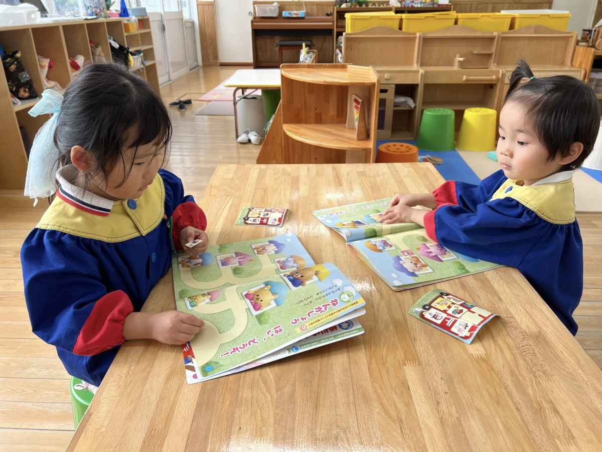 今日はリトミックがありました。「ちょうちょ」になりきり表現したり、「車」に変身したりしました。みんな楽しそうに変身しています。午後は月刊誌を読みました。シールのページが大好きで、どこにしようか悩みながらも貼っていました。