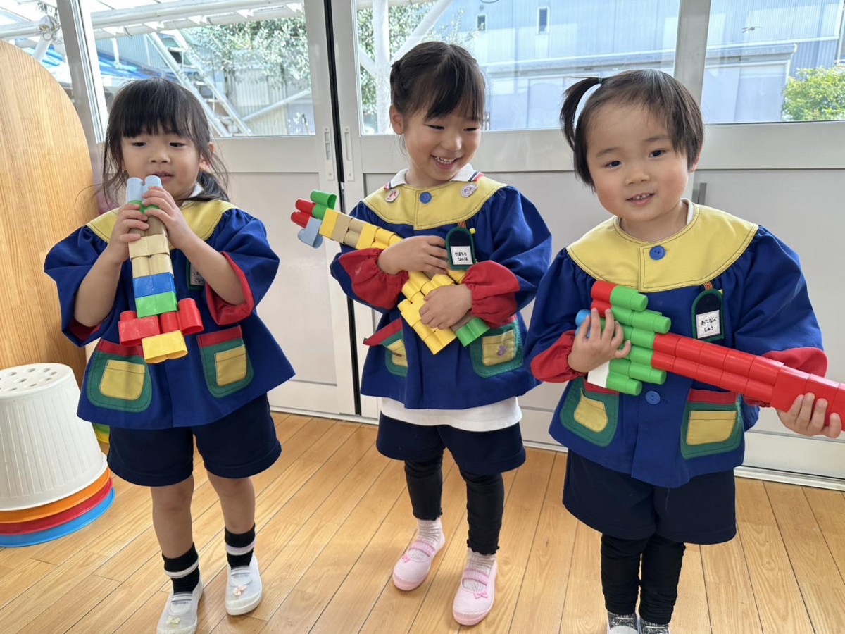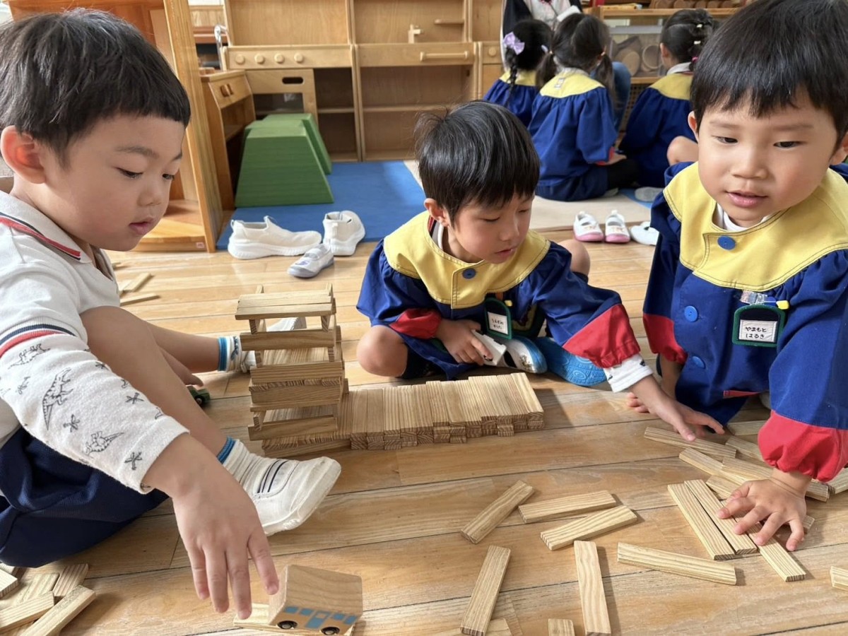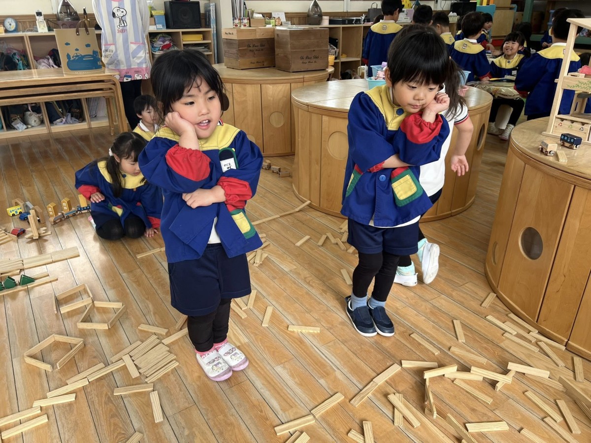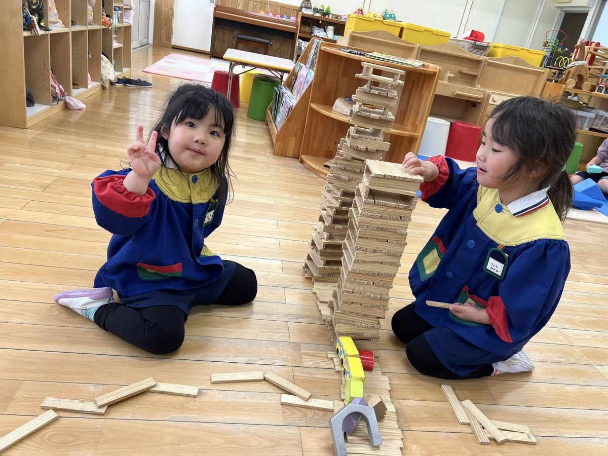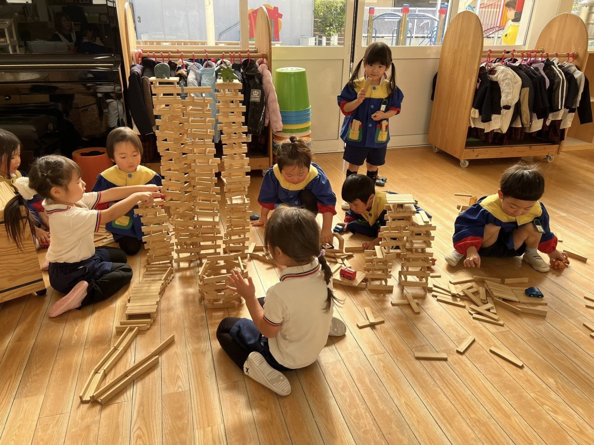 | 今日は発育測定をした後にカプラで遊びました。高く積み上げることに集中したり、友だちと「なかよしハウス」を作り、オペレッタをしている子もいました。午後は園庭で遊びました。園庭でも、他学年のオペレッタを楽しそうにやっていました! |
