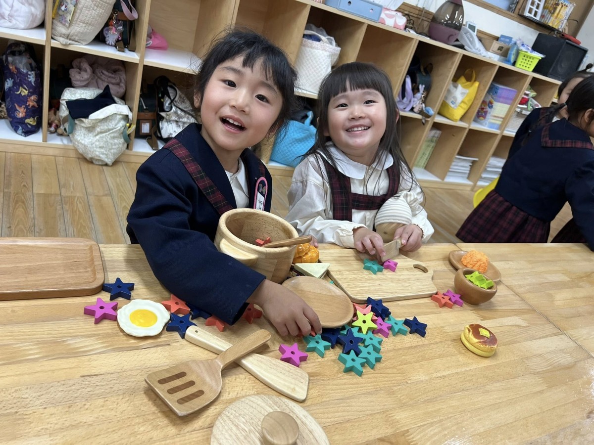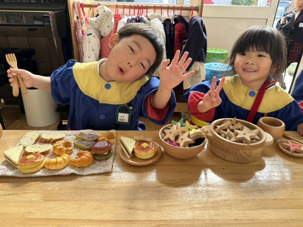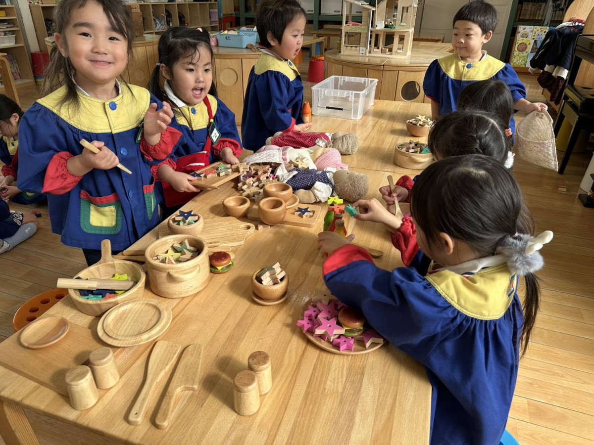 | おままごとをして遊びました。星の玩具を食材に見立てお料理に夢中です。「これ食べてくださーい」と次々に料理が運ばれてきます。「熱々ですよ」や「スプーンを使ってください」など、なりきっている姿が可愛いです♪ |