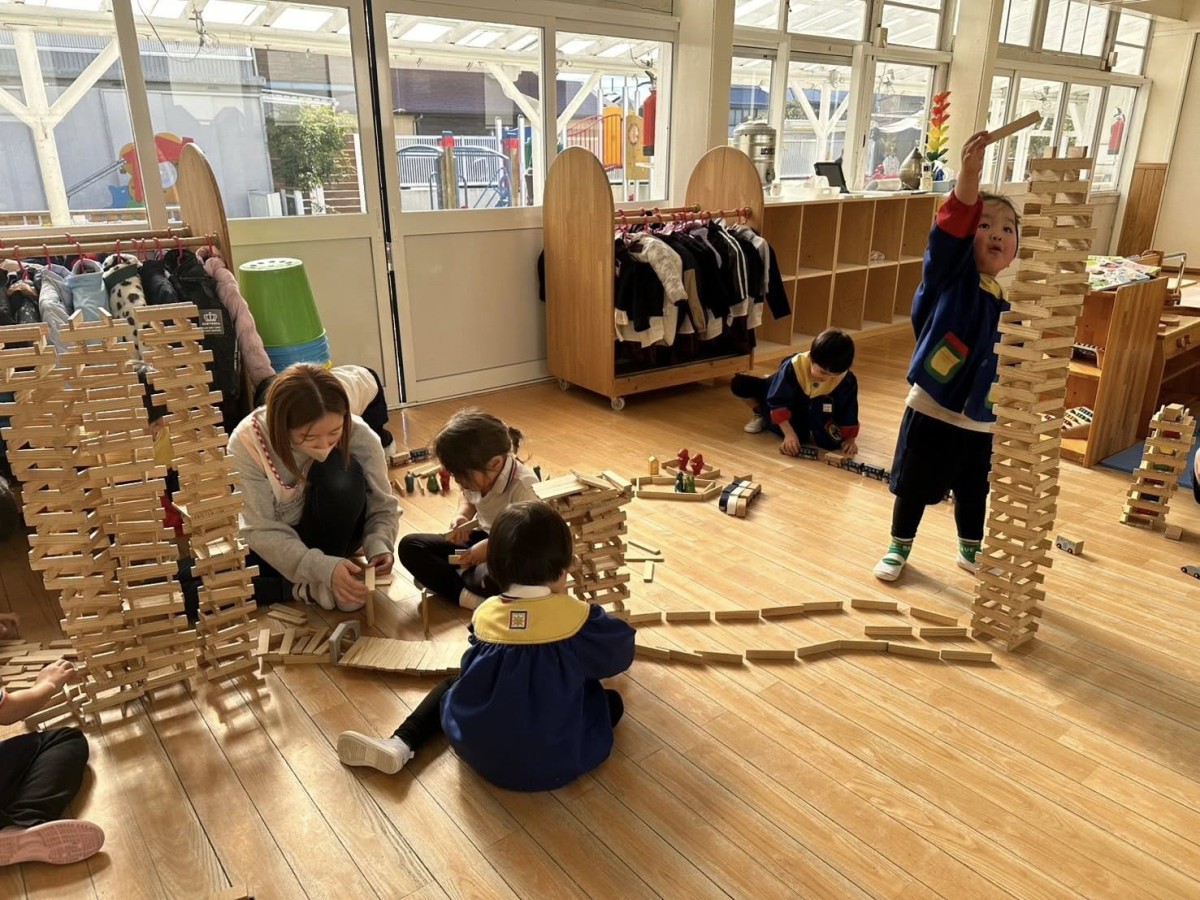 この前カプラで遊んだ時の続きをやりたいとお願いがあり、時間たっぷりの中遊びました。友だちと協力して形を作っていきますが、どうしたら崩れないように詰めるかや、共通のイメージを言葉にしながら作っていました。ふとした時に崩れないように周りに配慮しながら移動する子もいました。出来たものを繋げたりし、もも組さんのお部屋が1つの街のようになっていきました。