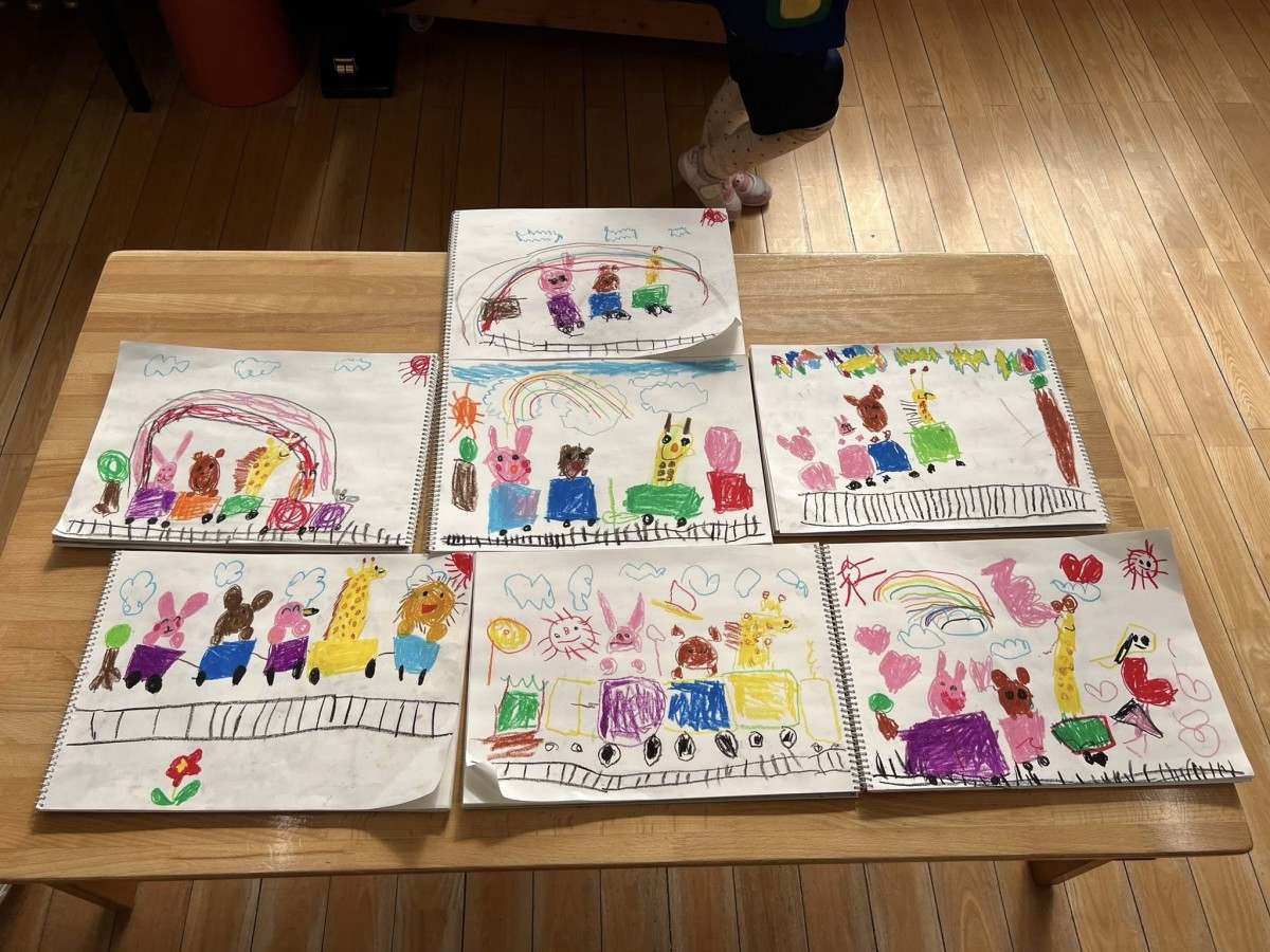 | 今日は線のワークをやった後に、絵を描きました。ワークではクレヨンを紙から離さずに繋げて線をかけるようになったり、線の上を書こうという意識が強く出ているように思いました。絵は、うさぎとくまときりんが電車に乗っているところは一斉に行い、木や虹、雲などは子どものアイデアで周りを描き、完成させました。とても可愛い絵ができました。 |