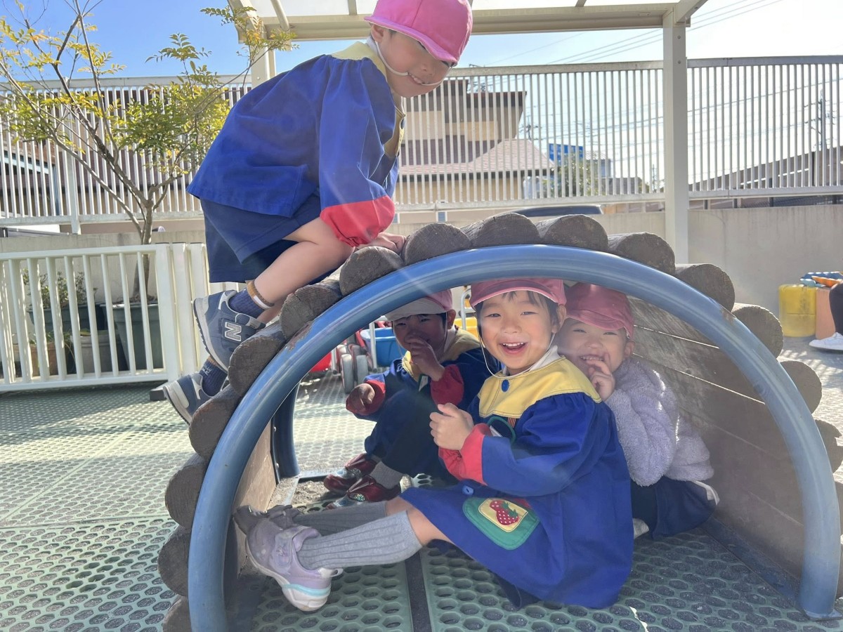 | 今日は運動会の種目の練習をしました。トンネルをくぐったりキャタピラをしたりみんな楽しく練習できました。午後は園庭で遊びました。 |