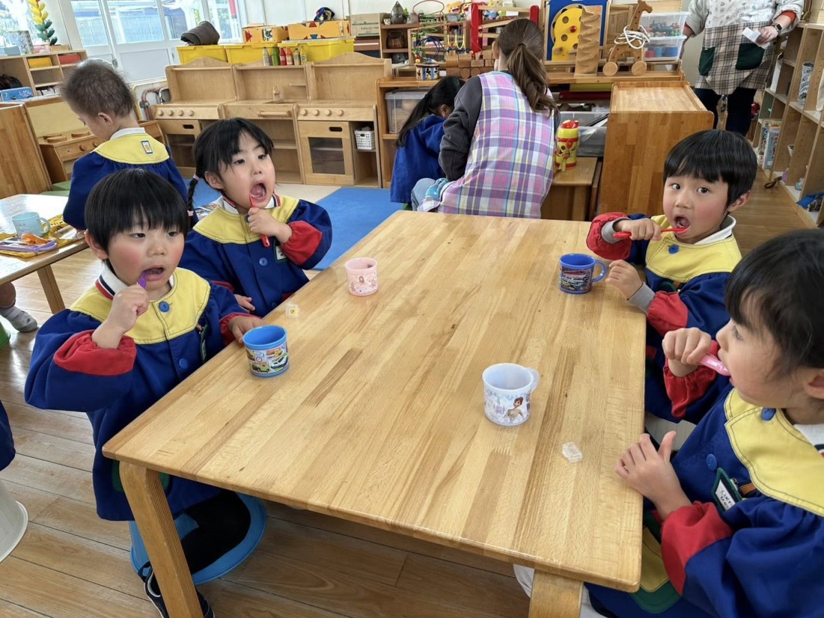 | 今週から食後の歯磨きが始まりました。音楽に合わせて一生懸命歯を磨いています。今日は節分。朝から「いつくる?」「ちょっと怖いよ〜」など、ソワソワなもも組さんでした。対面した時は怖くて涙が出てしまったお友だちも、鬼の正体がみなみ先生で一安心。怖がっている友だちにそっとトントンとしてくれるお友だちもいて、優しさを感じました。 |