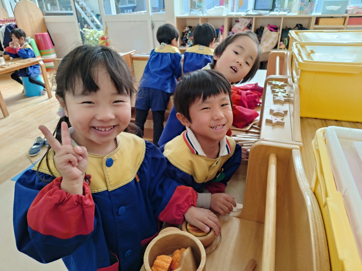 | 今日はおままごとをしました。お人形にご飯を食べさせたり、友だちに振る舞ったりして仲良く遊んでいました。この頃、お弁当箱を自分で結ぶことに挑戦しているお友だちが多くいます。毎日の積み重ねで少しずつできる喜びを感じている子も出てきました。こっそり自主練している子もいて、こちらもこっそり見守っていますが、できた時の満足そうな表情がたまりません♡ |