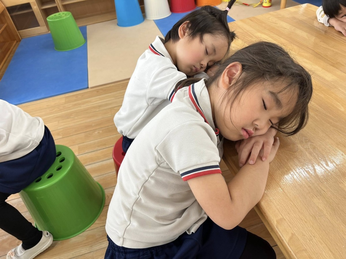 | 今日は園庭で遊びました。ピクニックシートの上では道路を作って車を走らせたり、ご飯屋さんの切り盛りに大忙しのお友だちでした。戸外が気持ちよく、たっぷり遊んだので休憩のほんの数分の間に寝てしまった子もいました。気持ちよさそうです。 |