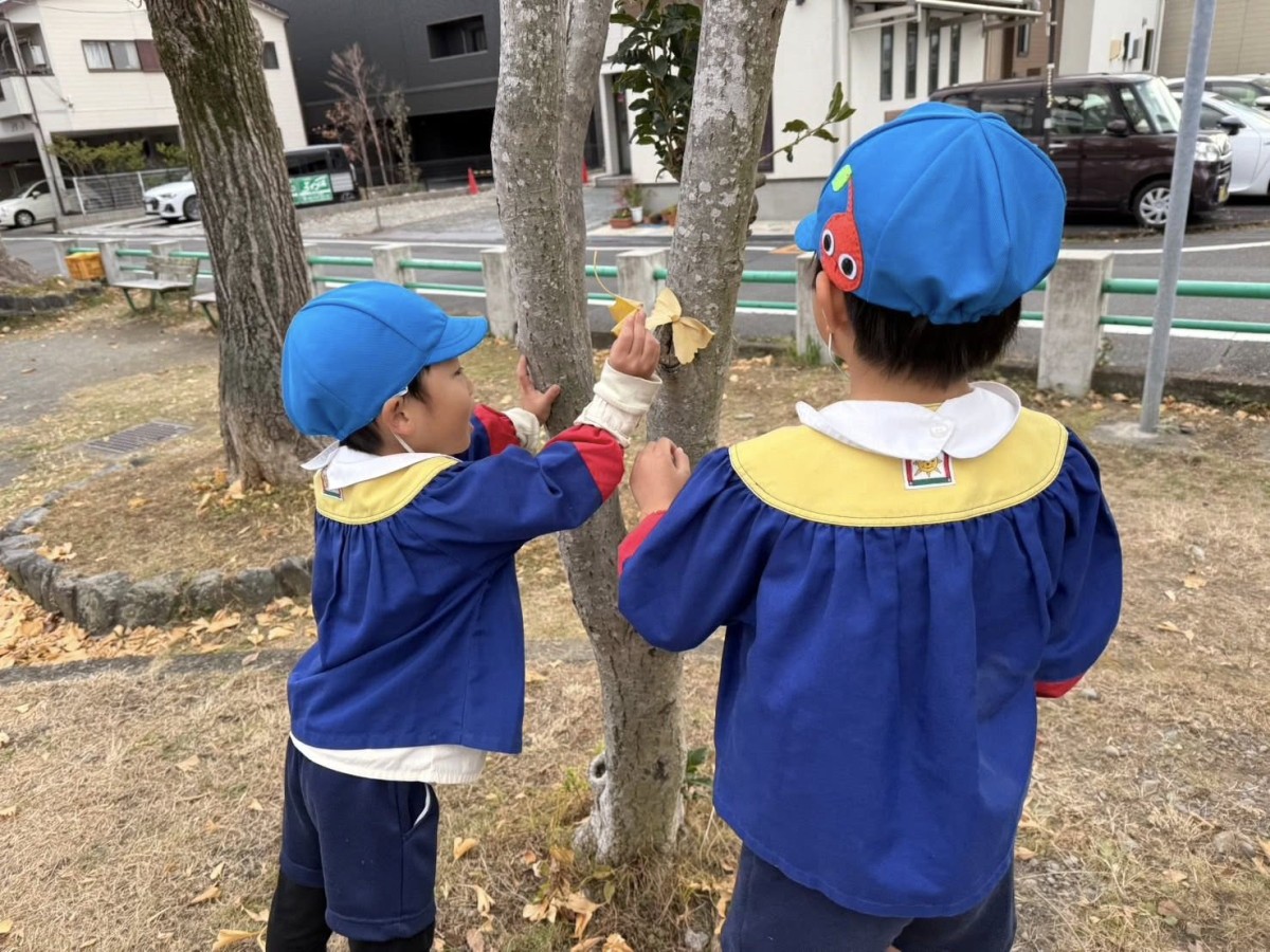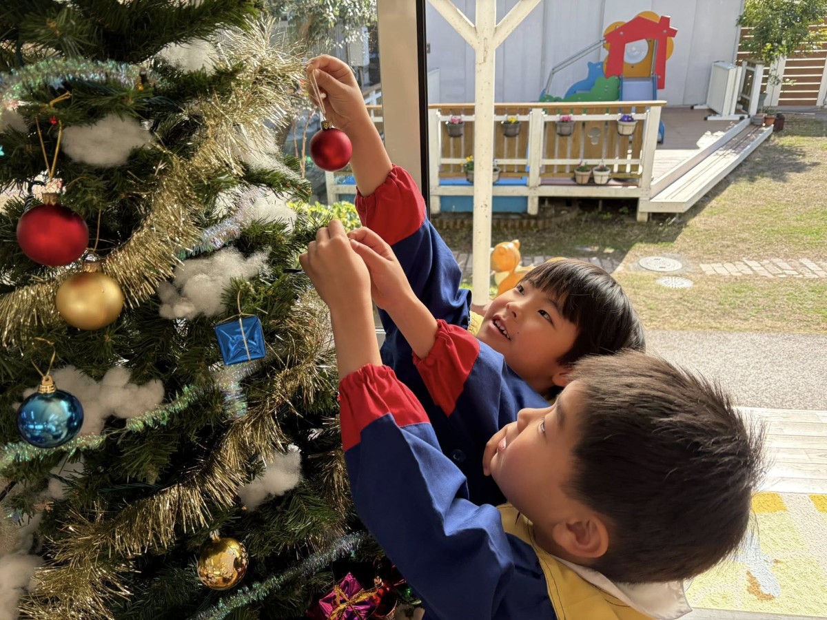 午前中はまなびきっずでお勉強をしました。12月のカレンダーを見ながら、数字を書いたりシールで文を考えたりしました。その後は先生たちが組み立ててくれたクリスマスツリーに飾り付けをしました。「どこに飾ろうかな」「クリスマス楽しみだな!」と楽しそうな会話が聞こえます。午後はもも組さんと一緒に公園までお散歩に行きました。最後はリレー対決!盛り上がっていました!