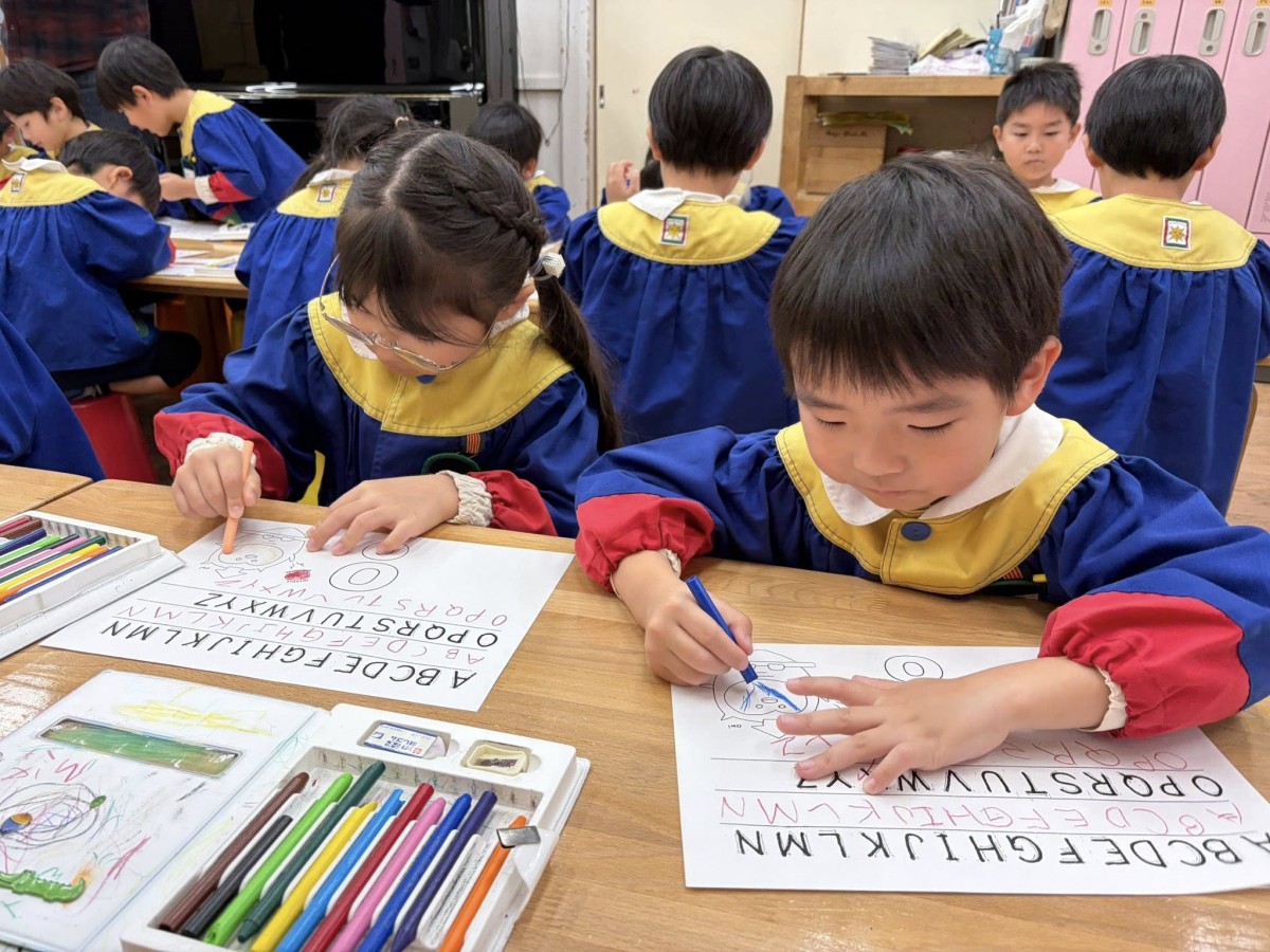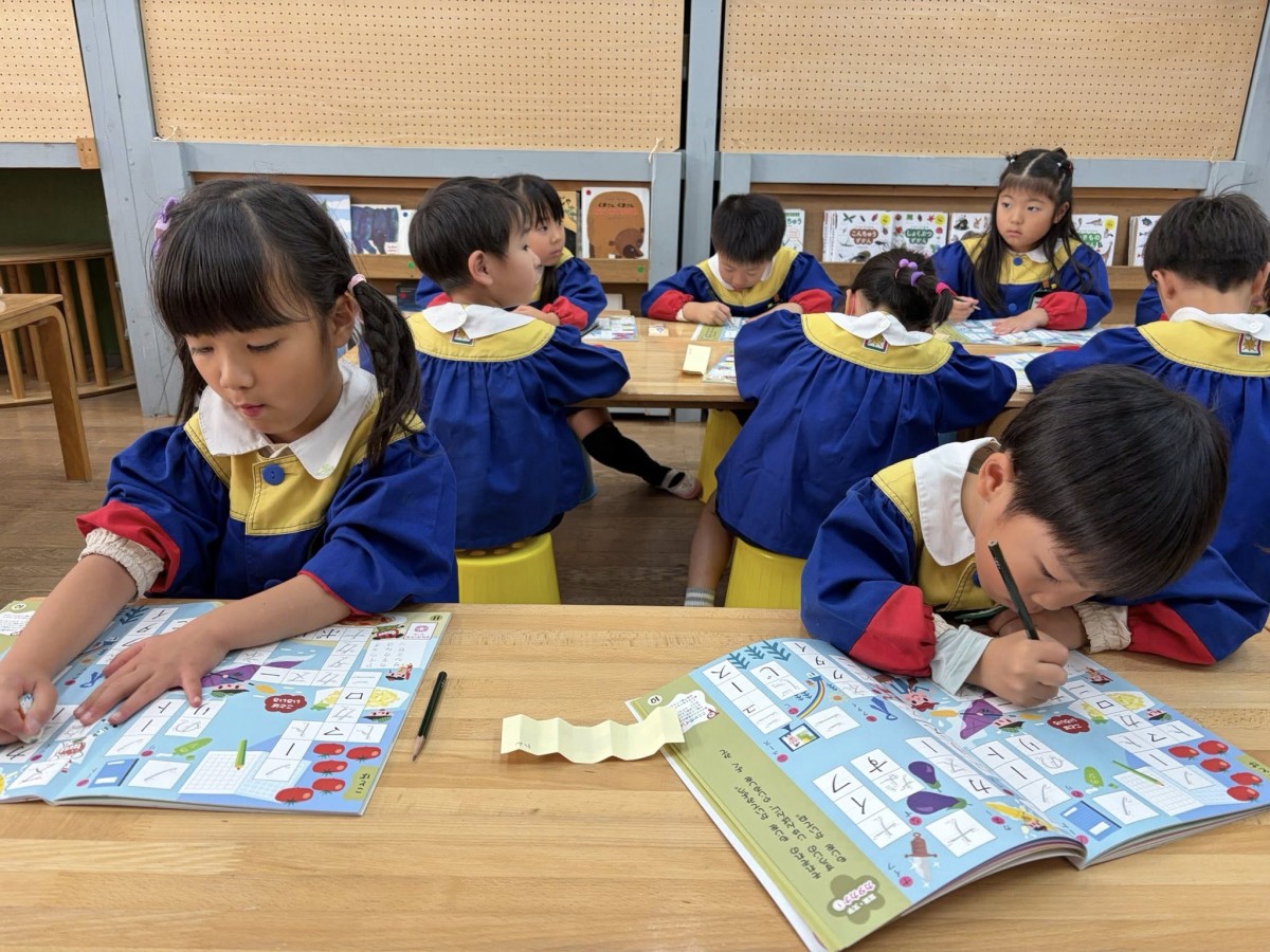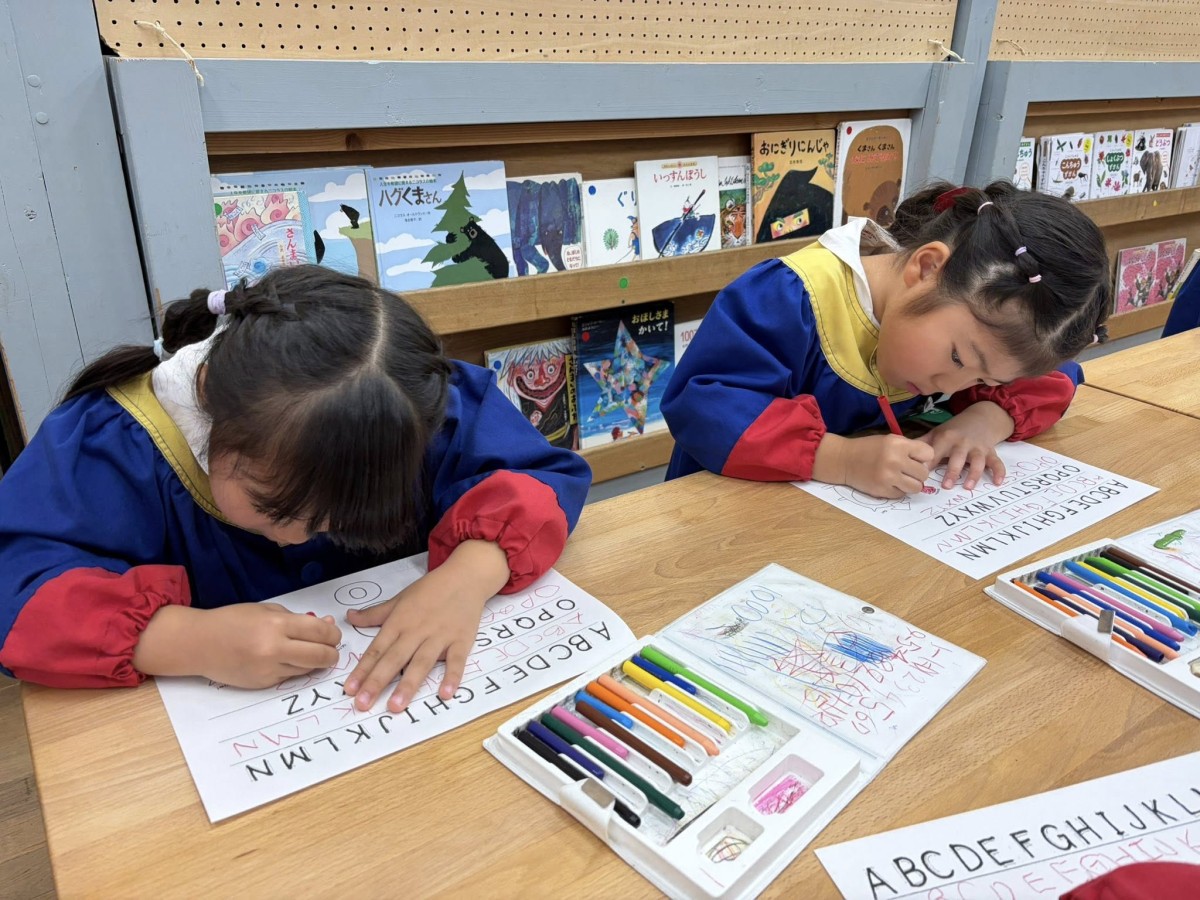 午前中はオペレッタの練習をしたあと、英語がありました。100まで数える練習やビンゴゲームをしました。果物を英語で言ったり、色を英語で言ったりしました。午後は、園庭で遊んだあと、お遊戯の練習をしました。