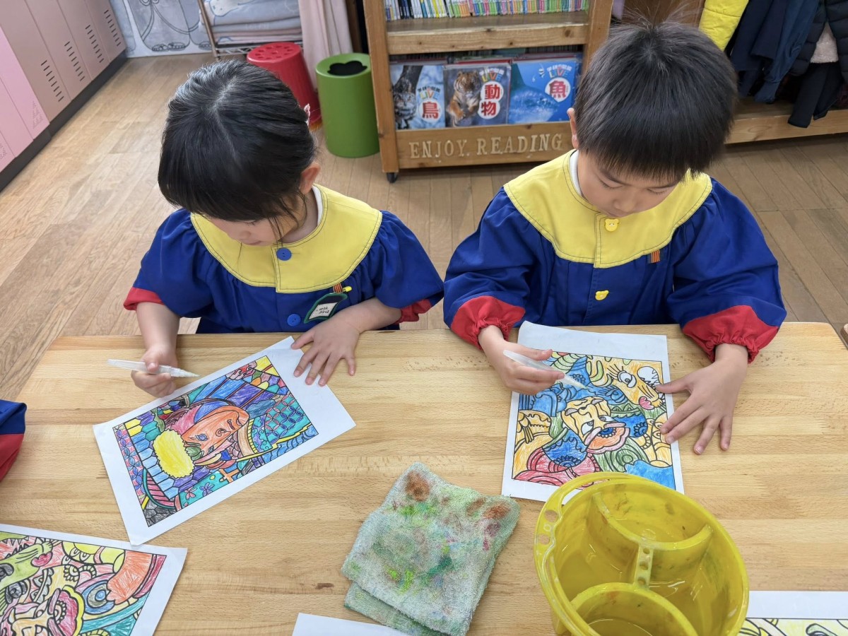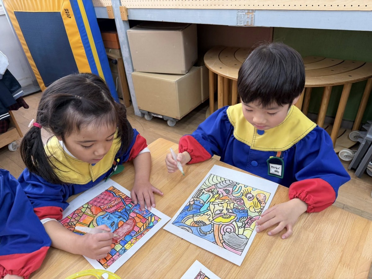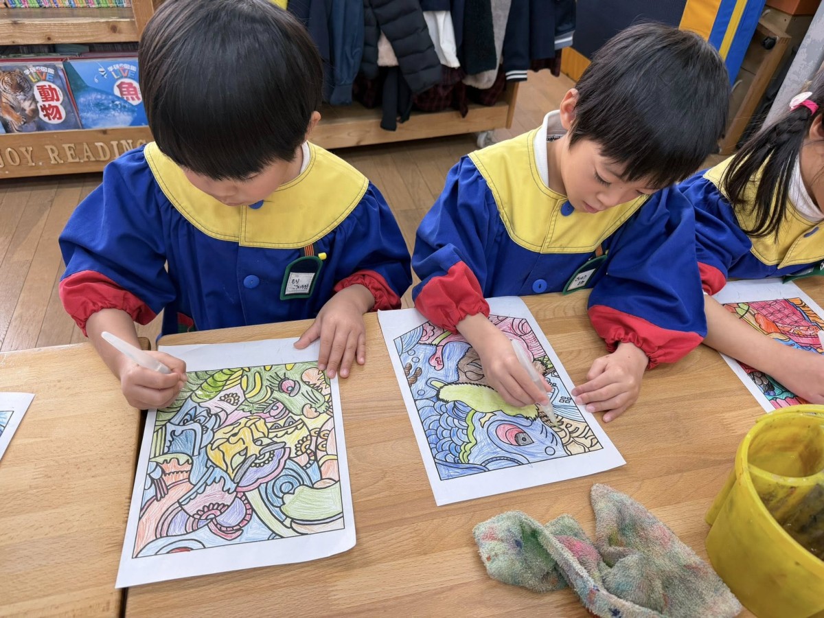 今日は色塗りをした凧に水筆をしました。丁寧に集中して取り組む姿が印象的でした。力強く色鉛筆で色付けをしたおかげか、綺麗に色がでていました。午後は園庭で遊びました。たっぷりと遊ぶことができて嬉しそうでした。