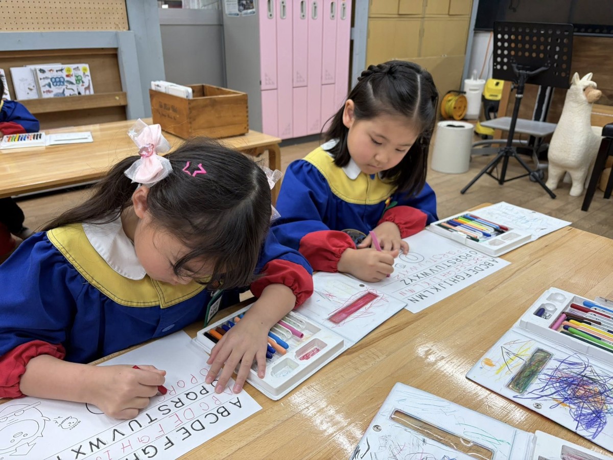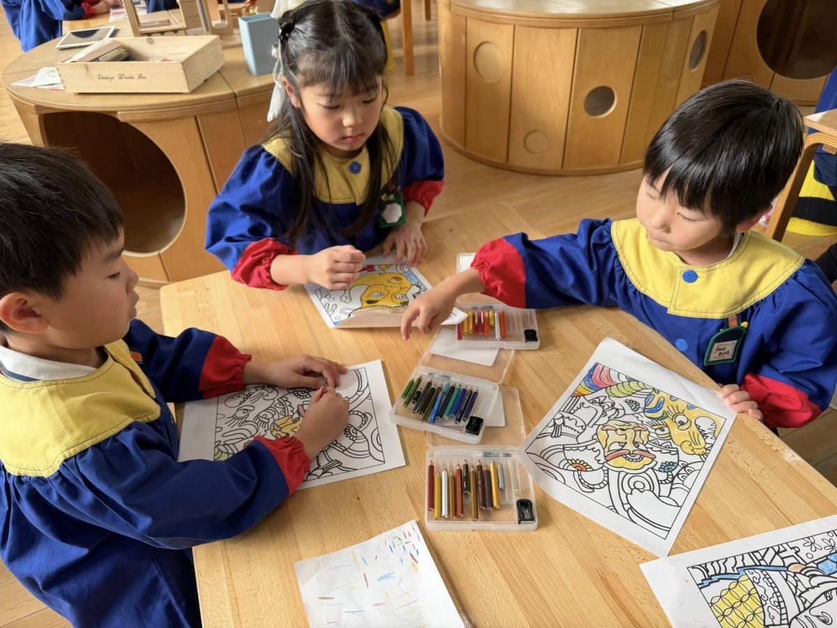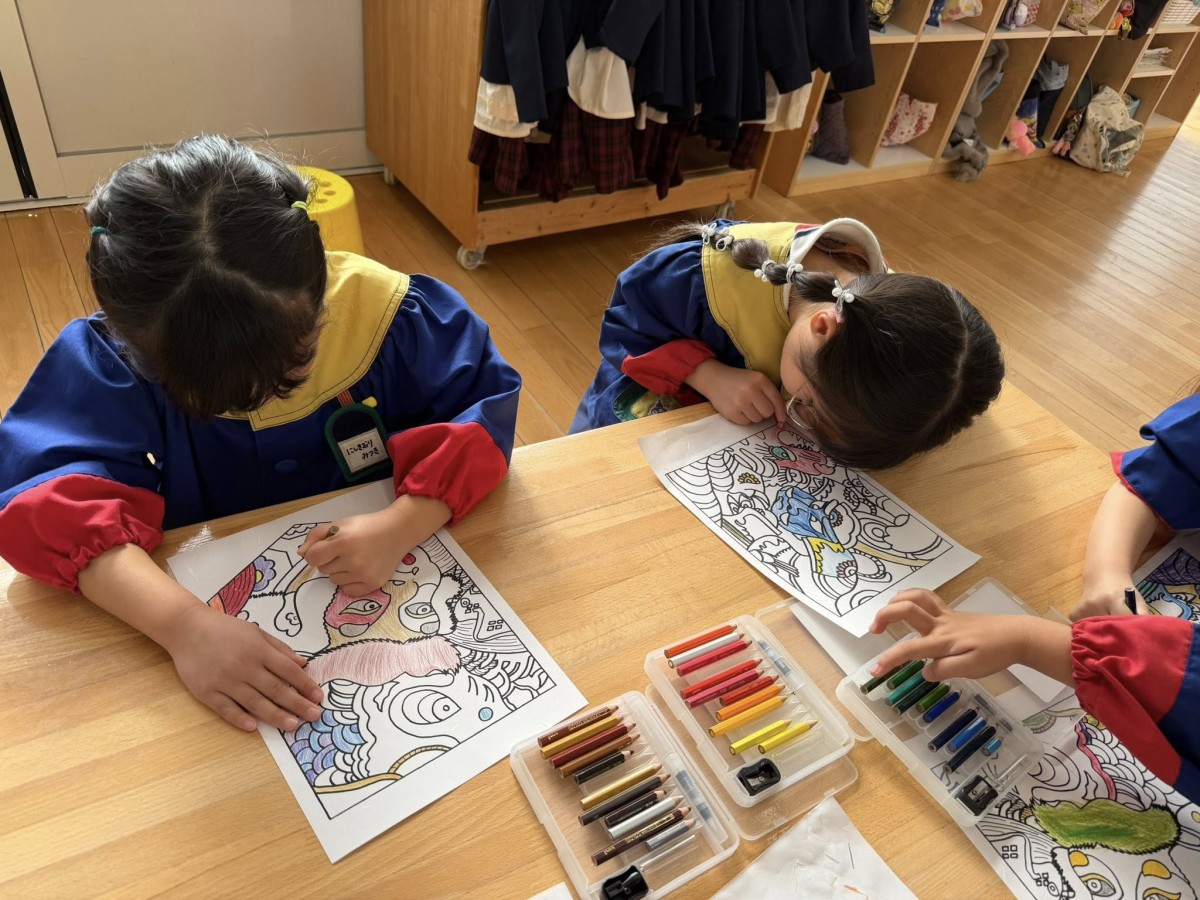 今日は色塗りをした凧に水筆をしました。丁寧に集中して取り組む姿が印象的でした。力強く色鉛筆で色付けをしたおかげか、綺麗に色がでていました。午後は園庭で遊びました。たっぷりと遊ぶことができて嬉しそうでした。