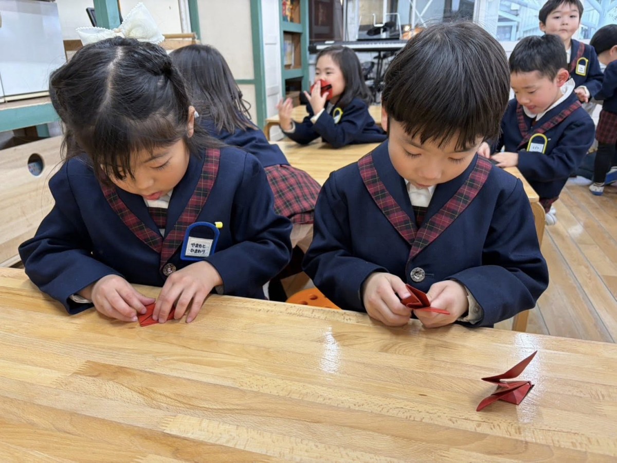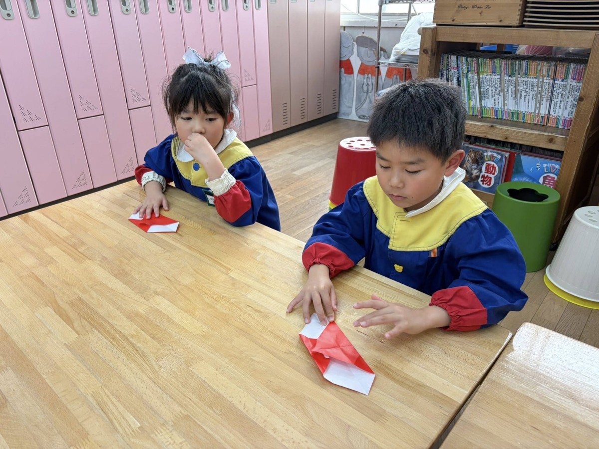 午前は英語教室でした。今年最後の英語でしたが、元気にケビン先生と楽しく活動できました!午後はお部屋で折り紙でサンタを折りました。「さんたさんきてくれるかな」とおしゃべりを楽しみながら丁寧に折っていました。