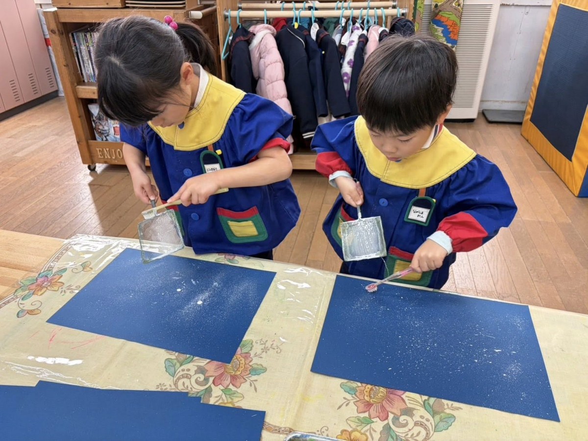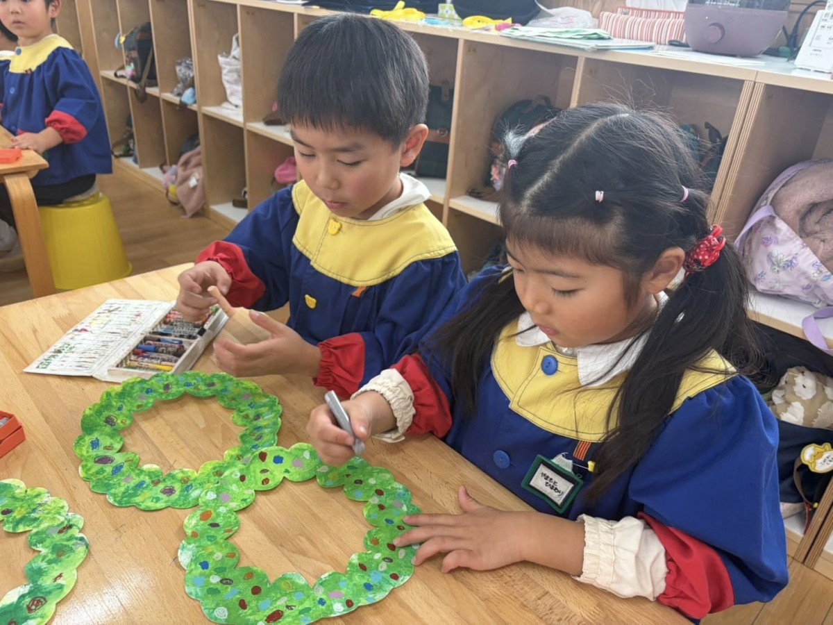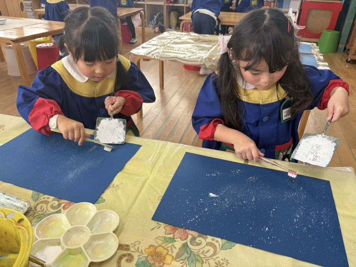 午前中は園庭で遊びました。お砂場でとっても大きなお山を作って見せてくれました。午後は、制作の続きをしました。スパッタリングで雪を表現し、リースには模様をつけました。可愛らしい作品ができそうです♪